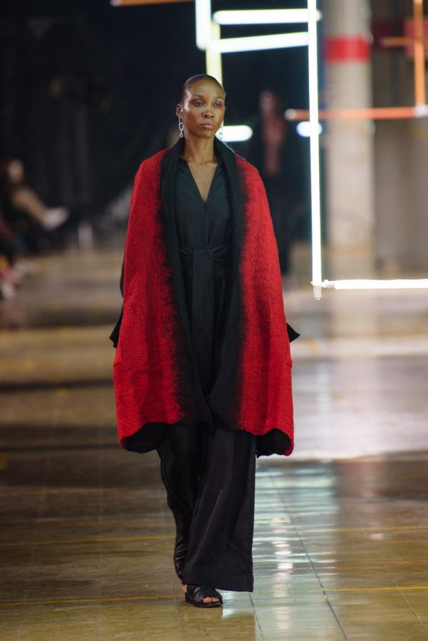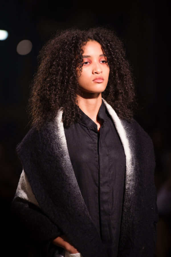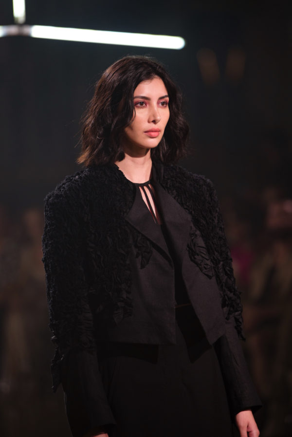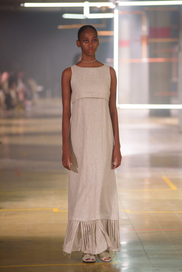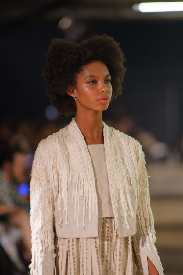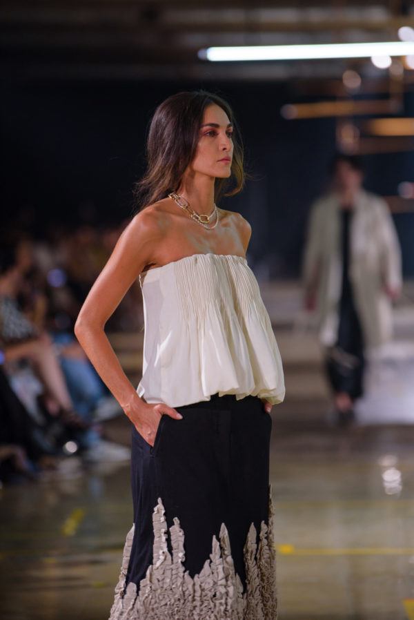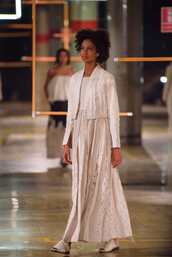The inaugural runway show included 30 outfits made from natural fibers such as linen, silk, alpaca, cotton, banana fiber, and fique stitches, and unique details like ceramic buttons from La Chamba. These pieces were the result of a meticulous conceptualization and manufacturing process that took nearly two years of work, reflecting the dedication and attention to detail that have always characterized A New Cross since its inception.