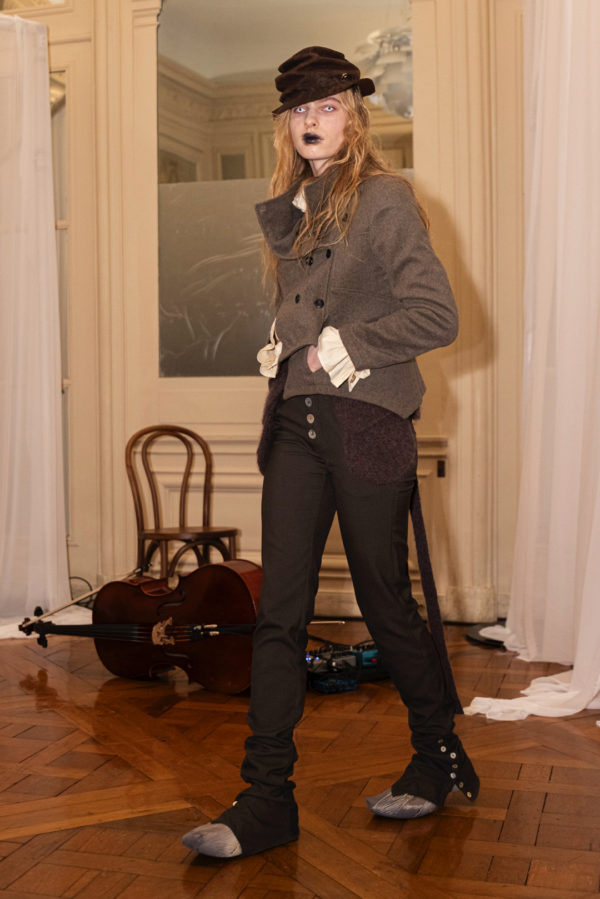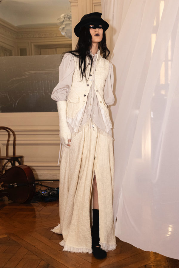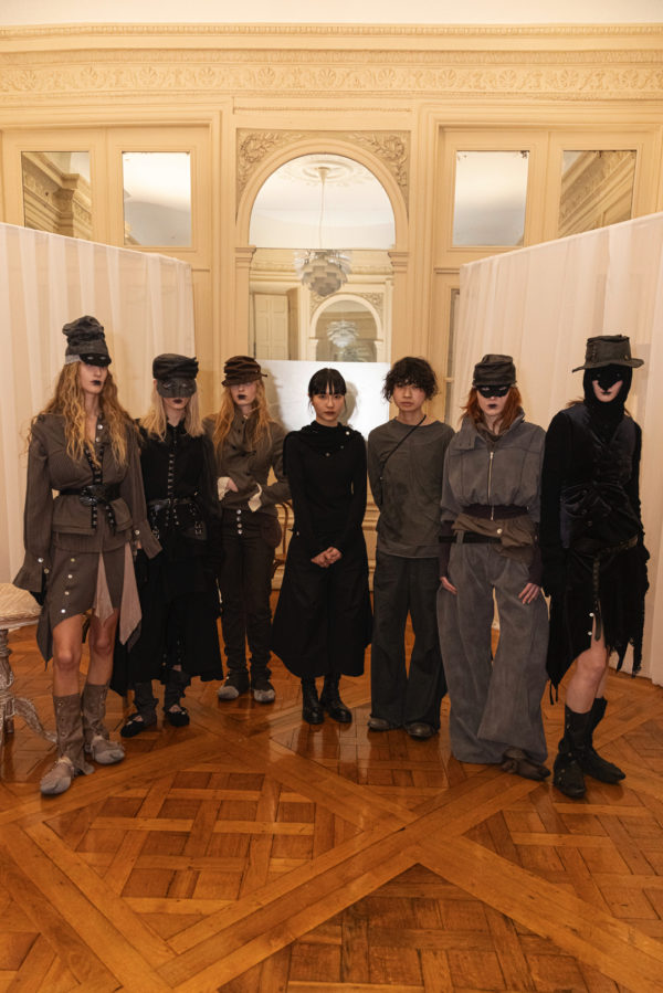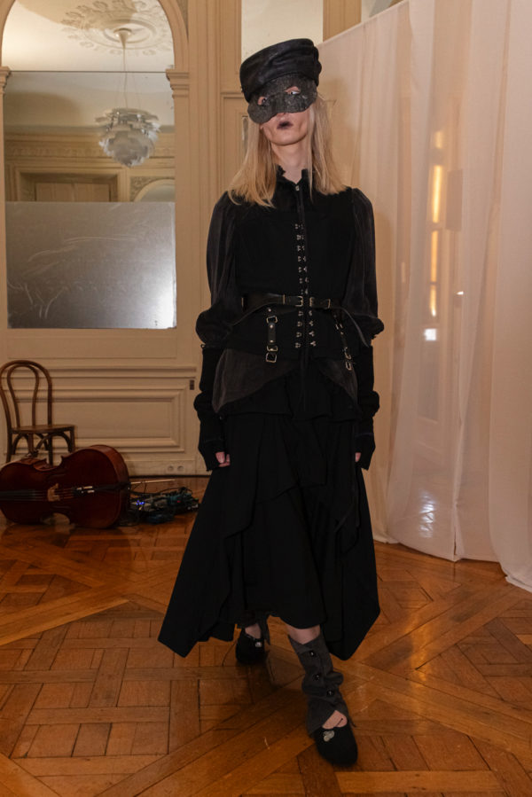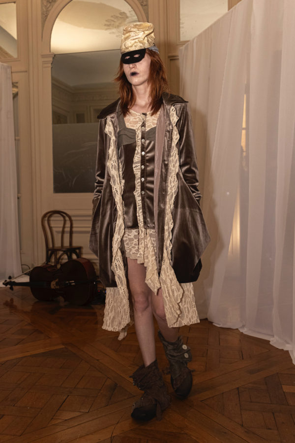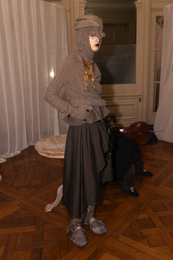 Silhouettes referenced elements of medieval armor, including protective hoods and structured headpieces that suggested clothing as both shield and marker of identity. Wax finishing was applied to fabrics to create the impression of suspended time, as if garments had been preserved in a frozen state between past and present. Surfaces appeared simultaneously rigid and vulnerable, reinforcing the tension between protection and exposure that runs through the collection.