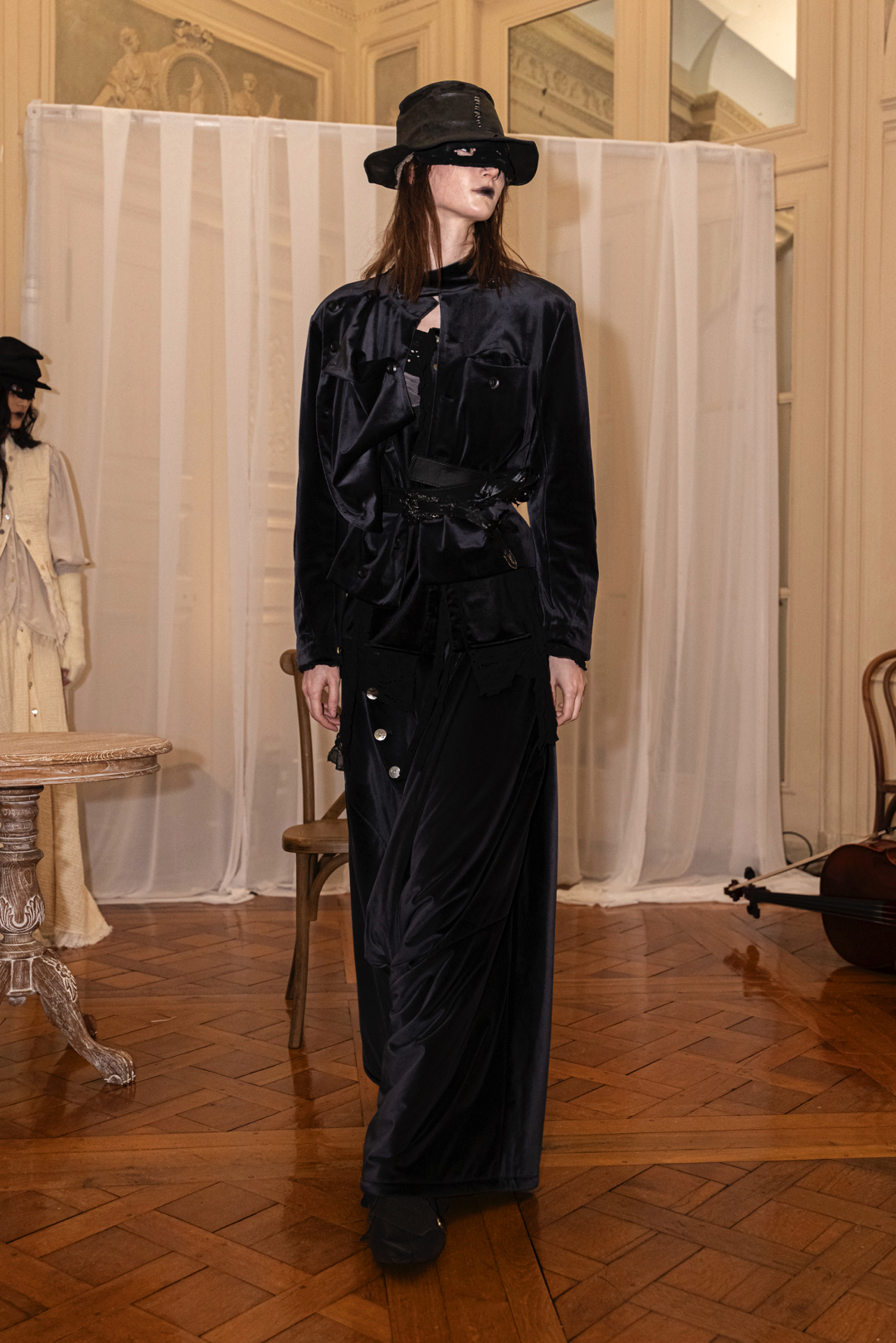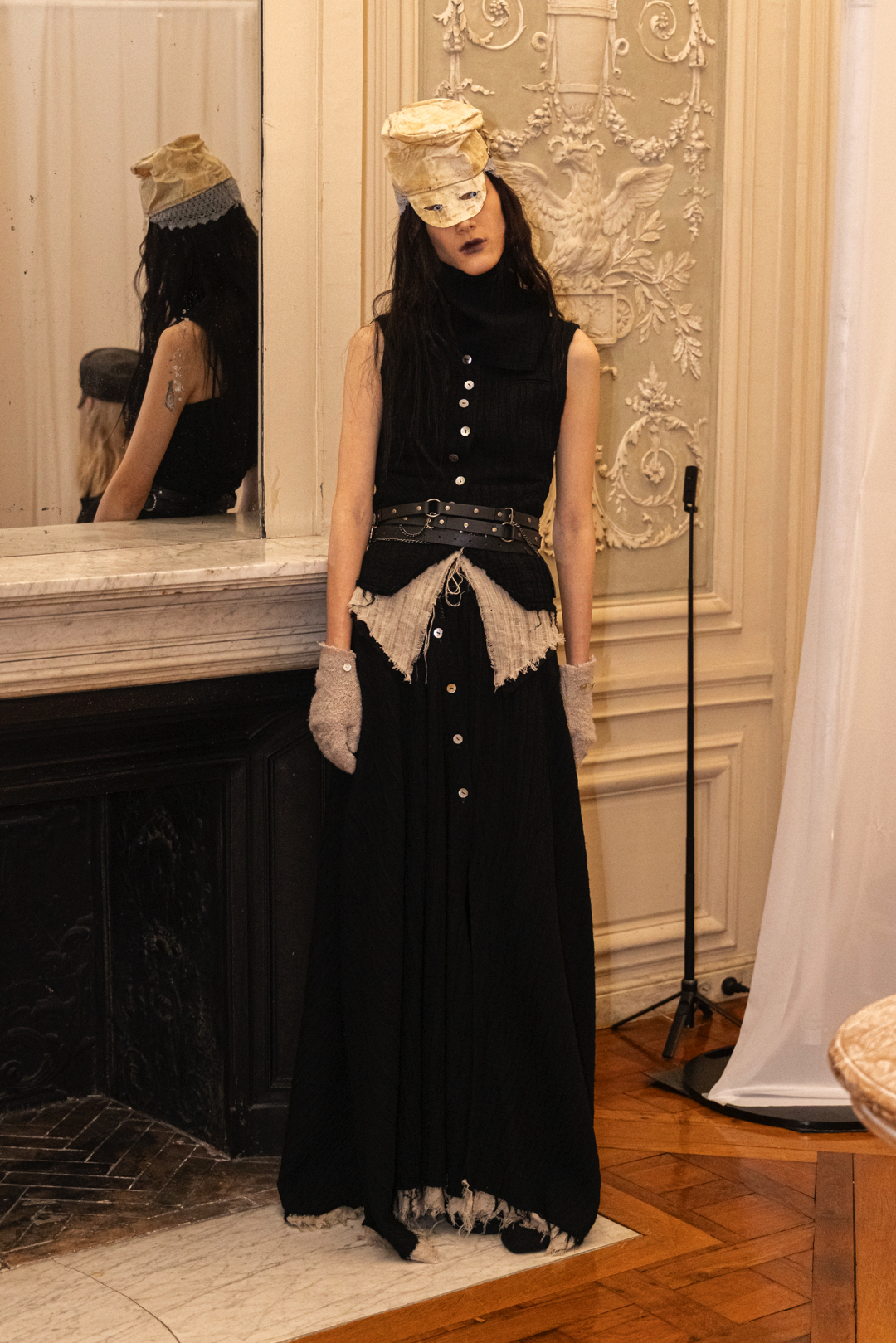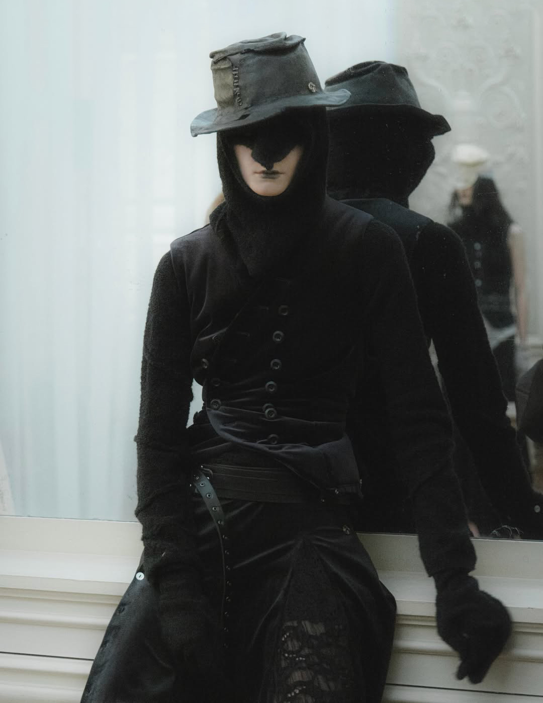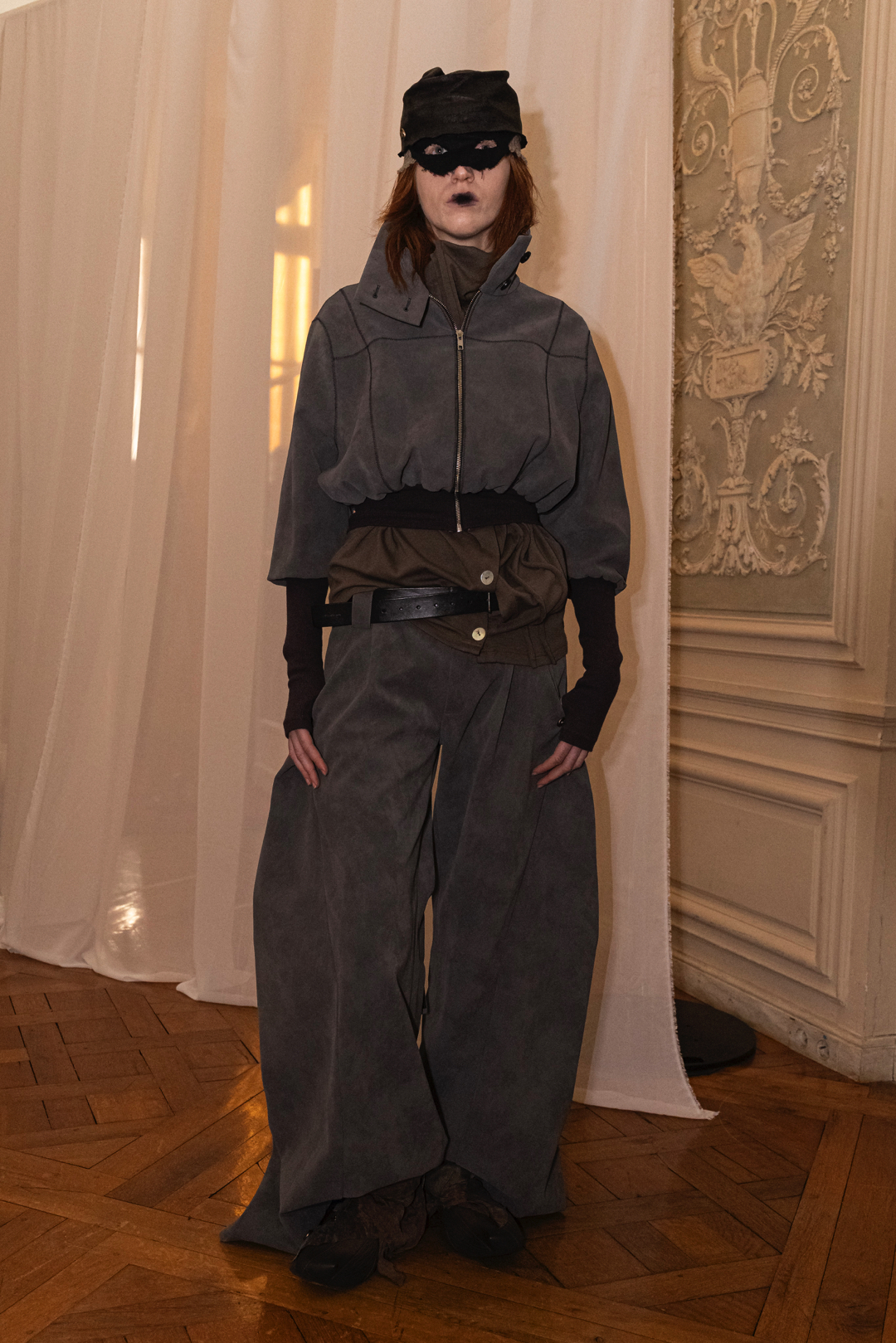 Silhouettes referenced elements of medieval armor, including protective hoods and structured headpieces that suggested clothing as both shield and marker of identity. Wax finishing was applied to fabrics to create the impression of suspended time, as if garments had been preserved in a frozen state between past and present. Surfaces appeared simultaneously rigid and vulnerable, reinforcing the tension between protection and exposure that runs through the collection.