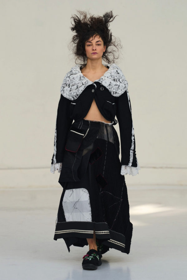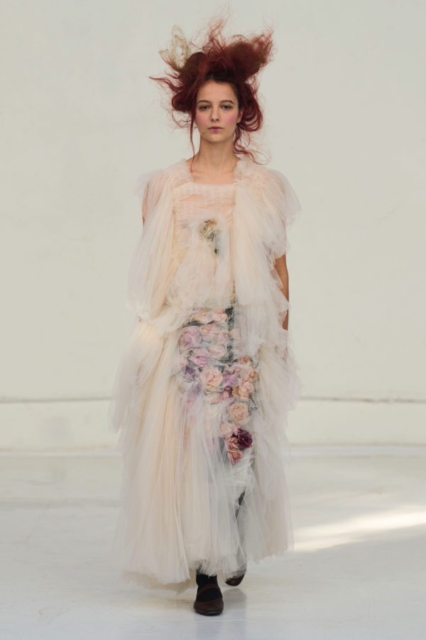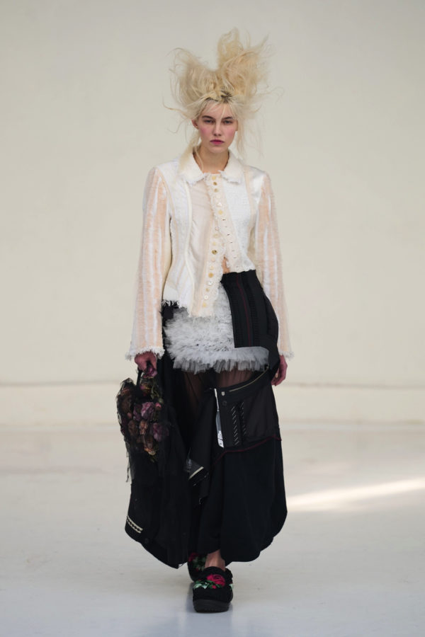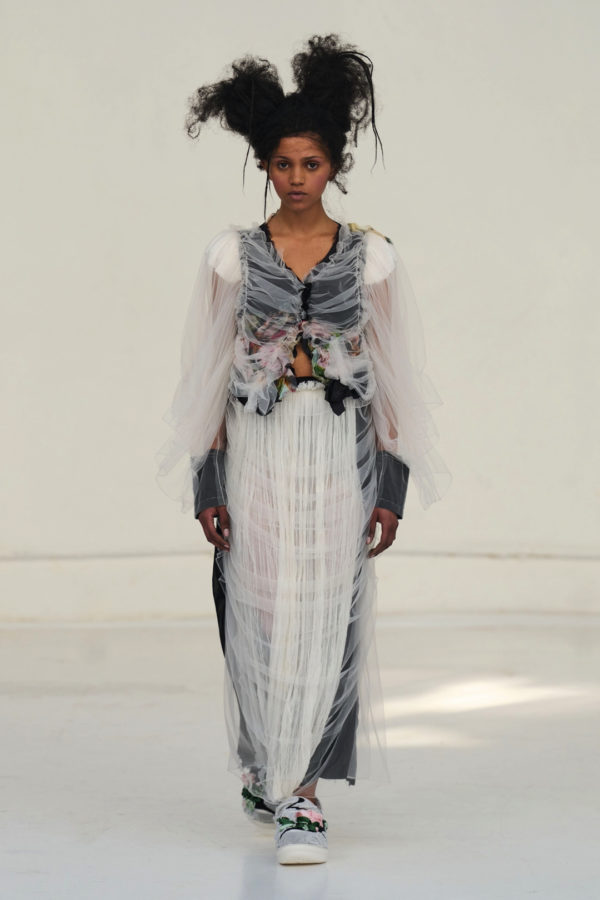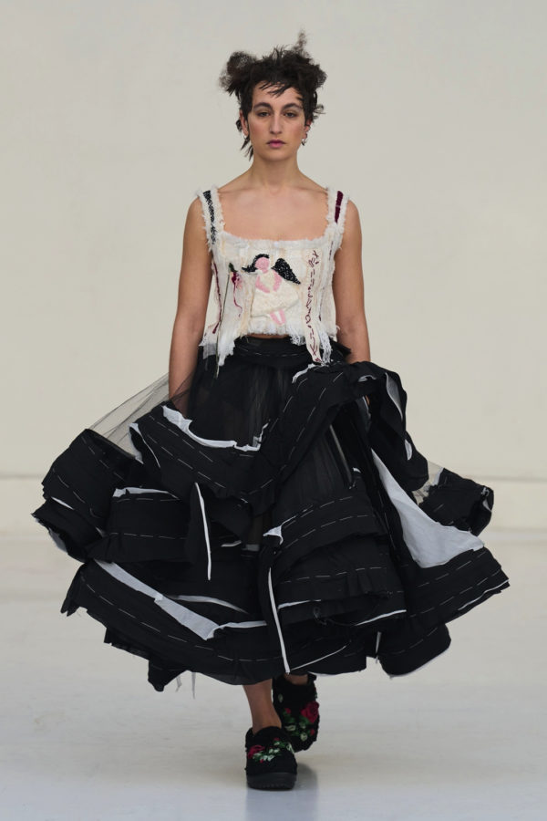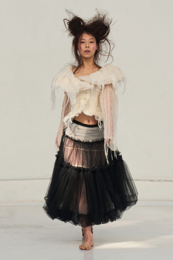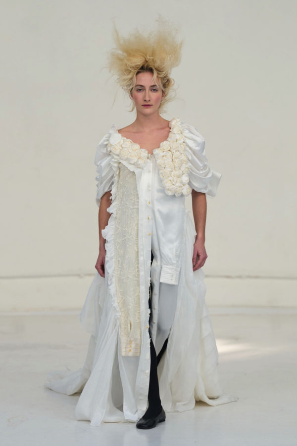 The collection unfolded as a meditation on attachment and fragility. Hu described its atmosphere as something close to nostalgia, yet the sentiment was not expressed through literal historicism. Instead, the garments suggested memory through construction. Delicate cotton meshes appeared hand-frayed, surfaces were layered with silicone-coated faux flowers shrouded in tulle, and multiple fabrics coexisted within single garments in intricate textile collages. Lace, silk, and cotton were assembled into compositions that evoked historical dress, particularly the loosened intimacy of eighteenth-century French undress, without becoming pastiche.