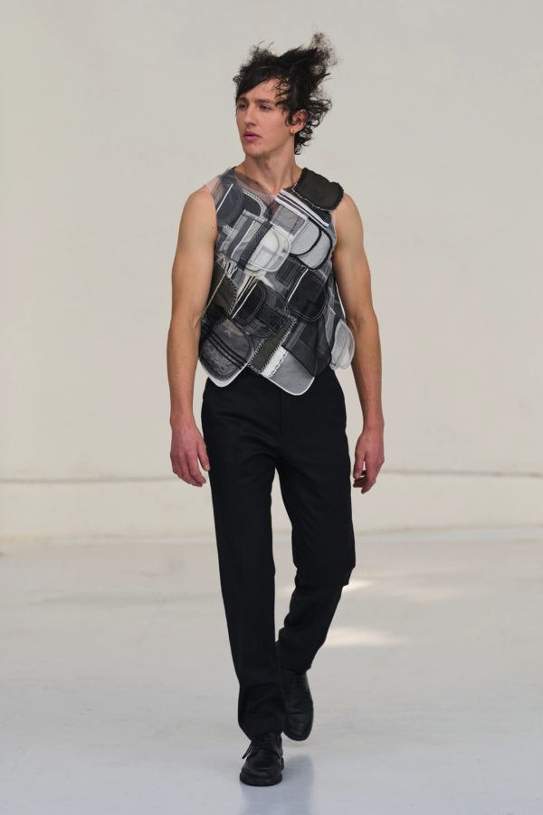 Presentation played an equally important role. Rather than a conventional runway populated by models, Hu invited dancers to inhabit the garments, guided by performances from Emma Porter and Matt McCreary. Their choreography moved fluidly through the space, allowing the layered fabrics to sway and shift in motion. The result blurred the boundary between fashion show and performance, emphasizing the garments as living forms activated by the body rather than static objects to be observed.