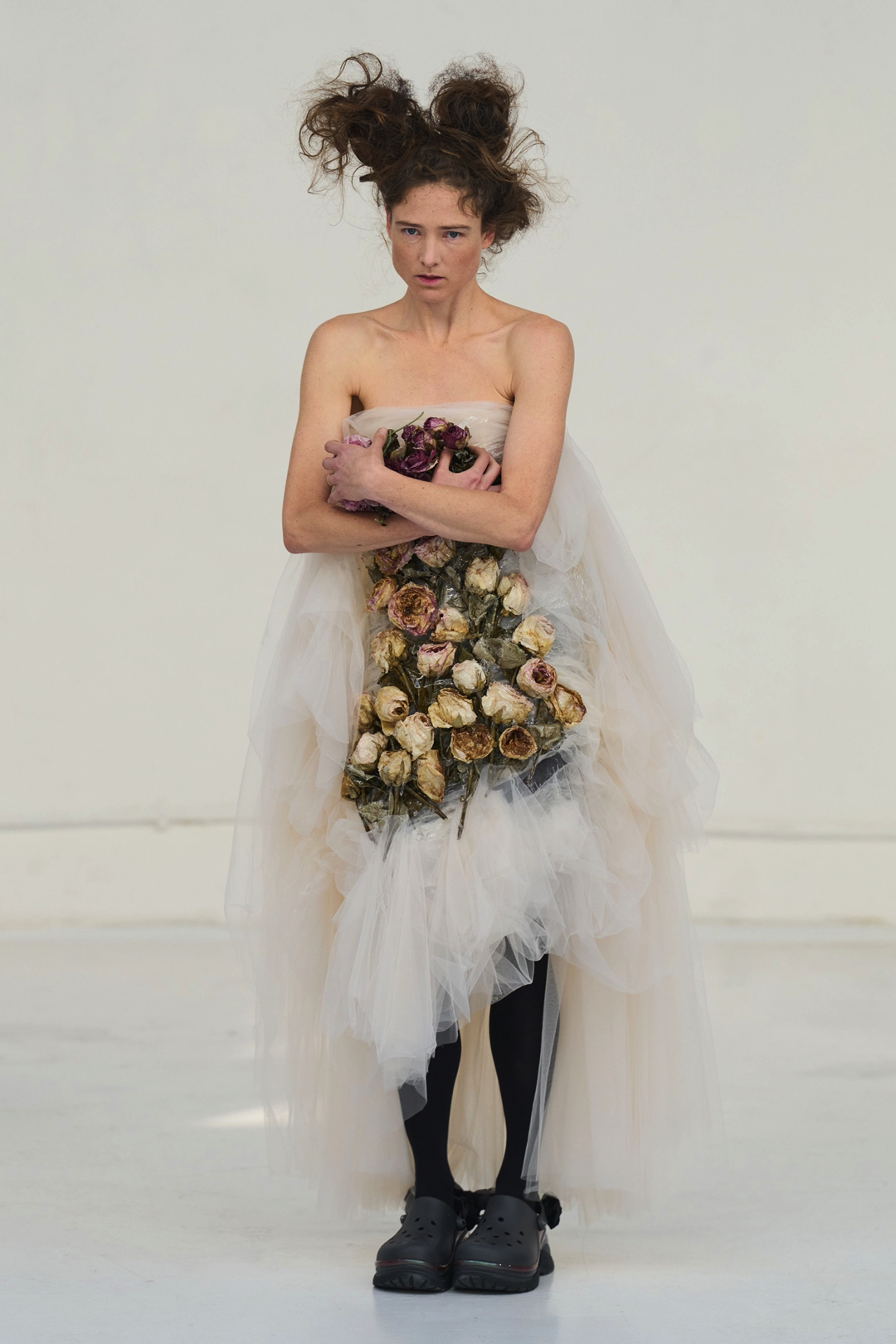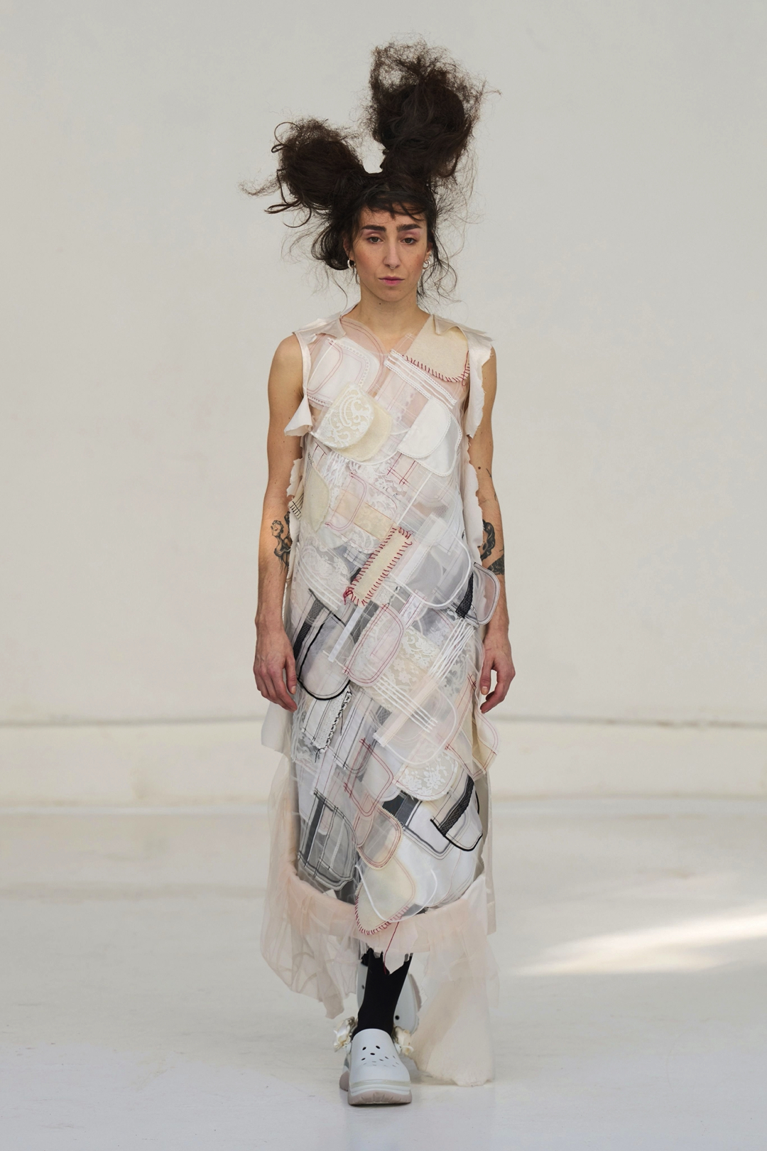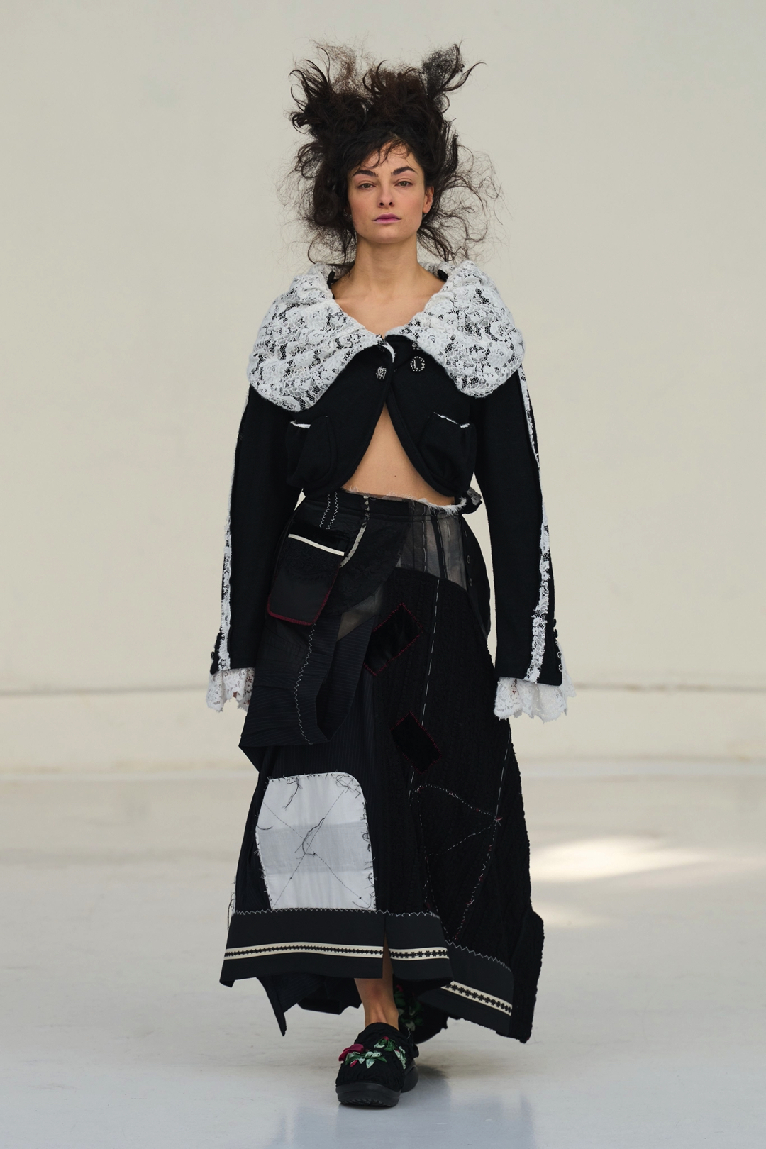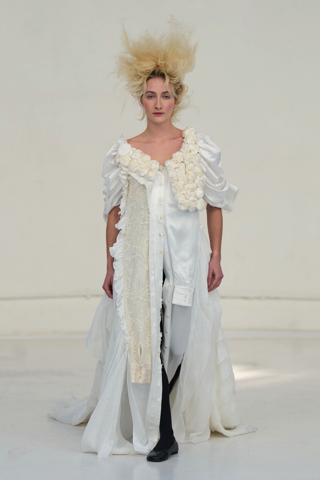 The collection unfolded as a meditation on attachment and fragility. Hu described its atmosphere as something close to nostalgia, yet the sentiment was not expressed through literal historicism. Instead, the garments suggested memory through construction. Delicate cotton meshes appeared hand-frayed, surfaces were layered with silicone-coated faux flowers shrouded in tulle, and multiple fabrics coexisted within single garments in intricate textile collages. Lace, silk, and cotton were assembled into compositions that evoked historical dress, particularly the loosened intimacy of eighteenth-century French undress, without becoming pastiche.