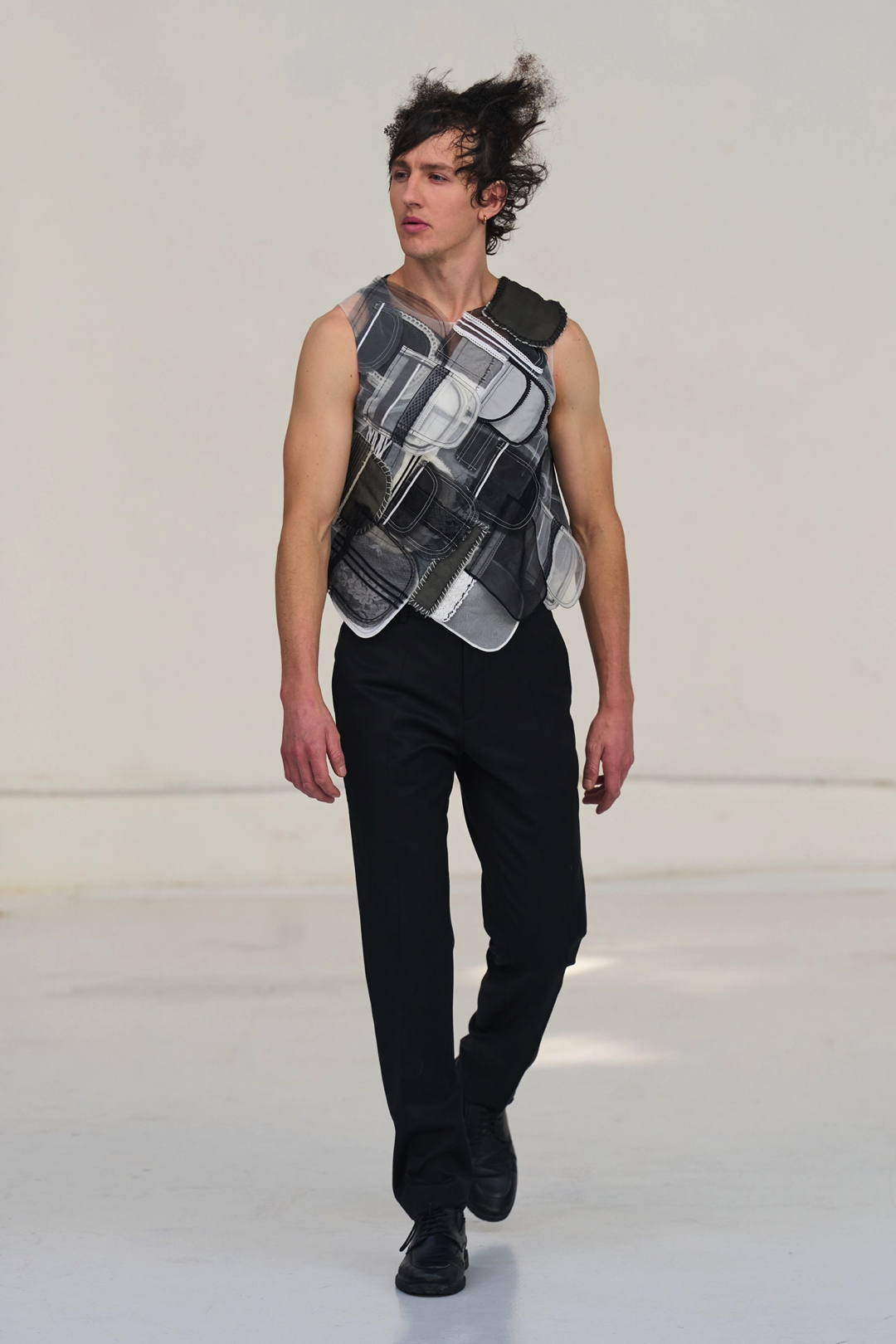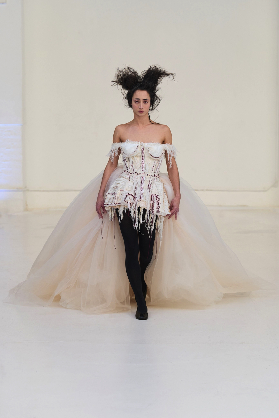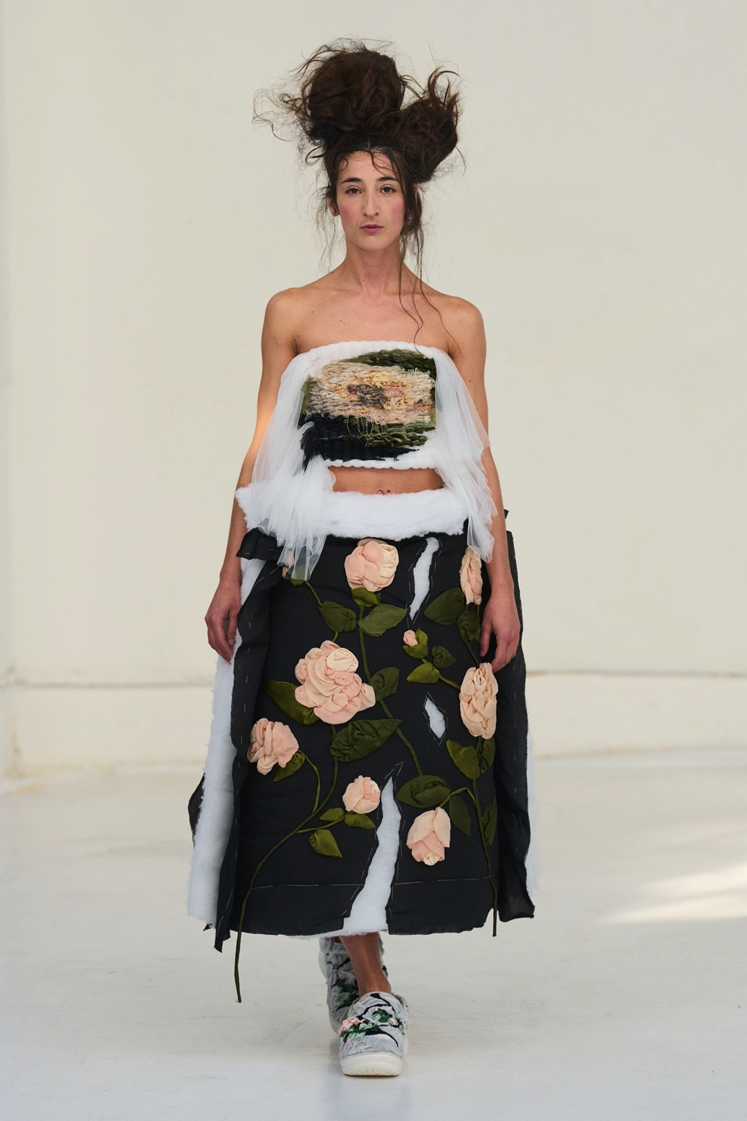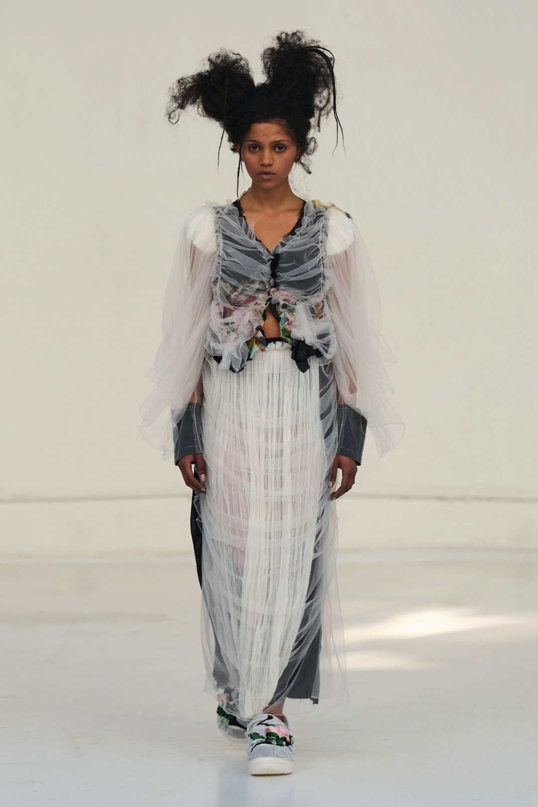 The collection unfolded as a meditation on attachment and fragility. Hu described its atmosphere as something close to nostalgia, yet the sentiment was not expressed through literal historicism. Instead, the garments suggested memory through construction. Delicate cotton meshes appeared hand-frayed, surfaces were layered with silicone-coated faux flowers shrouded in tulle, and multiple fabrics coexisted within single garments in intricate textile collages. Lace, silk, and cotton were assembled into compositions that evoked historical dress, particularly the loosened intimacy of eighteenth-century French undress, without becoming pastiche.