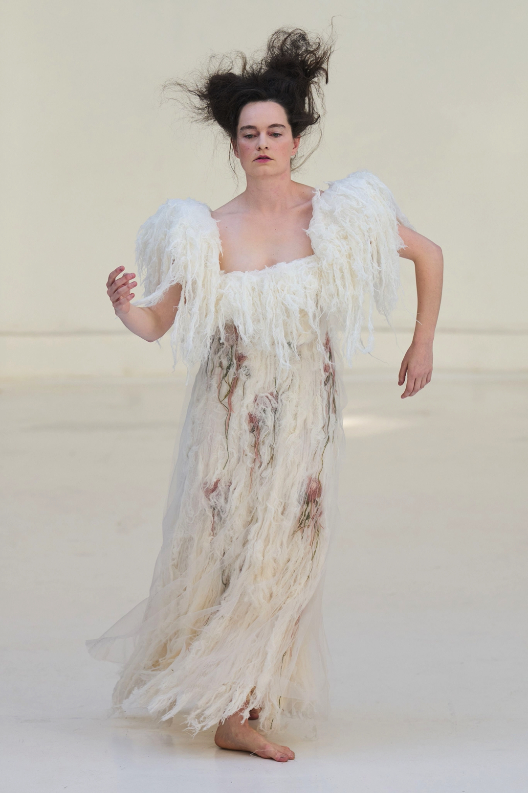 Presentation played an equally important role. Rather than a conventional runway populated by models, Hu invited dancers to inhabit the garments, guided by performances from Emma Porter and Matt McCreary. Their choreography moved fluidly through the space, allowing the layered fabrics to sway and shift in motion. The result blurred the boundary between fashion show and performance, emphasizing the garments as living forms activated by the body rather than static objects to be observed.