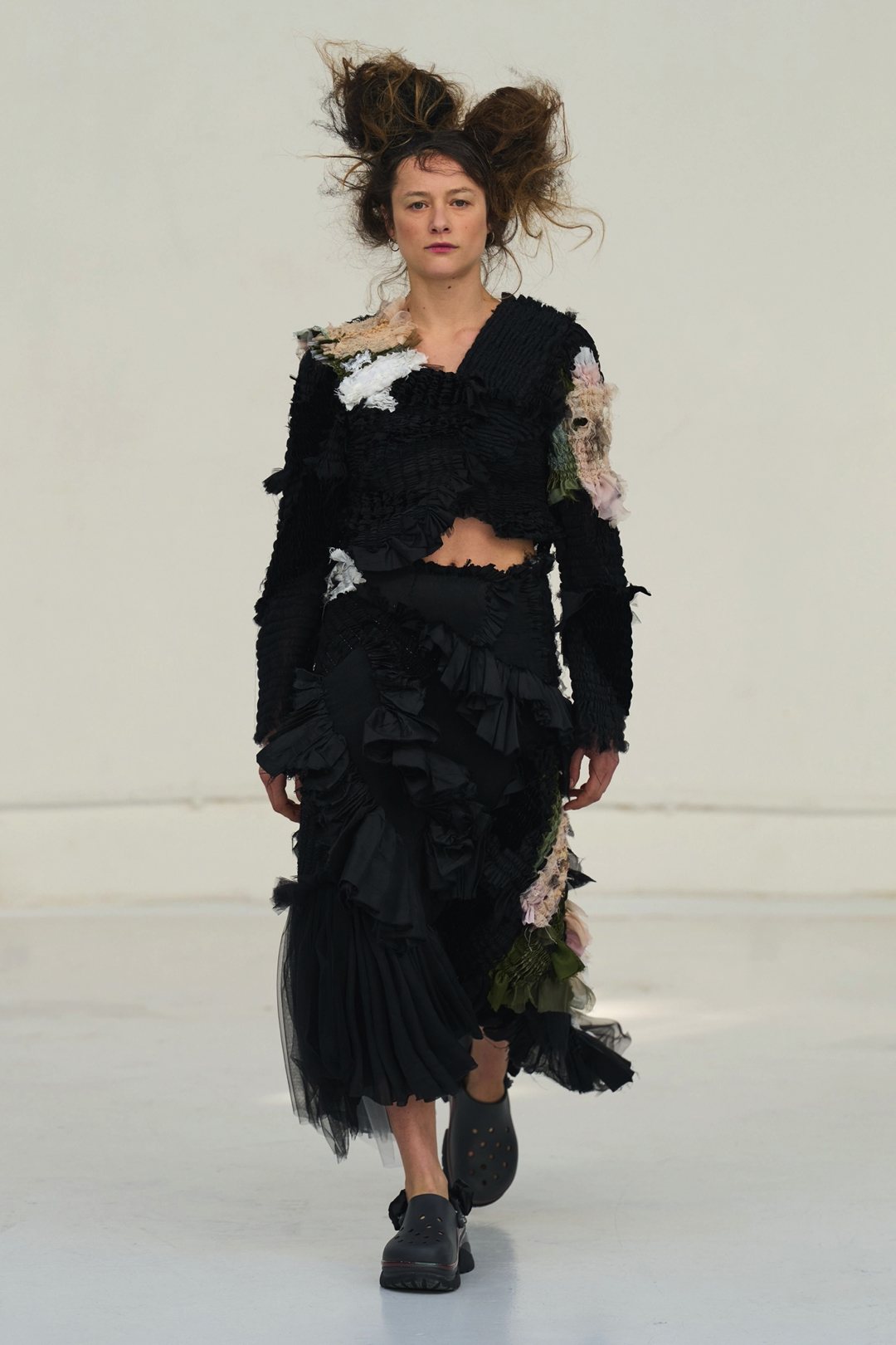 Even the footwear participated in this softening of conventions. Collaborating with Crocs, Hu reimagined the familiar Bae Clog with custom knitted uppers and silk ribbon flowers, transforming a form typically associated with casual utility into something unexpectedly romantic. The gesture encapsulated the collection’s broader strategy of taking ordinary objects and reframing them through tenderness and craft.