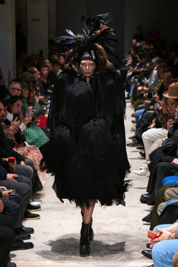 The show began with an uncompromising proposition: black. One after another, sixteen silhouettes appeared in absolute darkness, establishing the conceptual ground of the collection before any variation could intervene. For Rei Kawakubo, black has long functioned not simply as a color but as a territory, one capable of absorbing contradiction, density, and abstraction. This season approached it with renewed concentration.