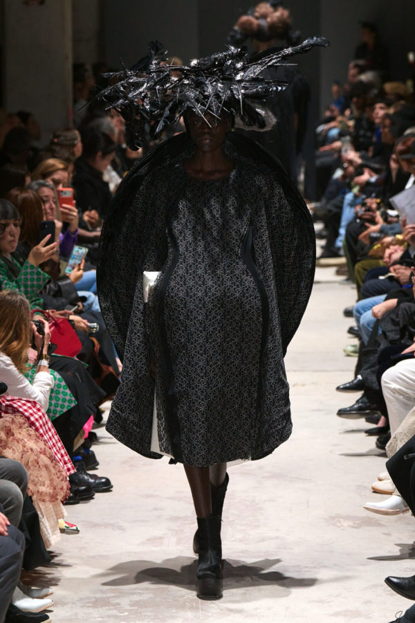 Kawakubo’s note for the season reflected on black as the color that holds the greatest meaning. It evokes the rebellious spirit, the universe, and the black hole. Within that framework the collection suggested garments pulled by an invisible gravity. Their weight, density, and exaggerated scale created the impression of matter collapsing inward while simultaneously expanding outward.