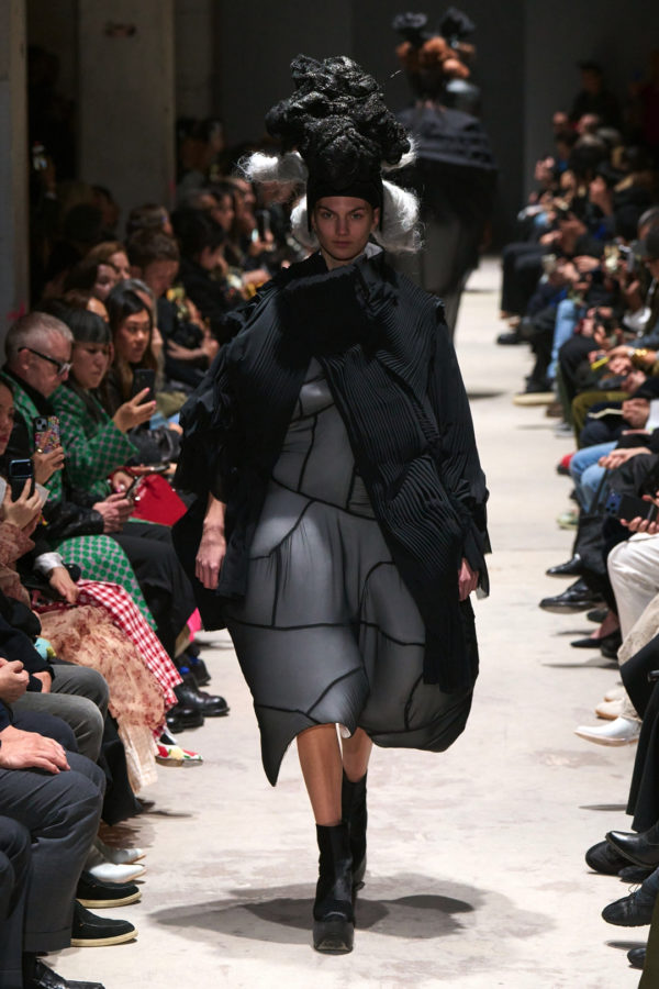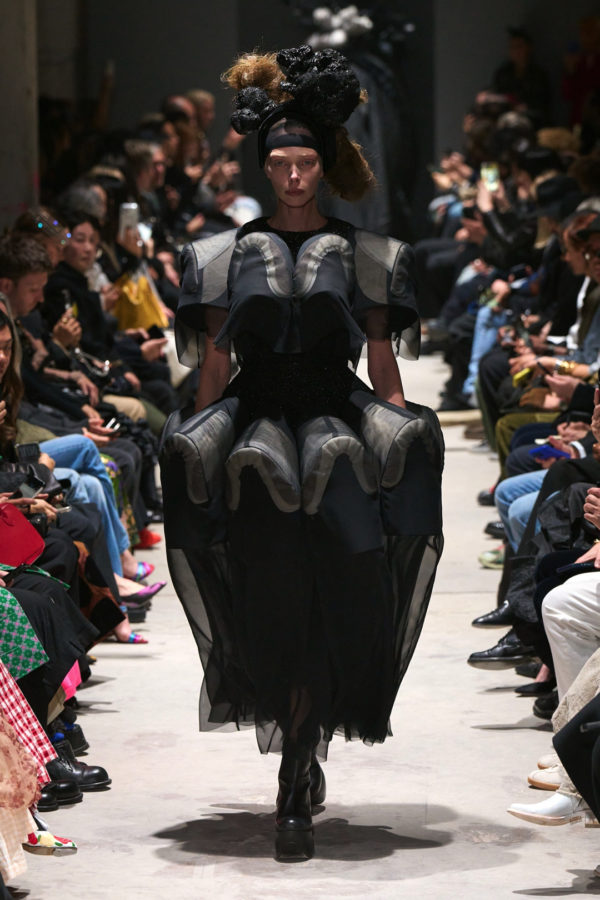 The garments expanded outward in monumental volumes. Dresses and coats unfolded as large sculptural envelopes, their breadth sometimes so exaggerated that the runway itself seemed barely wide enough to contain them. Yet within this mass the surfaces were far from uniform. Kawakubo inserted intricate disruptions. Shirring gathered fabric into irregular topographies, ruched seams distorted the geometry of the silhouettes, and layered tulle introduced fragile textures against the severity of black wool and structured textiles.