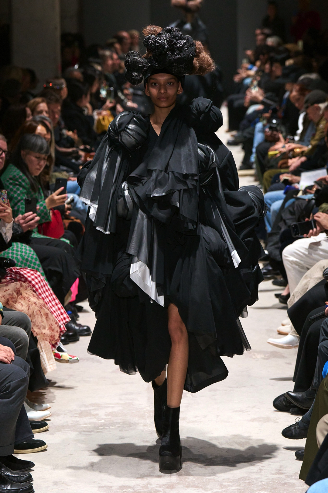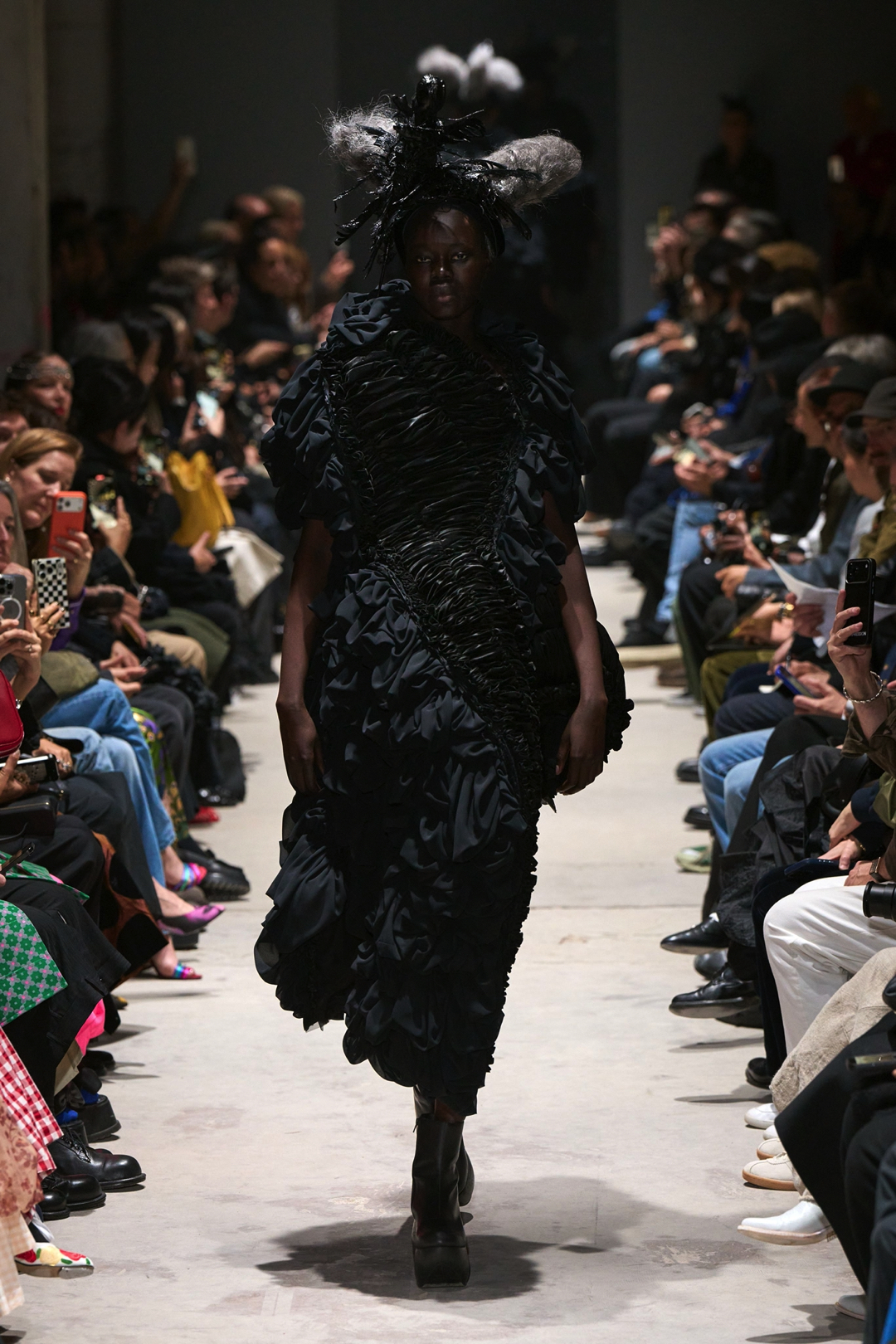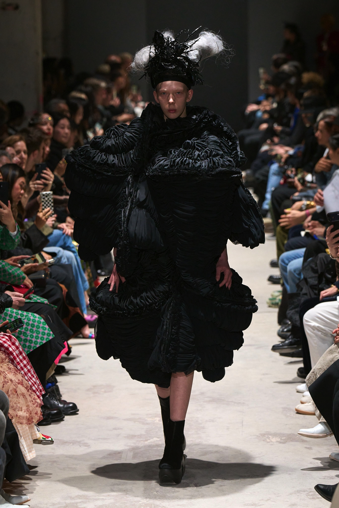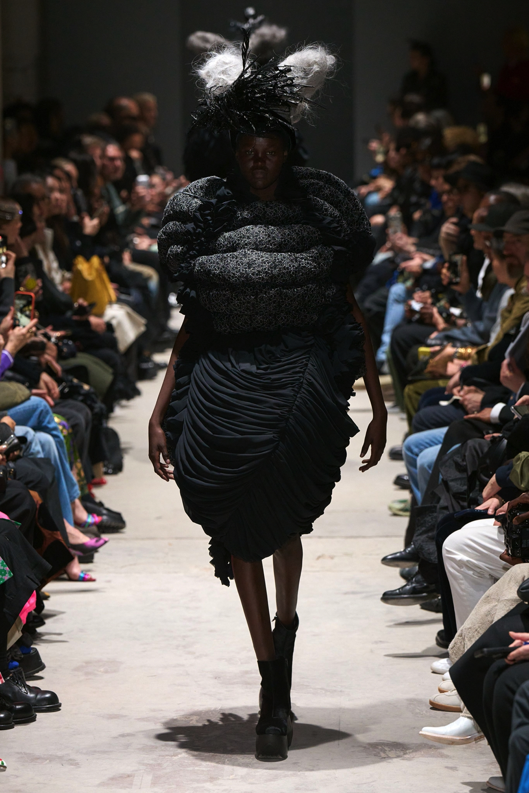 The garments expanded outward in monumental volumes. Dresses and coats unfolded as large sculptural envelopes, their breadth sometimes so exaggerated that the runway itself seemed barely wide enough to contain them. Yet within this mass the surfaces were far from uniform. Kawakubo inserted intricate disruptions. Shirring gathered fabric into irregular topographies, ruched seams distorted the geometry of the silhouettes, and layered tulle introduced fragile textures against the severity of black wool and structured textiles.