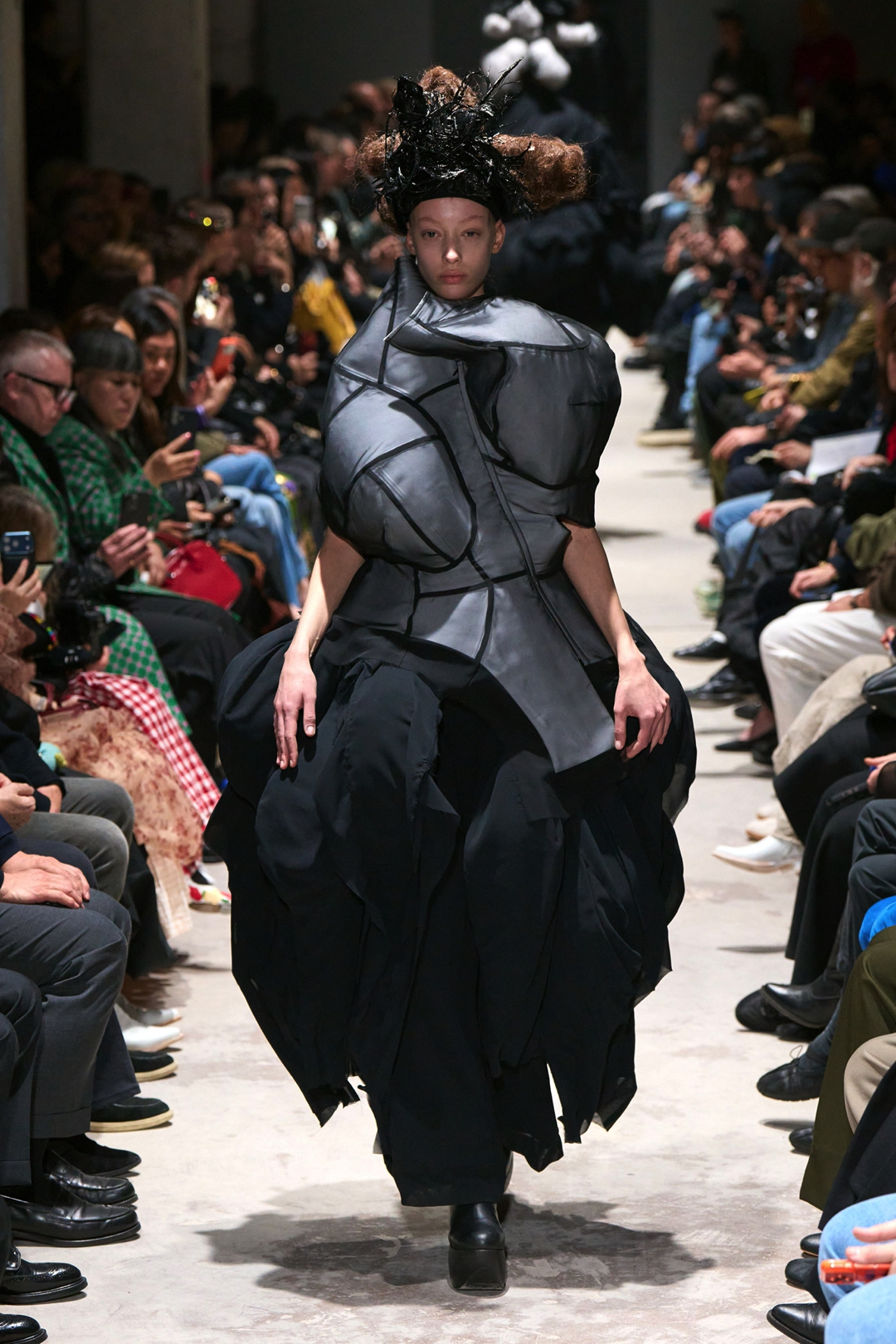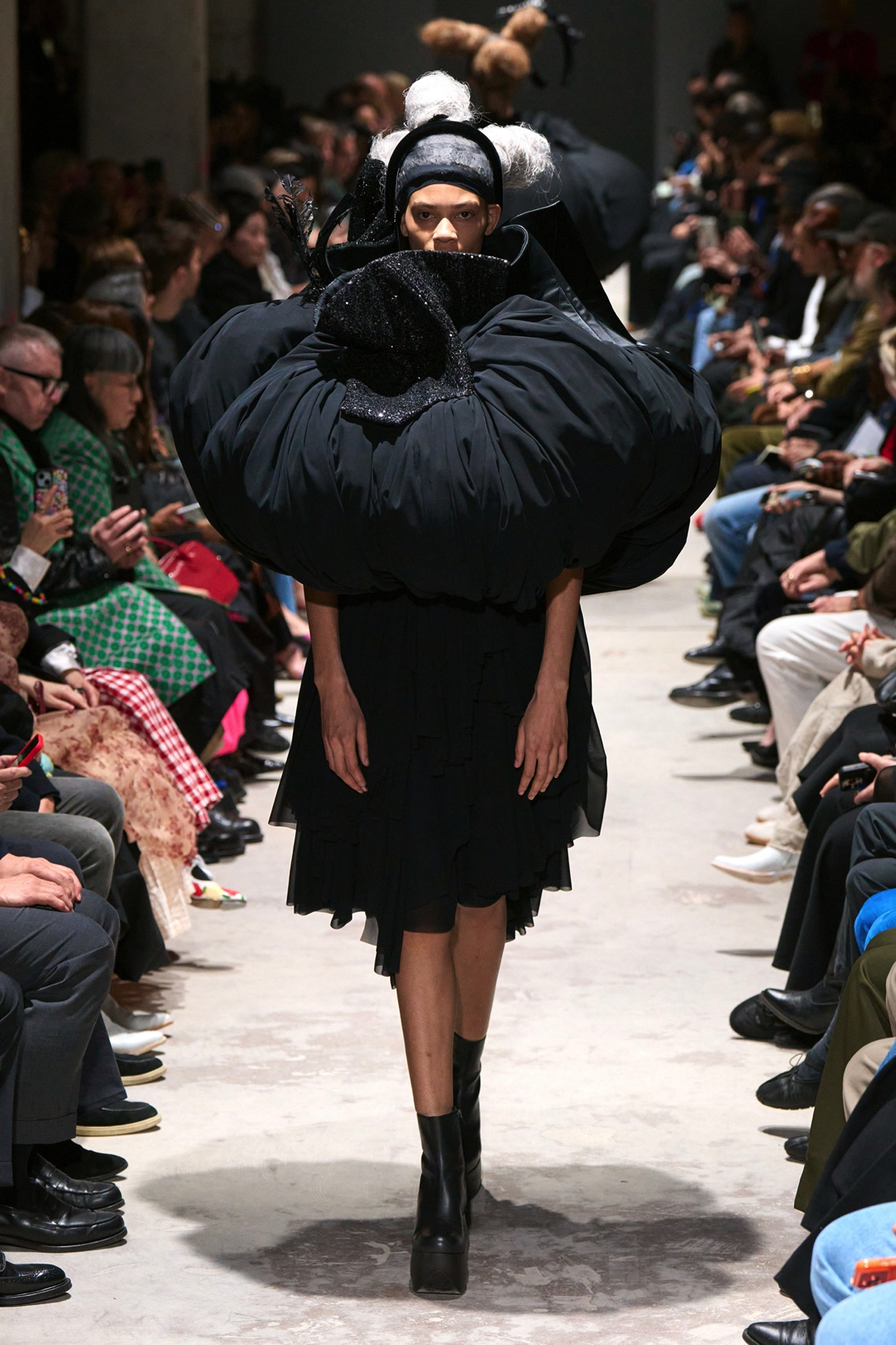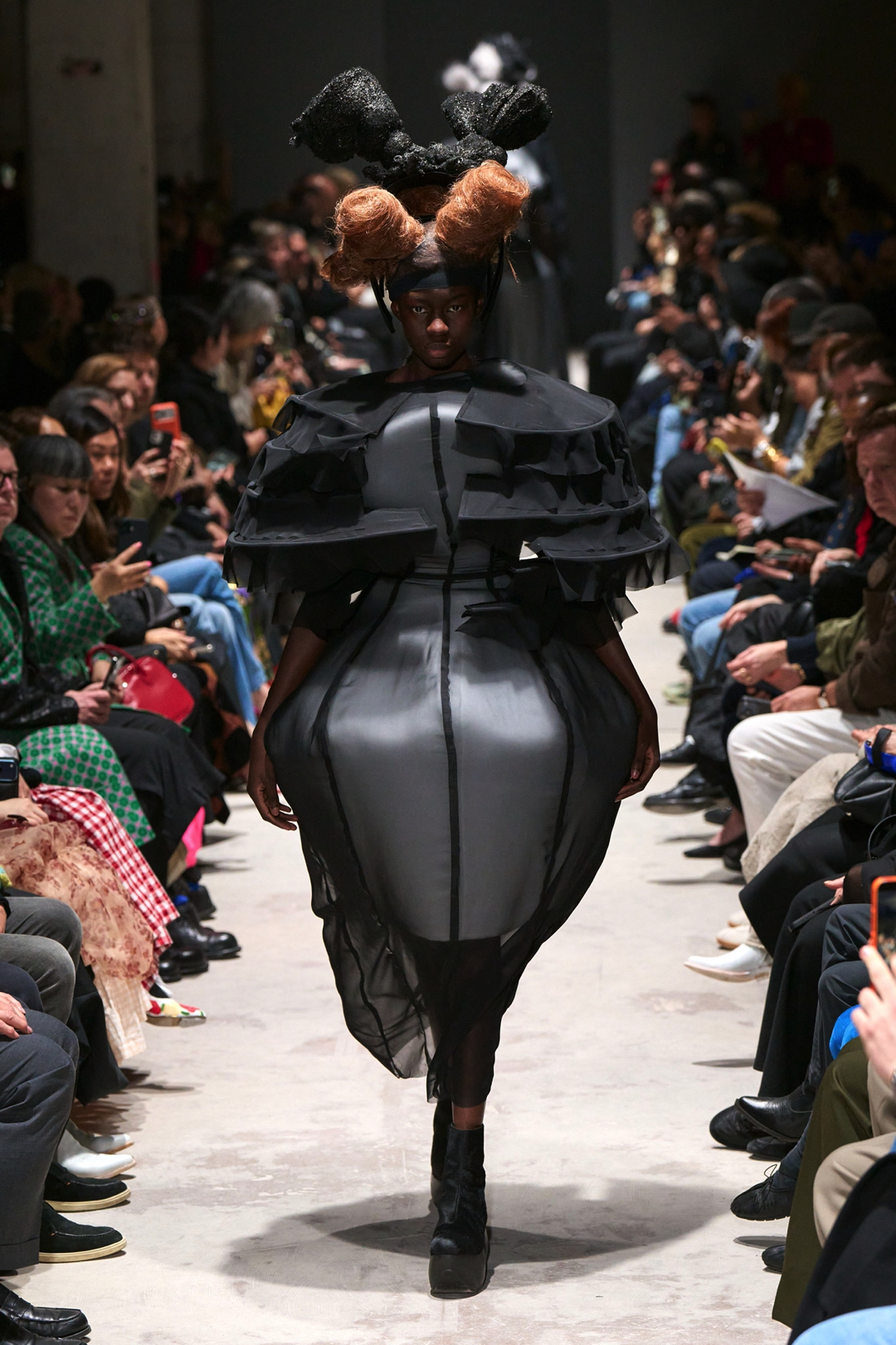 The garments expanded outward in monumental volumes. Dresses and coats unfolded as large sculptural envelopes, their breadth sometimes so exaggerated that the runway itself seemed barely wide enough to contain them. Yet within this mass the surfaces were far from uniform. Kawakubo inserted intricate disruptions. Shirring gathered fabric into irregular topographies, ruched seams distorted the geometry of the silhouettes, and layered tulle introduced fragile textures against the severity of black wool and structured textiles.