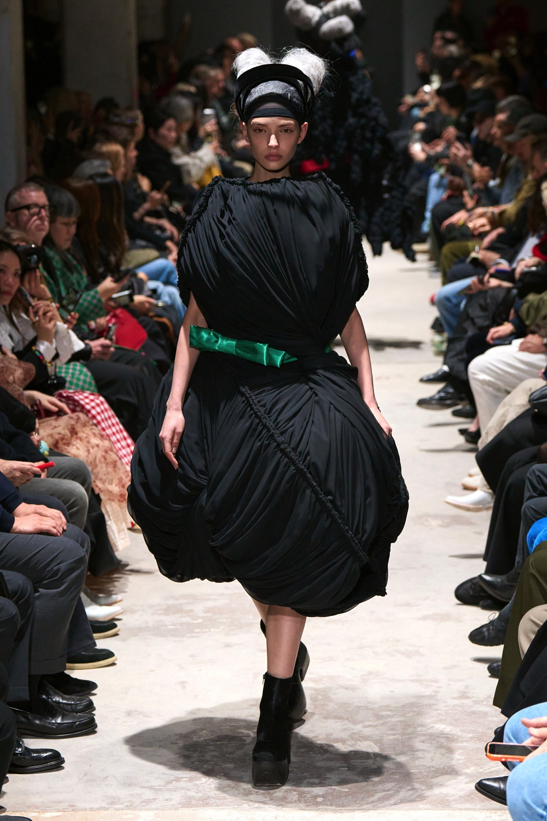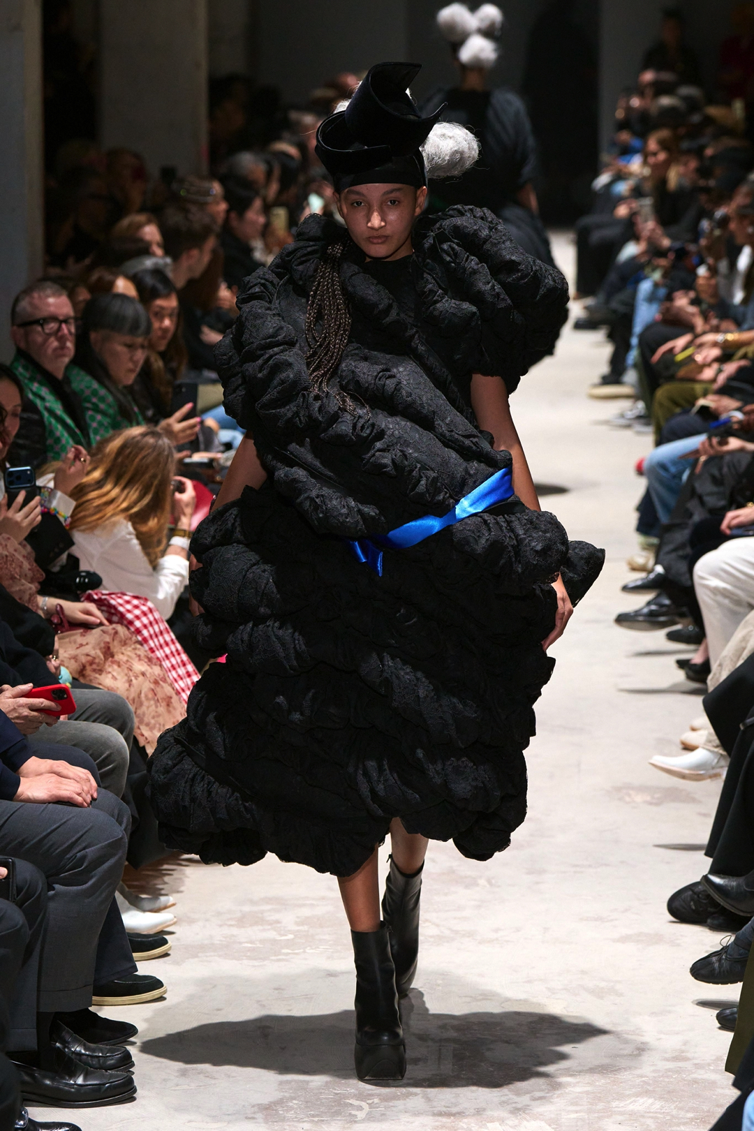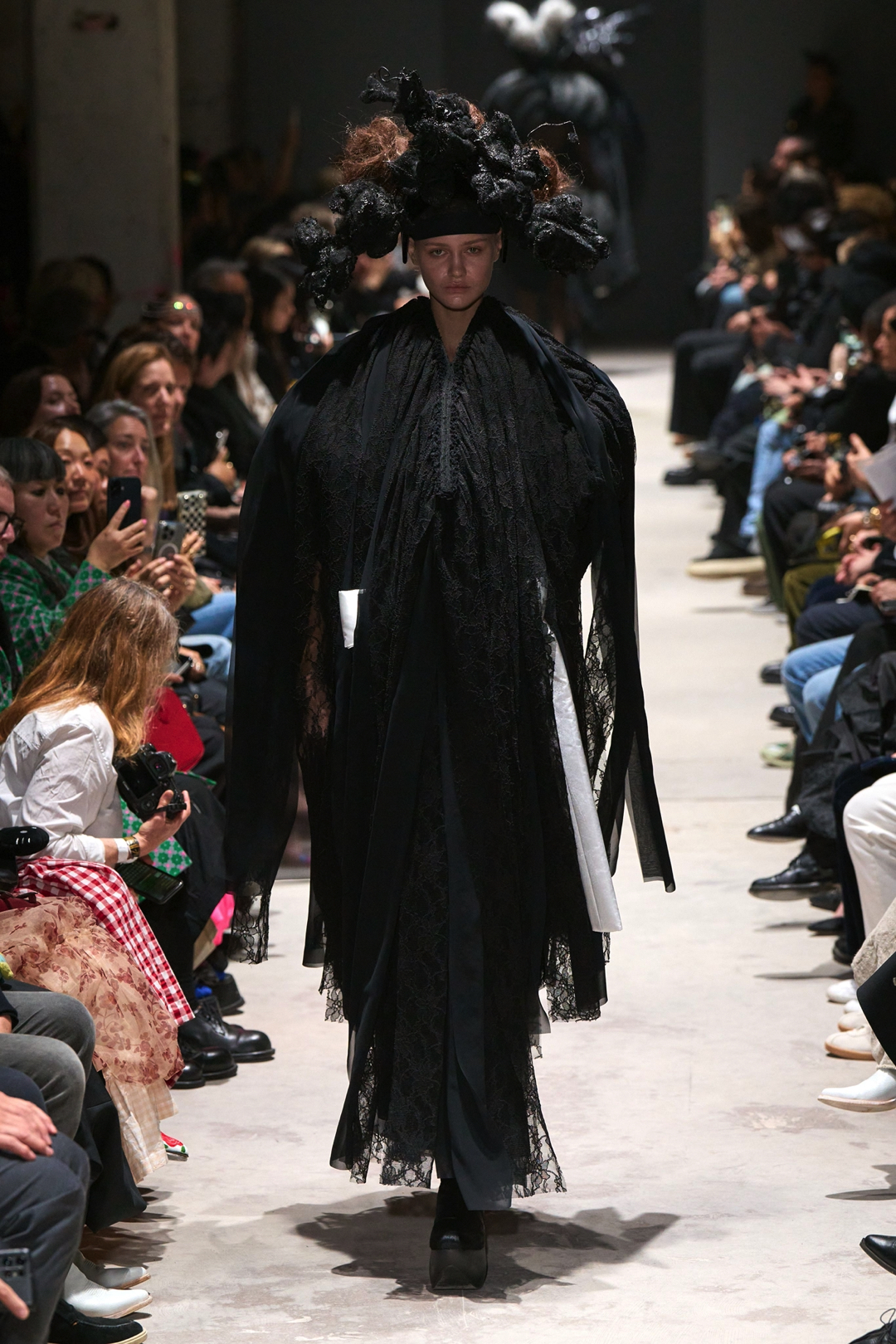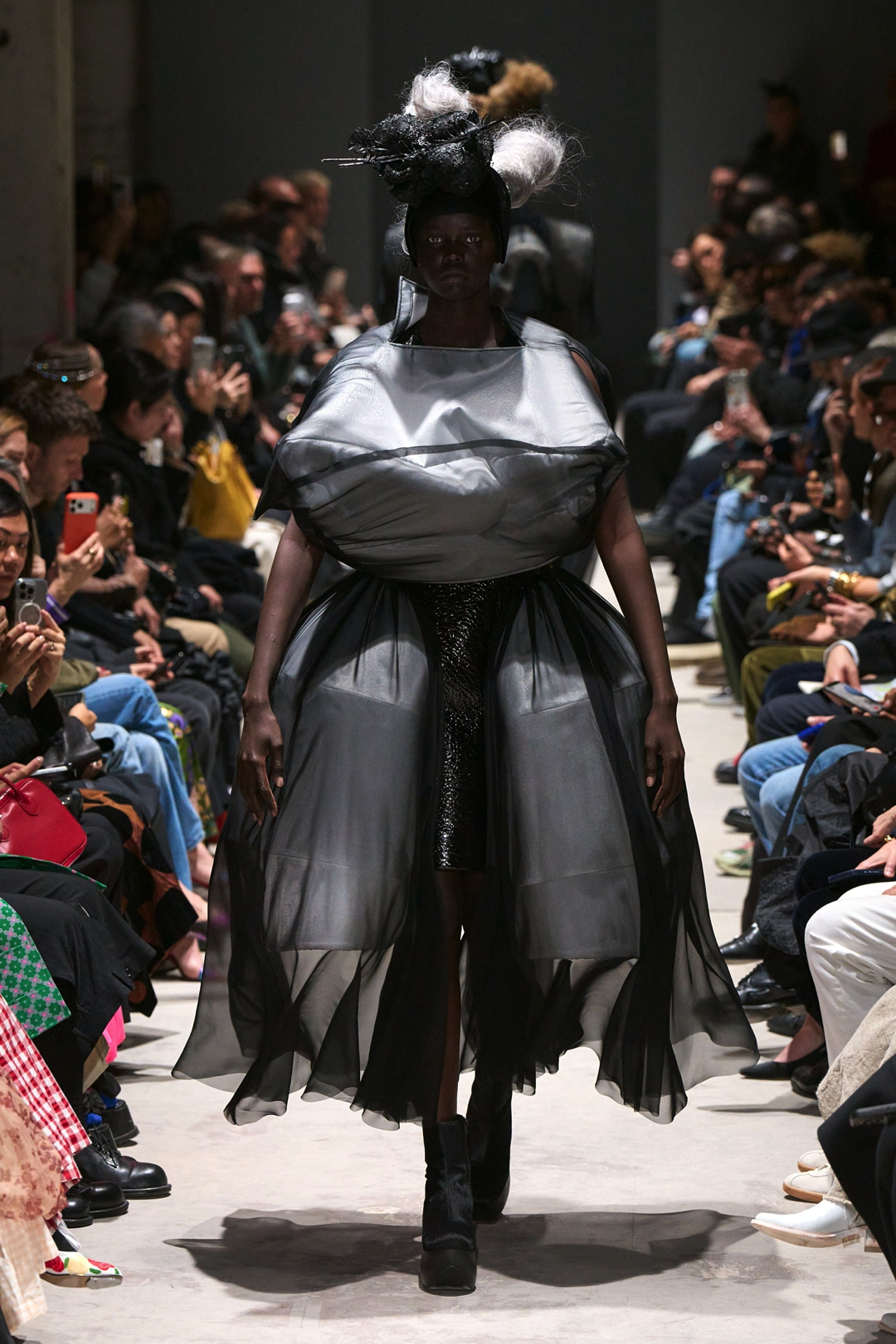 The garments expanded outward in monumental volumes. Dresses and coats unfolded as large sculptural envelopes, their breadth sometimes so exaggerated that the runway itself seemed barely wide enough to contain them. Yet within this mass the surfaces were far from uniform. Kawakubo inserted intricate disruptions. Shirring gathered fabric into irregular topographies, ruched seams distorted the geometry of the silhouettes, and layered tulle introduced fragile textures against the severity of black wool and structured textiles.