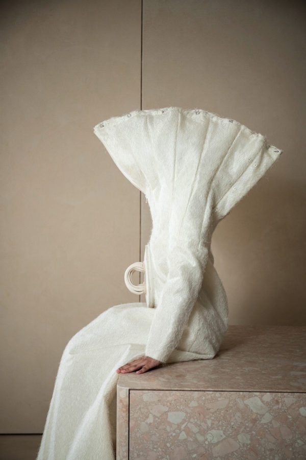 Dzhus unveils “Anticon” at the one-of-a-kind Concept_11 space, a project speculating on humanity’s “Utopia codes” designed to program happiness. Deciphering her own intimate trauma, Irina Dzhus saturates this cathartic collection with narratives of sociocultural conformism. Convinced that frustration grows on expectations, the Ukrainian designer ironises about the conventional symbolism throughout the entire history of mankind.