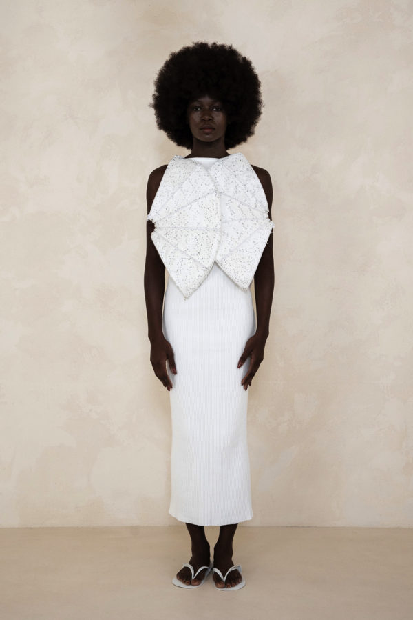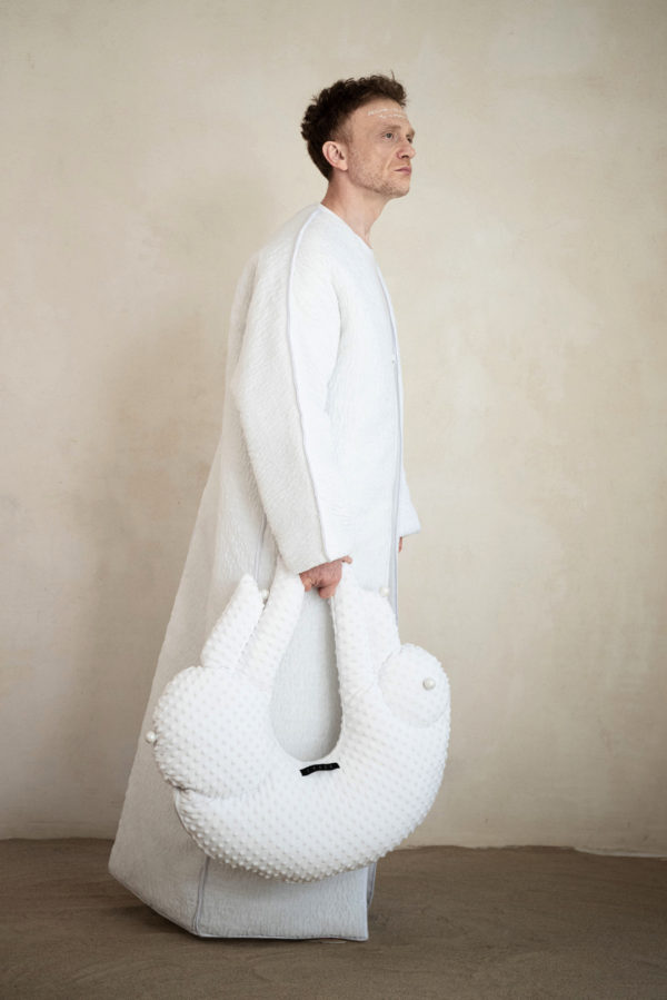 Irina Dzhus encodes the rainbow in blank, quilted surfaces. Leaving the exterior pure, she embellishes pockets and lining with rhinestones and jewellery, commemorating her own escape from the war in Ukraine through an eloquent tribute to the heartbreaking Holocaust stories. The labyrinth motif is dedicated to the Sinai wanderers driven by a spirit of homecoming. Unexpectedly, colours pop from underneath the clothing, as Dzhus paints the ‘wrong’side in the rainbow gradient. This ‘secret’splash of pigments amidst the total white collection carries a life-asserting message, suggesting an insight as a route to home, joy, and hence, fulfilment.