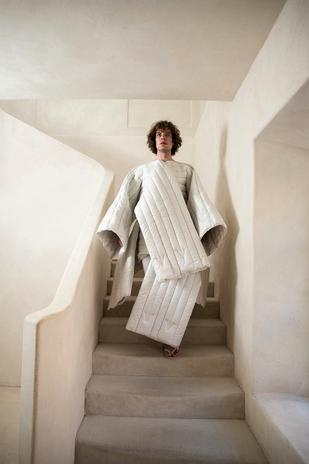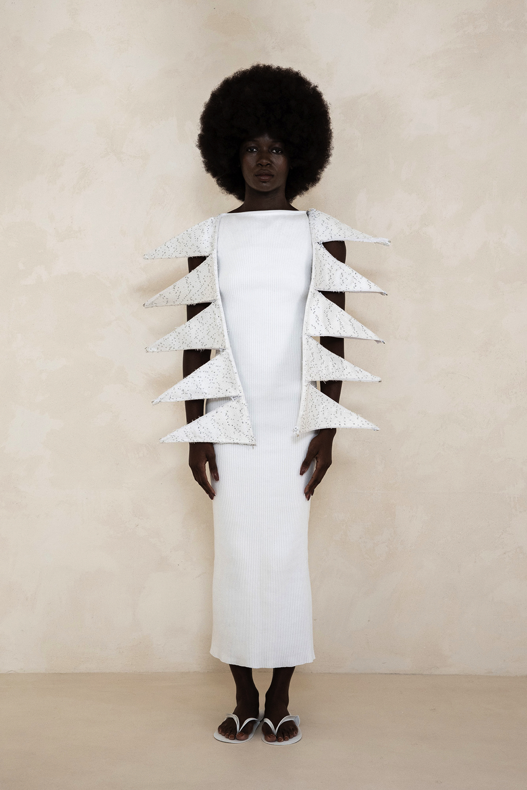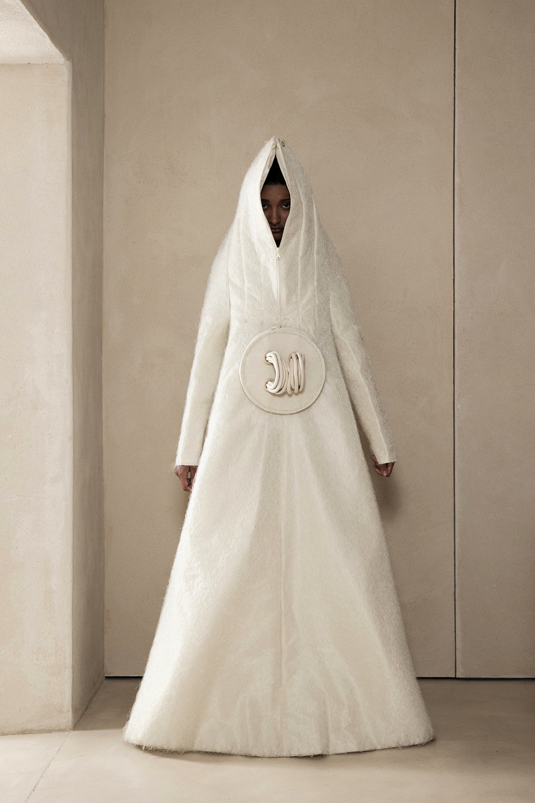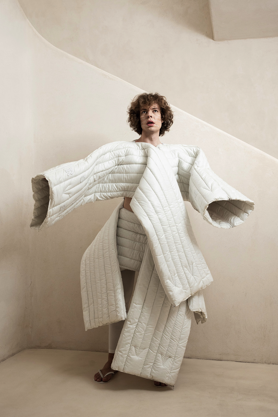 Irina Dzhus encodes the rainbow in blank, quilted surfaces. Leaving the exterior pure, she embellishes pockets and lining with rhinestones and jewellery, commemorating her own escape from the war in Ukraine through an eloquent tribute to the heartbreaking Holocaust stories. The labyrinth motif is dedicated to the Sinai wanderers driven by a spirit of homecoming. Unexpectedly, colours pop from underneath the clothing, as Dzhus paints the ‘wrong’side in the rainbow gradient. This ‘secret’splash of pigments amidst the total white collection carries a life-asserting message, suggesting an insight as a route to home, joy, and hence, fulfilment.