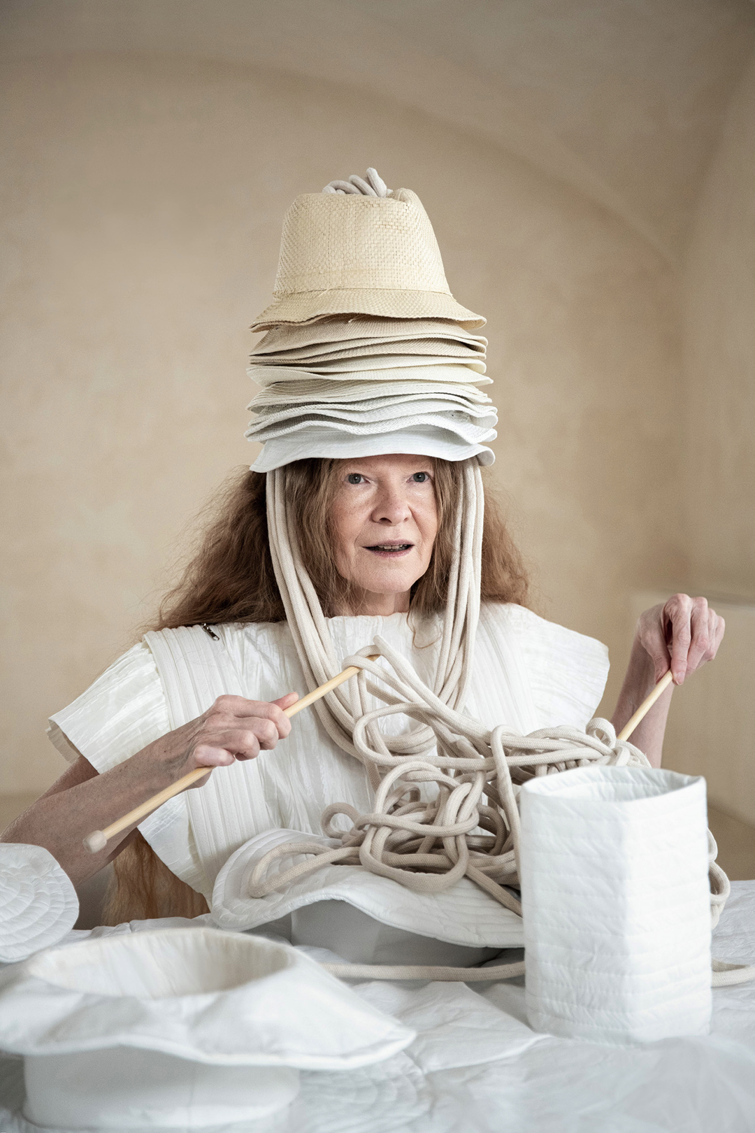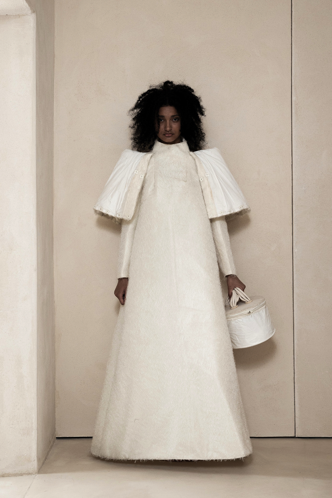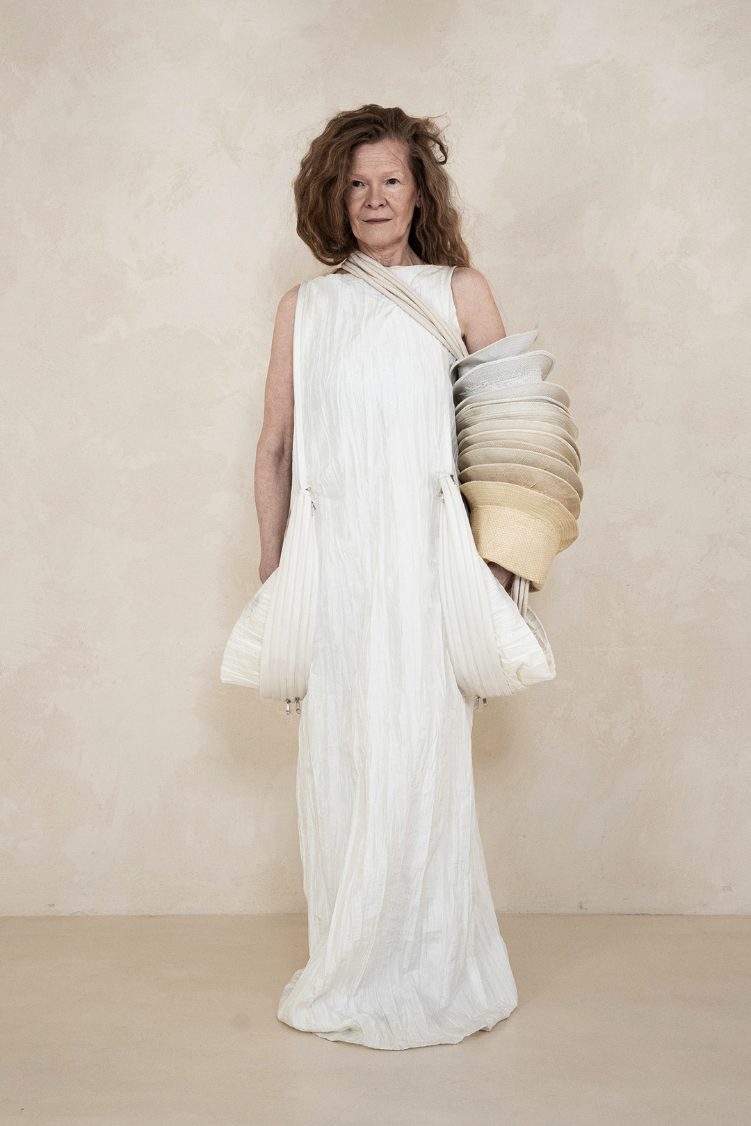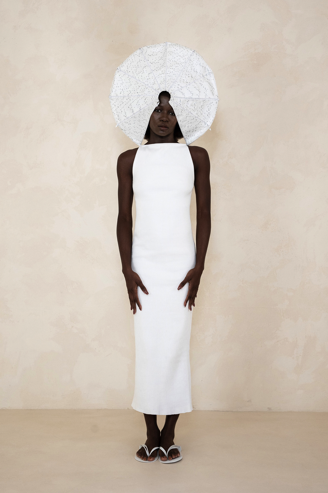Irina Dzhus encodes the rainbow in blank, quilted surfaces. Leaving the exterior pure, she embellishes pockets and lining with rhinestones and jewellery, commemorating her own escape from the war in Ukraine through an eloquent tribute to the heartbreaking Holocaust stories. The labyrinth motif is dedicated to the Sinai wanderers driven by a spirit of homecoming. Unexpectedly, colours pop from underneath the clothing, as Dzhus paints the ‘wrong’side in the rainbow gradient. This ‘secret’splash of pigments amidst the total white collection carries a life-asserting message, suggesting an insight as a route to home, joy, and hence, fulfilment.