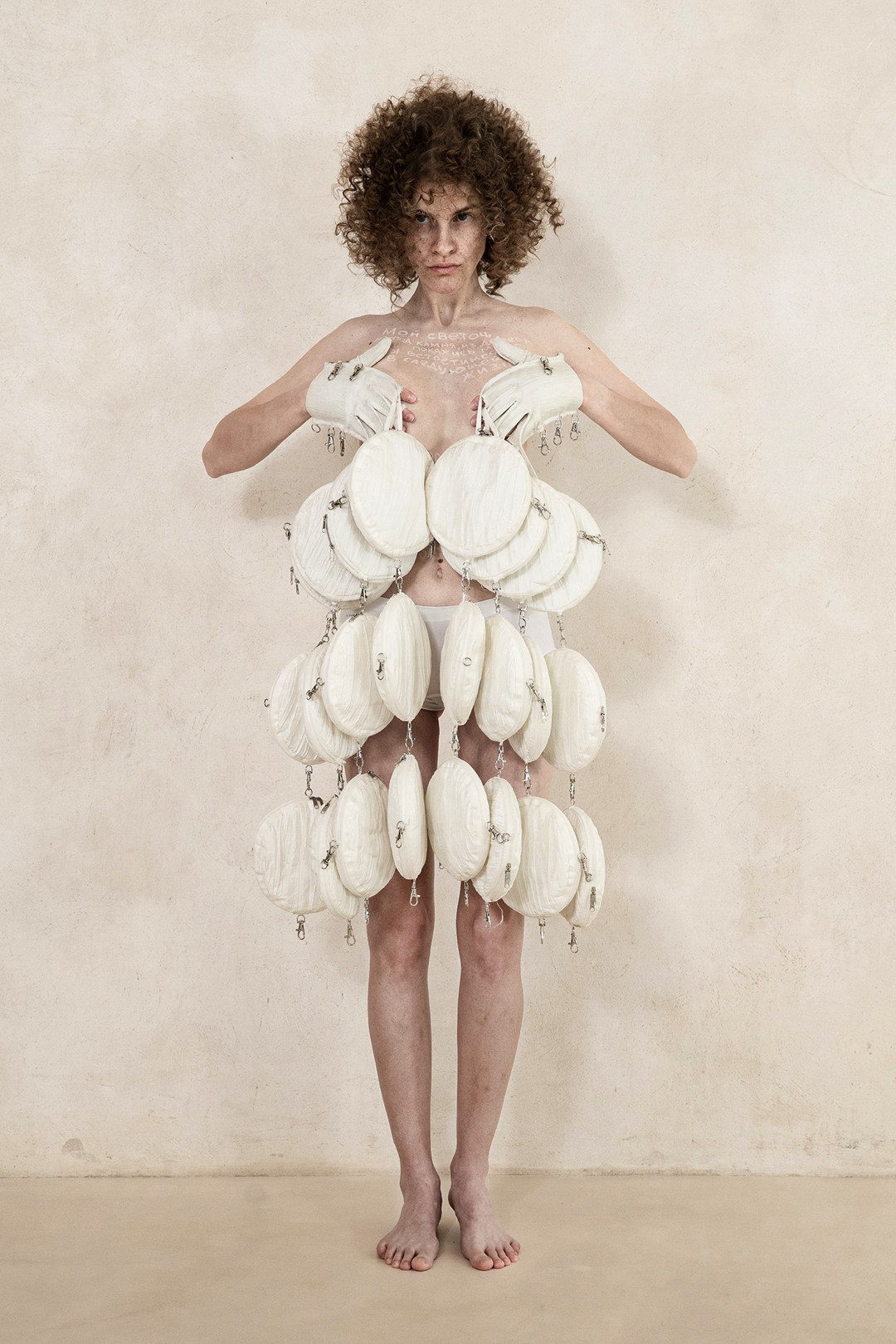 Dzhus unveils “Anticon” at the one-of-a-kind Concept_11 space, a project speculating on humanity’s “Utopia codes” designed to program happiness. Deciphering her own intimate trauma, Irina Dzhus saturates this cathartic collection with narratives of sociocultural conformism. Convinced that frustration grows on expectations, the Ukrainian designer ironises about the conventional symbolism throughout the entire history of mankind.