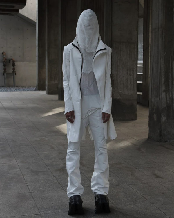 Since founding Eric Créer in 2022, after teaching himself sewing and pattern making in 2020, Chai has earned a reputation for his meticulous craftsmanship with denim and leather. With Détruire, he brings his exploration of form, function, and construction to new heights. The silhouettes are sharper, more aggressive, jackets that feel like armor, pants that move like sculpture, dresses that unravel only to reform in unexpected ways. Accessories become integral to the collection, not just as complements, but as key narrative pieces.