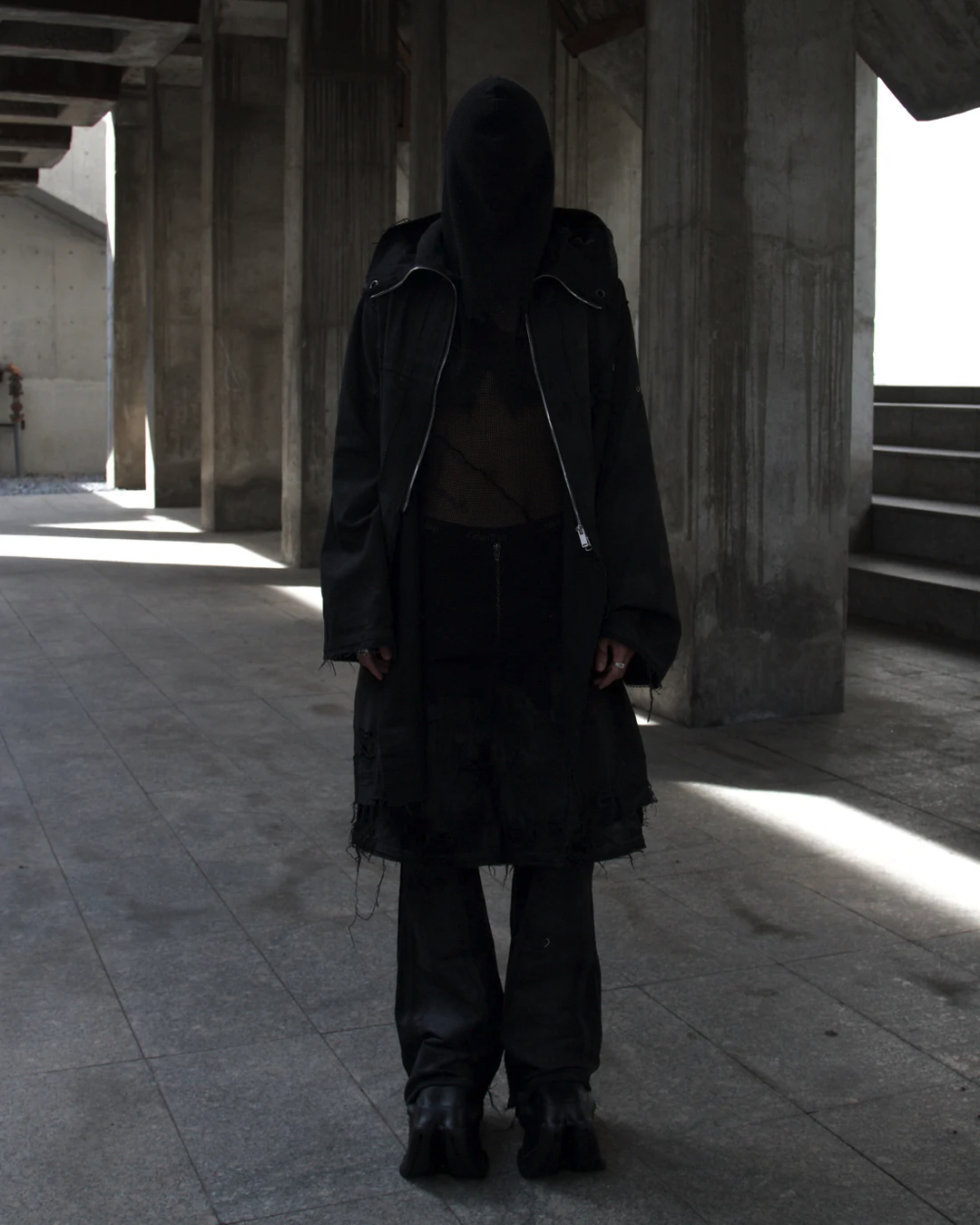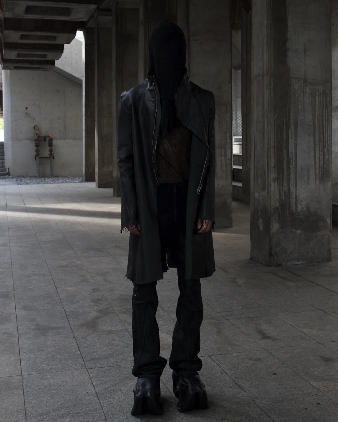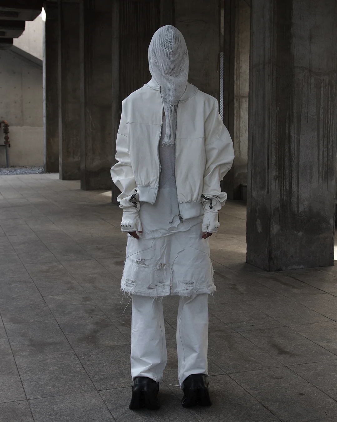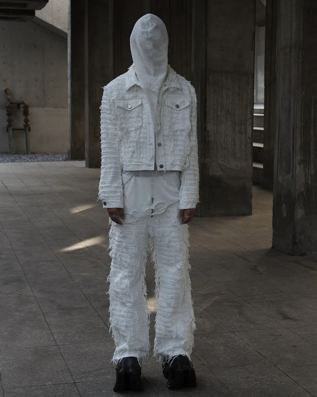 Since founding Eric Créer in 2022, after teaching himself sewing and pattern making in 2020, Chai has earned a reputation for his meticulous craftsmanship with denim and leather. With Détruire, he brings his exploration of form, function, and construction to new heights. The silhouettes are sharper, more aggressive, jackets that feel like armor, pants that move like sculpture, dresses that unravel only to reform in unexpected ways. Accessories become integral to the collection, not just as complements, but as key narrative pieces.
