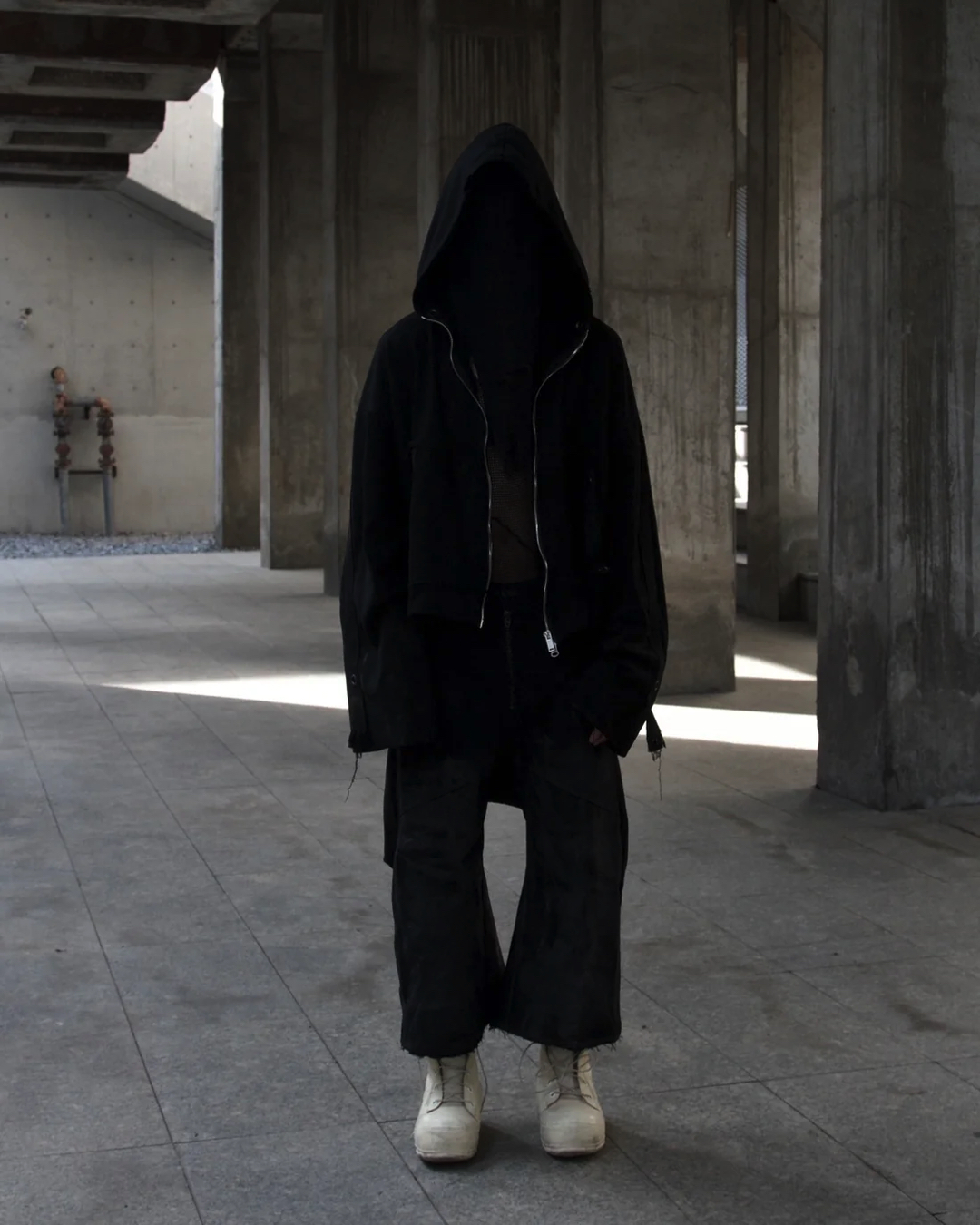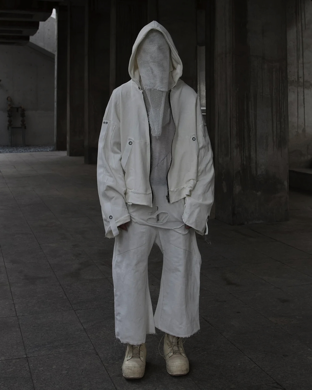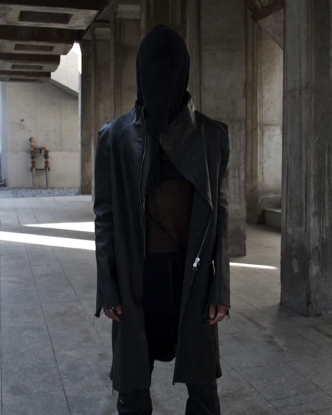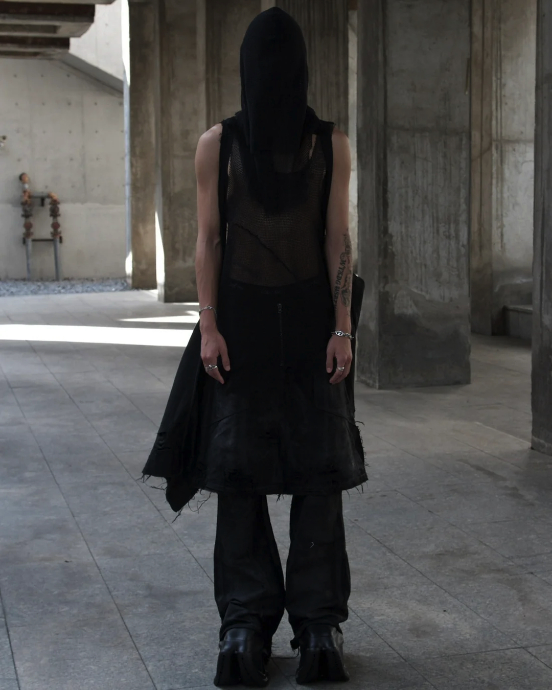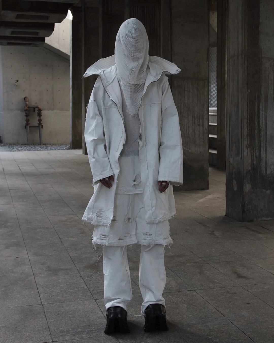 Since founding Eric Créer in 2022, after teaching himself sewing and pattern making in 2020, Chai has earned a reputation for his meticulous craftsmanship with denim and leather. With Détruire, he brings his exploration of form, function, and construction to new heights. The silhouettes are sharper, more aggressive, jackets that feel like armor, pants that move like sculpture, dresses that unravel only to reform in unexpected ways. Accessories become integral to the collection, not just as complements, but as key narrative pieces.