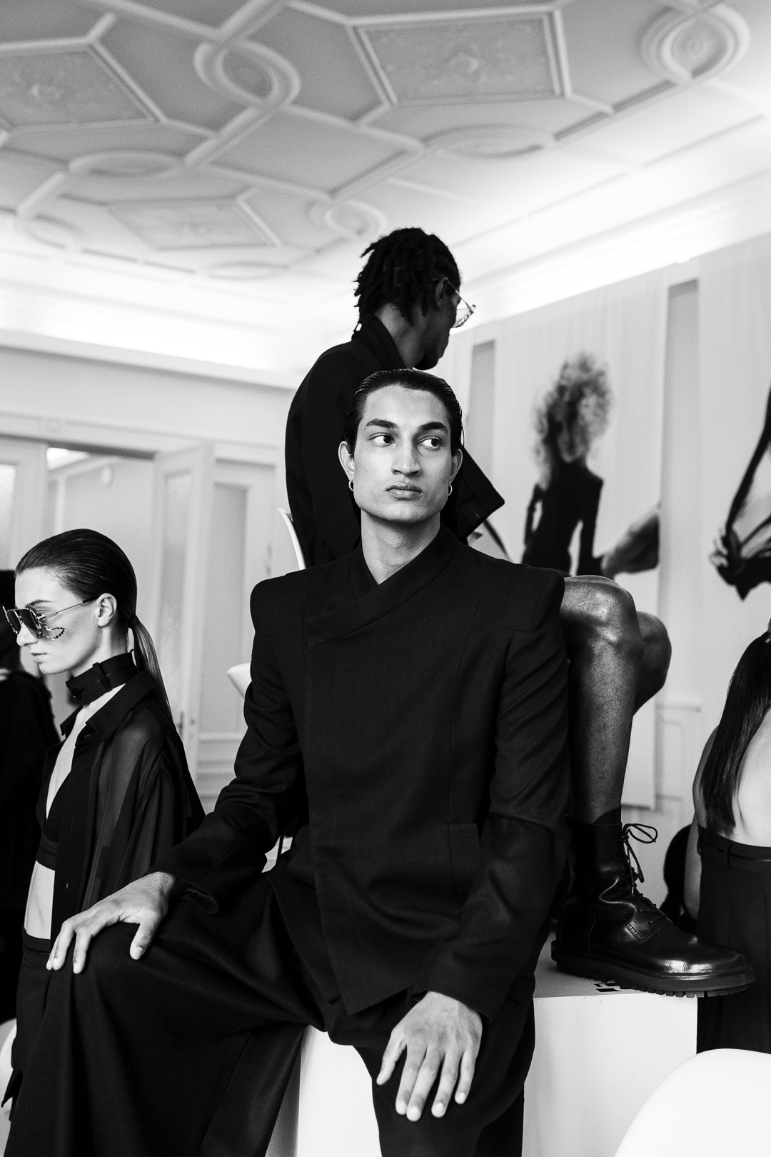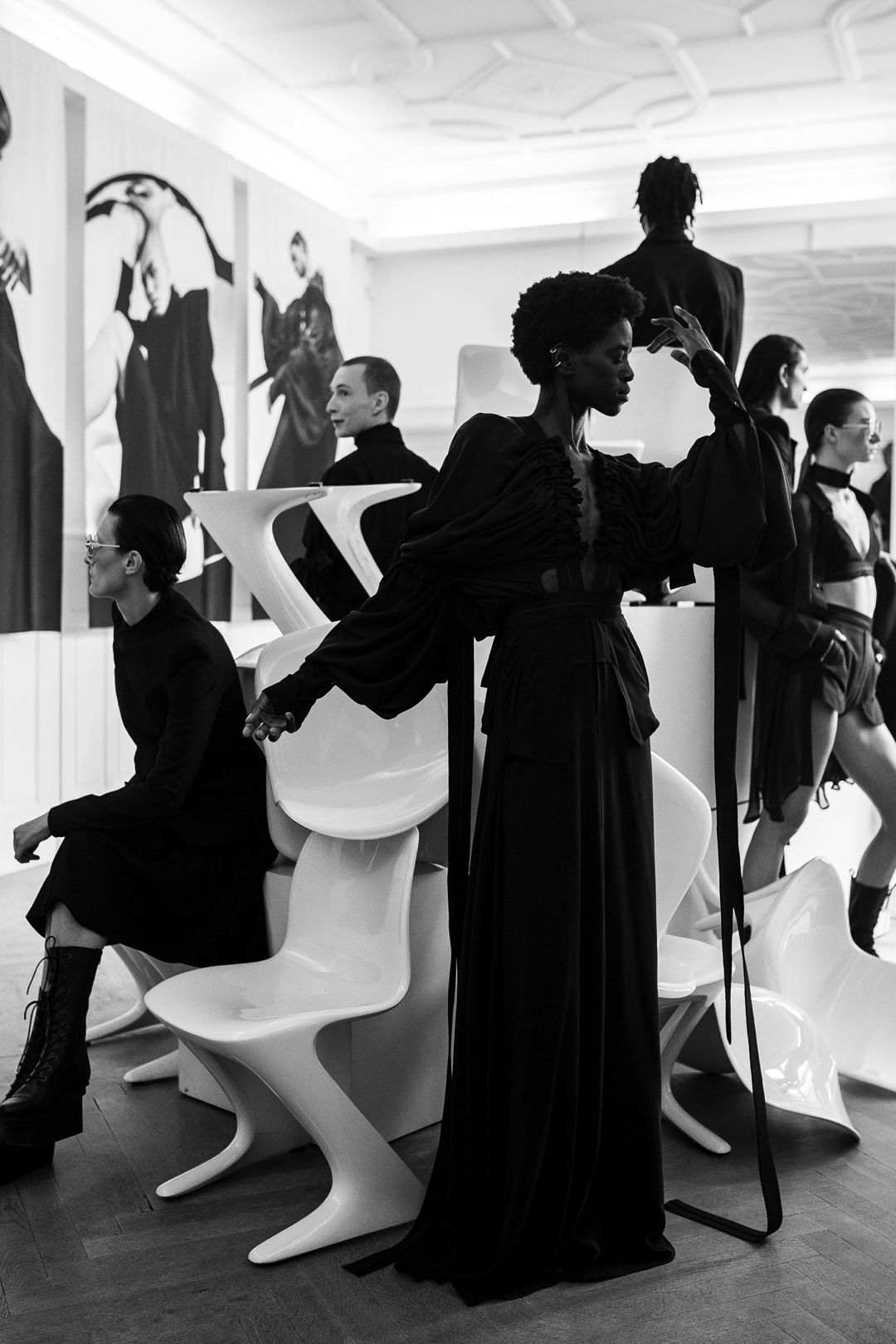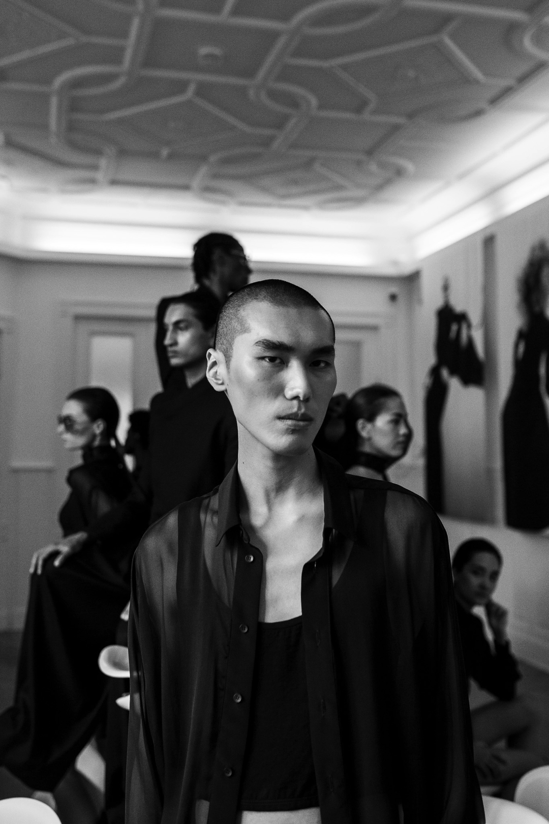 Nine models enacted the garments in slow, meditative poses. There was no music, no walk, just presence. Elevated on a tower of white chairs, some stood, others sat or crouched, creating a living sculpture. The audience moved around them, absorbing the quiet power of black.