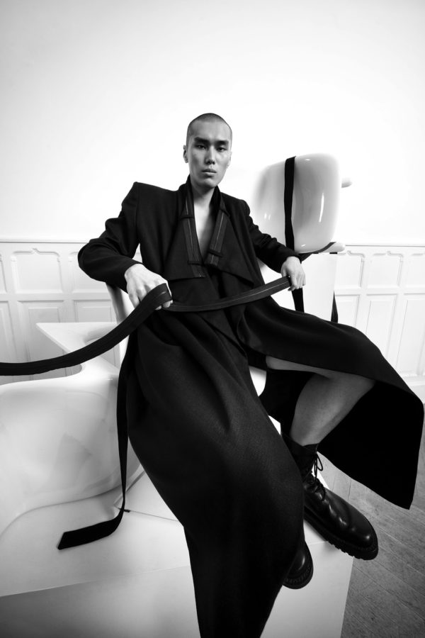 Tailoring was genderless, shifting fluidly between masculine and feminine archetypes. Coats with ribbon closures, unisex silhouettes, and fluid draping offered no fixed identity. A silk dress constructed from twelve meters of fabric embodied both severity and softness. Even the materials, wool, cotton, and silk, played in contrasts: matte and shine, heavy and translucent, structure and movement.