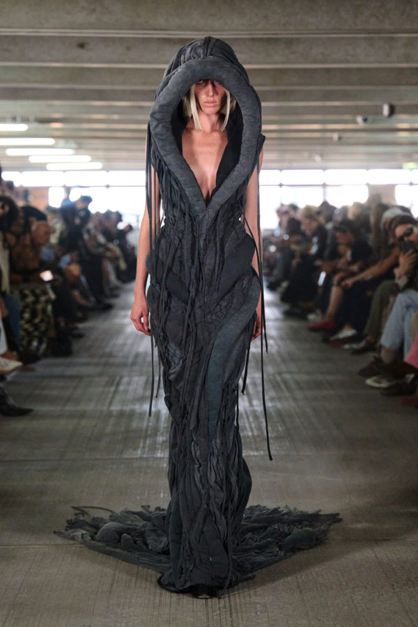 “Another Day” is not about escape. It is about repetition, realism, and emotional legacy. By reworking suburban fragments into silhouette and surface, Han Kjøbenhavn continues to build a design language rooted in autobiography, where past and present blur. SS26 is not a climax or a reset, just another day, cut sharply in leather, mesh, feathers, and steel-grey nylon.