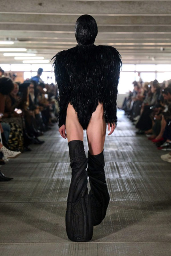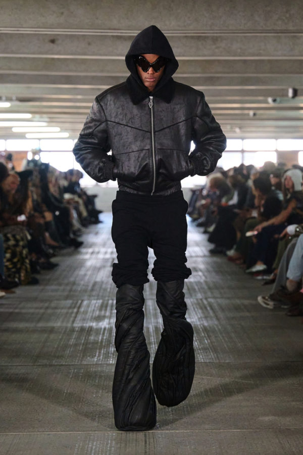 Garments pull from the world but are reimagined through exaggeration and tension. Faux leather bombers are oversized and padded like suburban armor. Mesh tracksuits hug the body in ways that feel both athletic and ceremonial. A leather tank layered under a molded vest merges protection with performance. Feathers, deliberately artificial, trace the shoulder line or collarbone, while silver-sculpted tops cling like muscle and pair with nothing but tailored boxers and trainers.