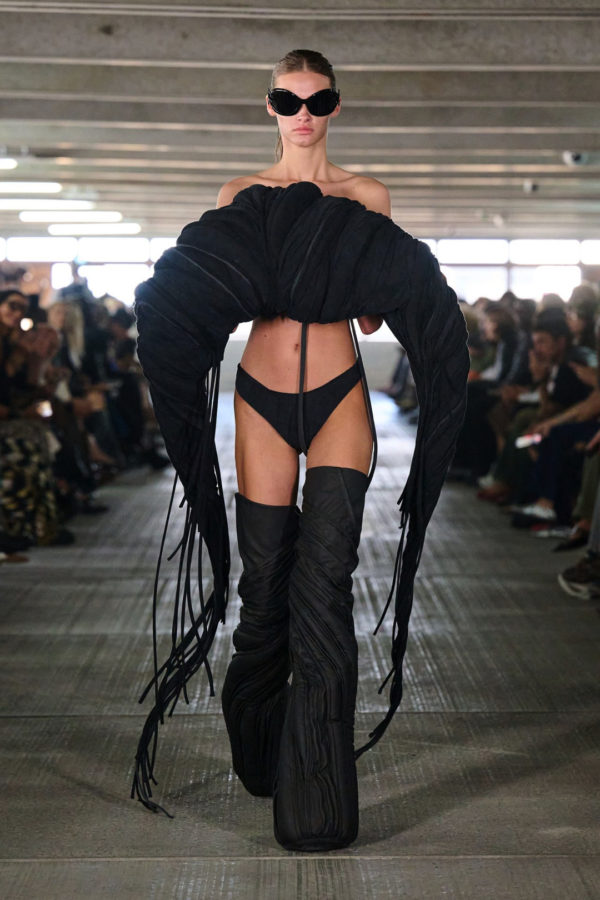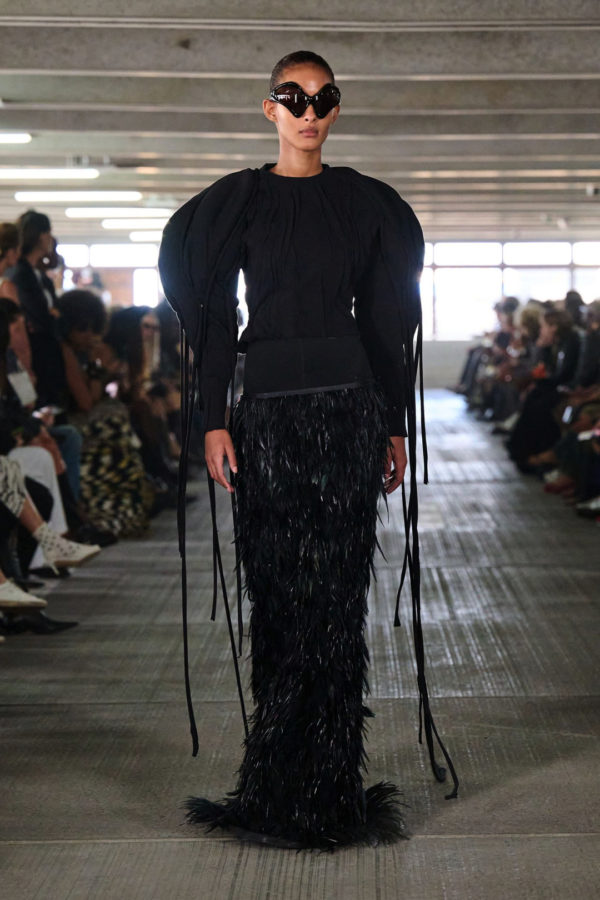 One look combines a matte black football jersey with tonal embroidery, paired with nylon shorts and sculptural gloves. Another floats synthetic feathers over bare skin like suburban couture. Styling moves between street and ceremony, pushing bodybuilder bravado up against softness and restraint.