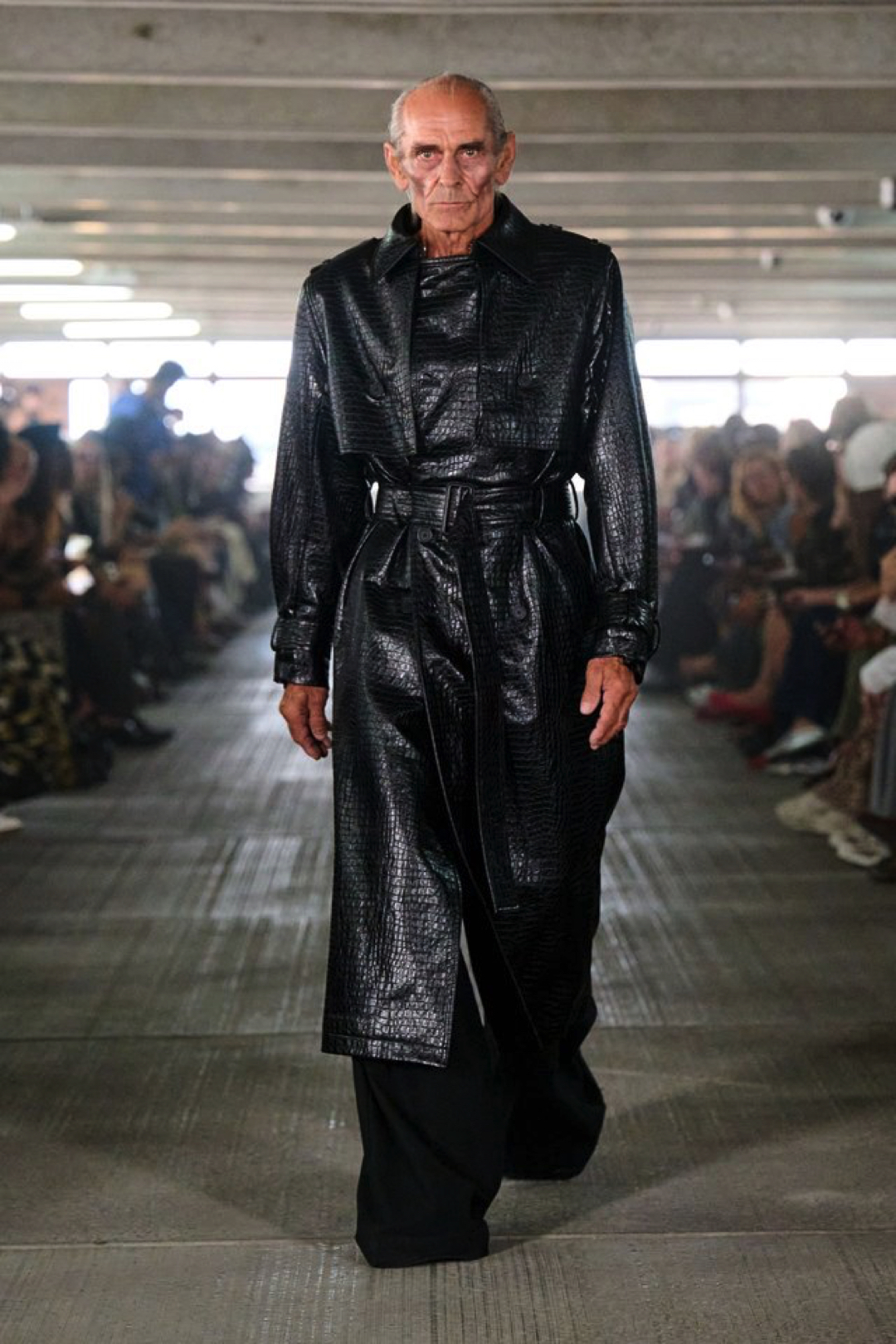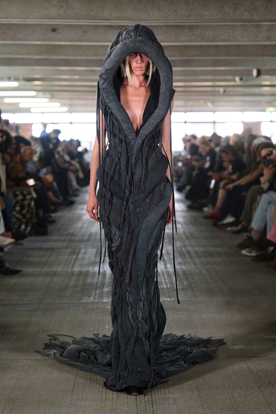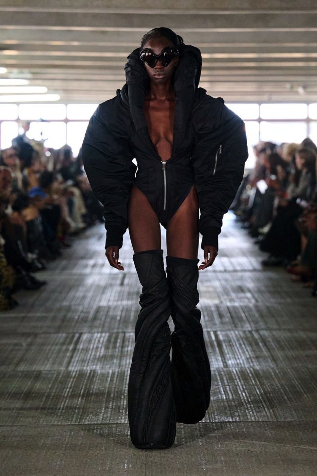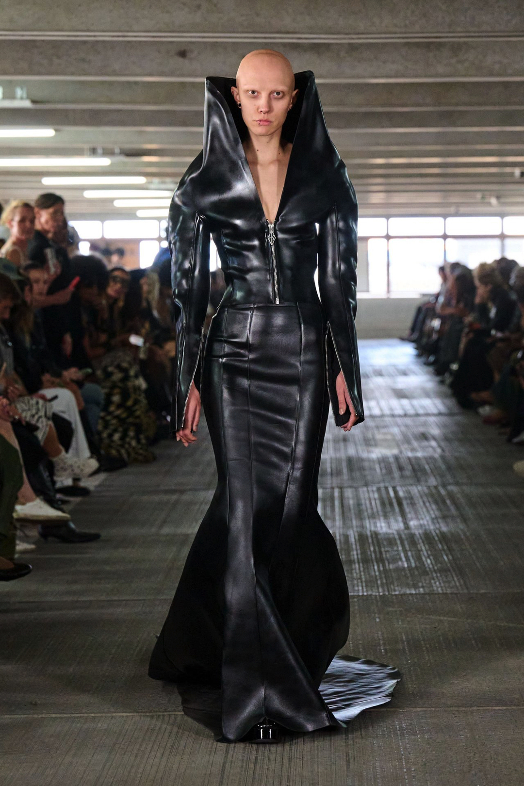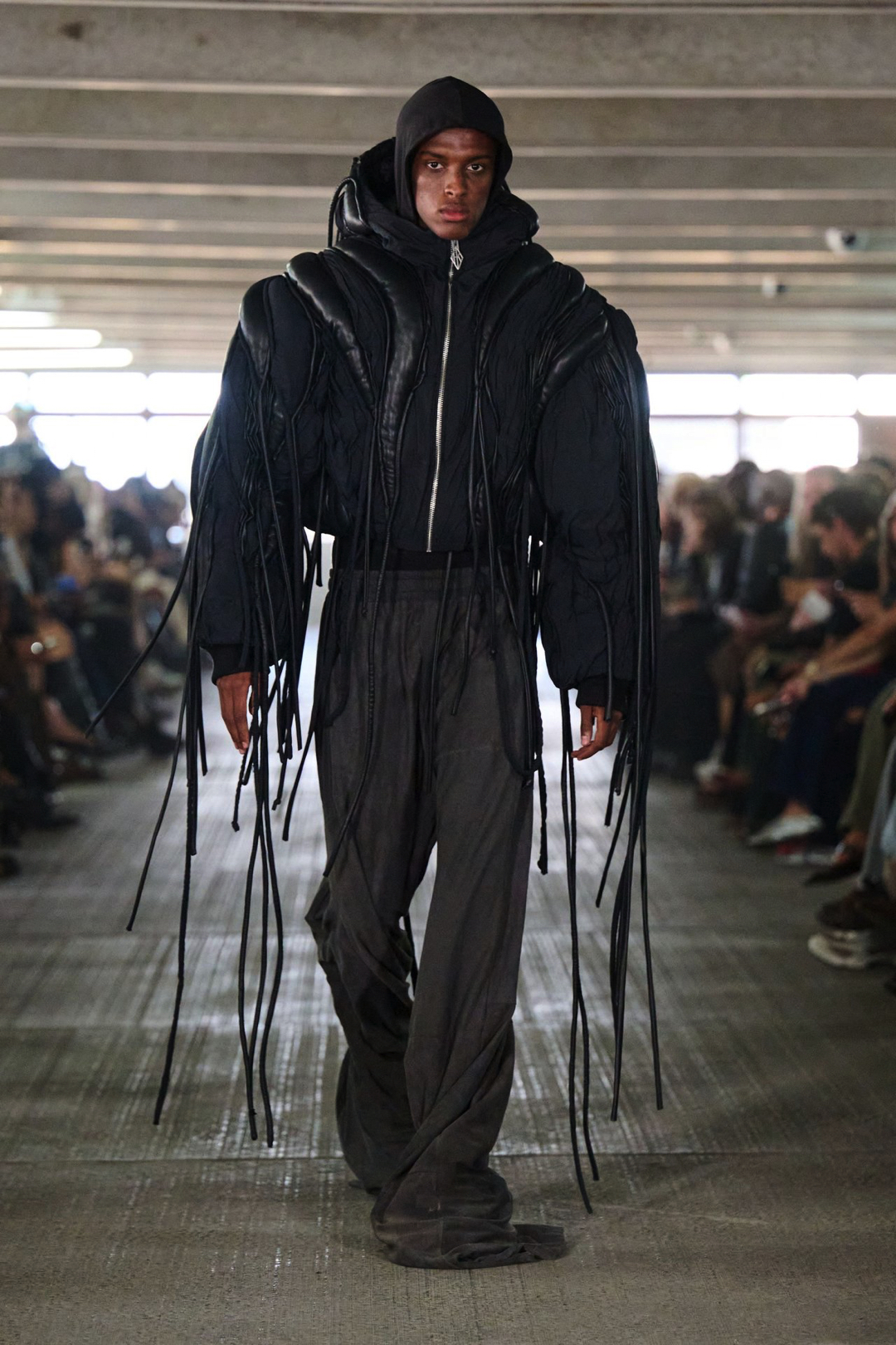 Garments pull from the world but are reimagined through exaggeration and tension. Faux leather bombers are oversized and padded like suburban armor. Mesh tracksuits hug the body in ways that feel both athletic and ceremonial. A leather tank layered under a molded vest merges protection with performance. Feathers, deliberately artificial, trace the shoulder line or collarbone, while silver-sculpted tops cling like muscle and pair with nothing but tailored boxers and trainers.