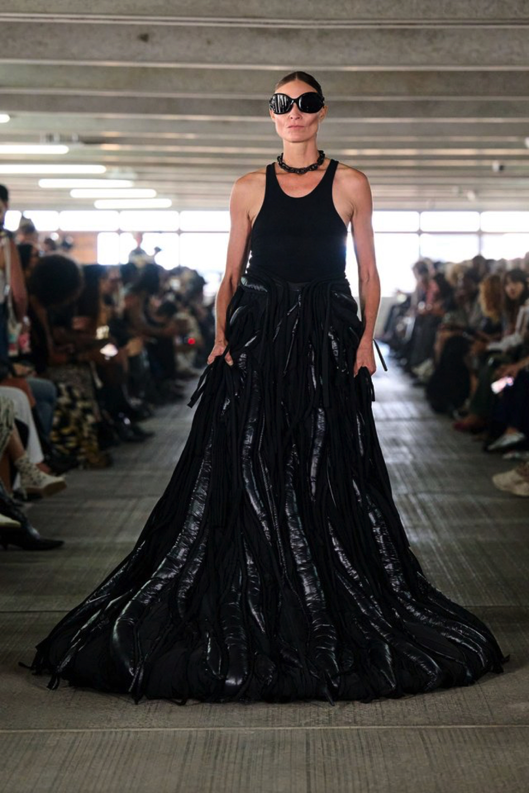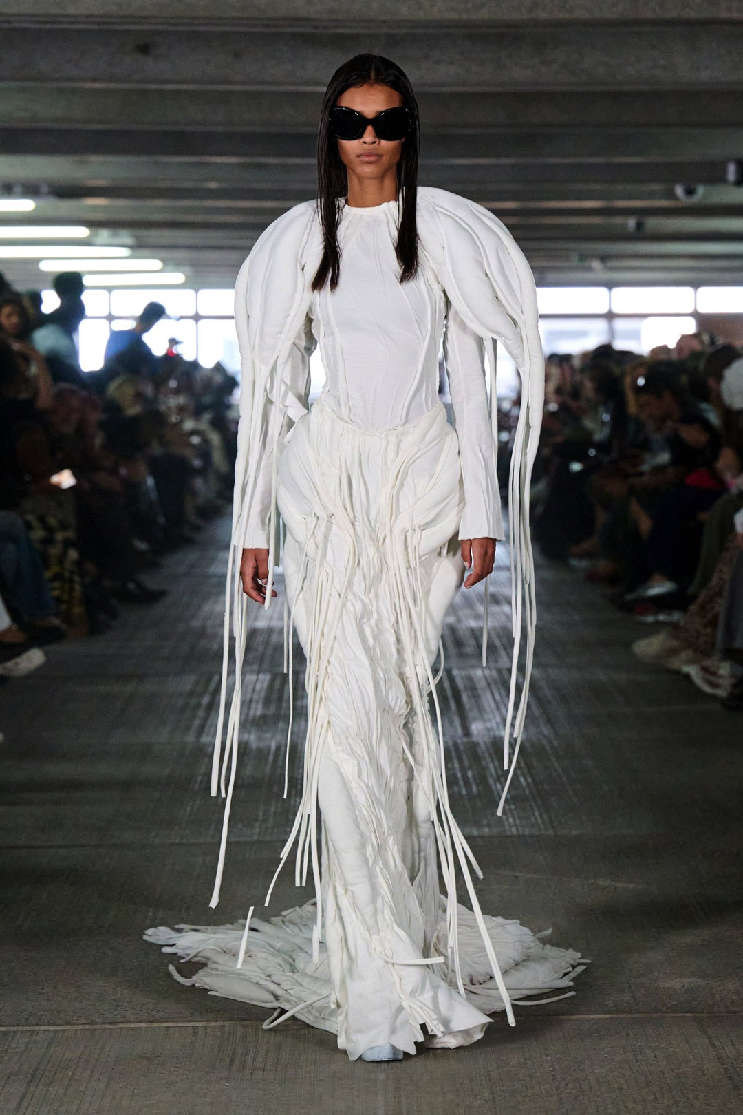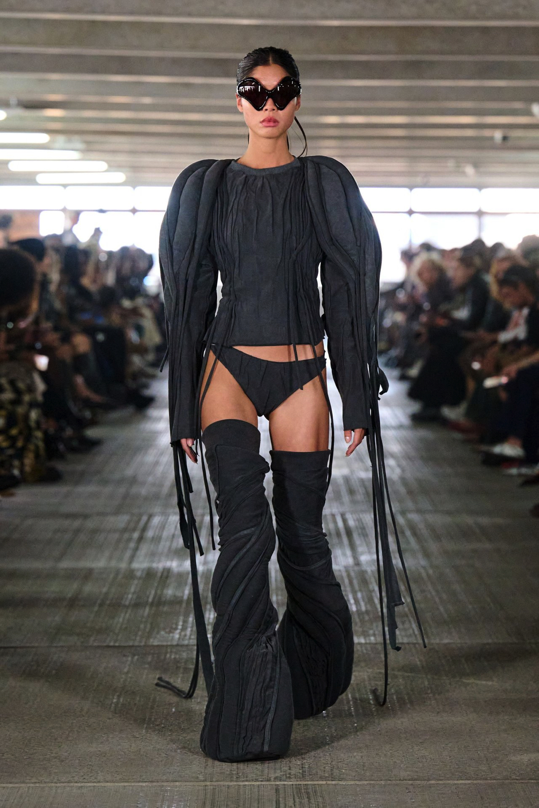 One look combines a matte black football jersey with tonal embroidery, paired with nylon shorts and sculptural gloves. Another floats synthetic feathers over bare skin like suburban couture. Styling moves between street and ceremony, pushing bodybuilder bravado up against softness and restraint.