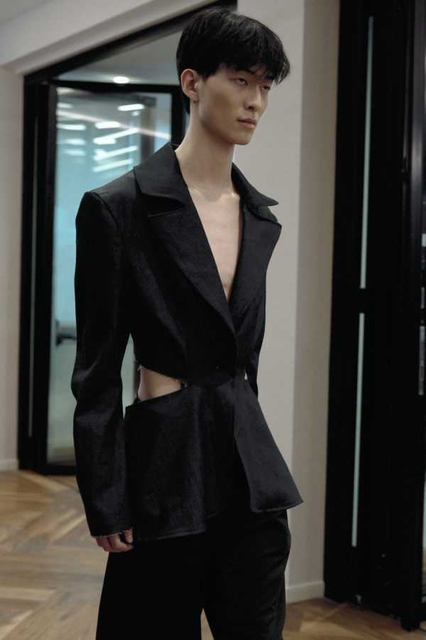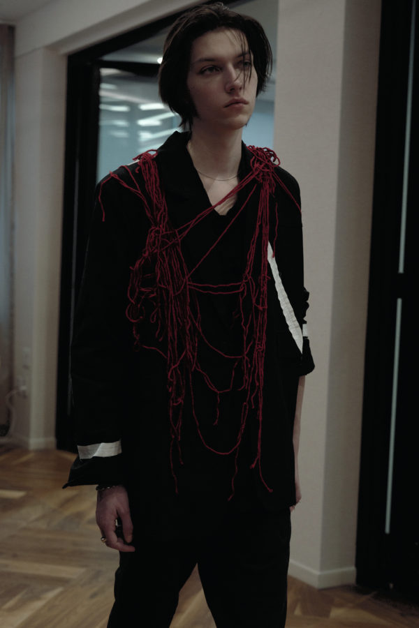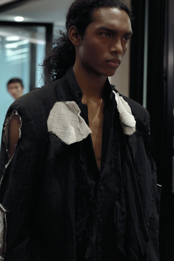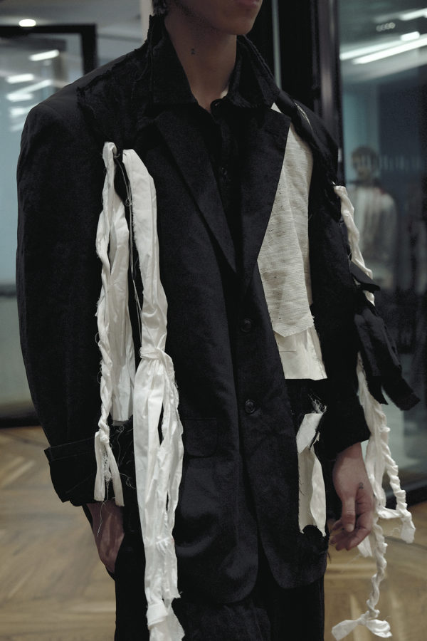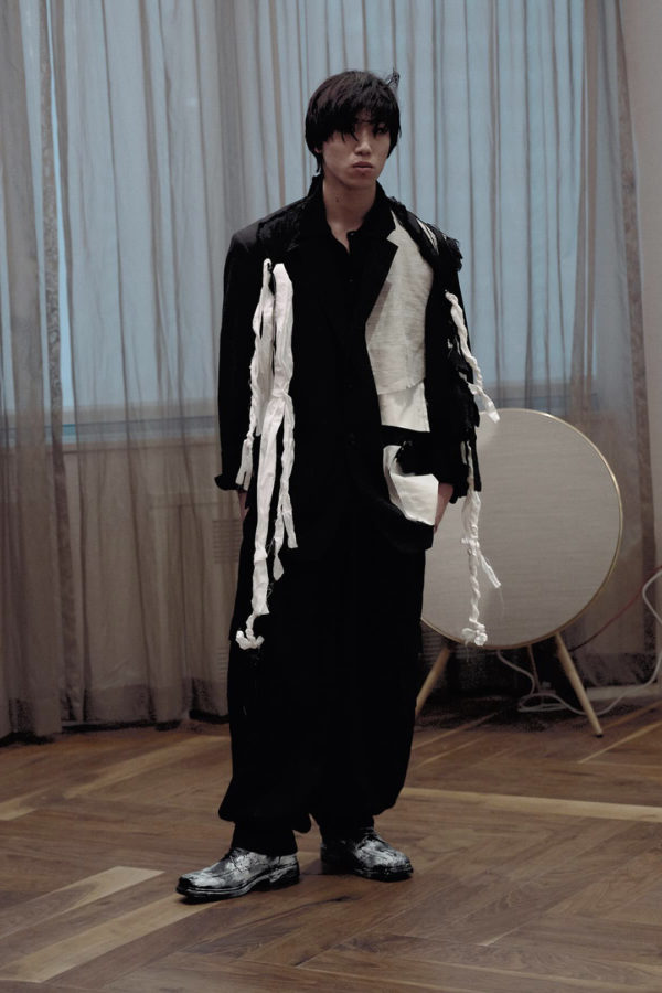 All fabrics in the collection keep in theme with the brand’s roots, sourced from deadstock recycled Japanese cottons, wool, nylon polyester-blends, etc. This is the first time for Hikari no Yami to include colors. The palette consists of black, white, grey, and red, symbolizing a return to designer Jakarie Whitaker’s origins.
