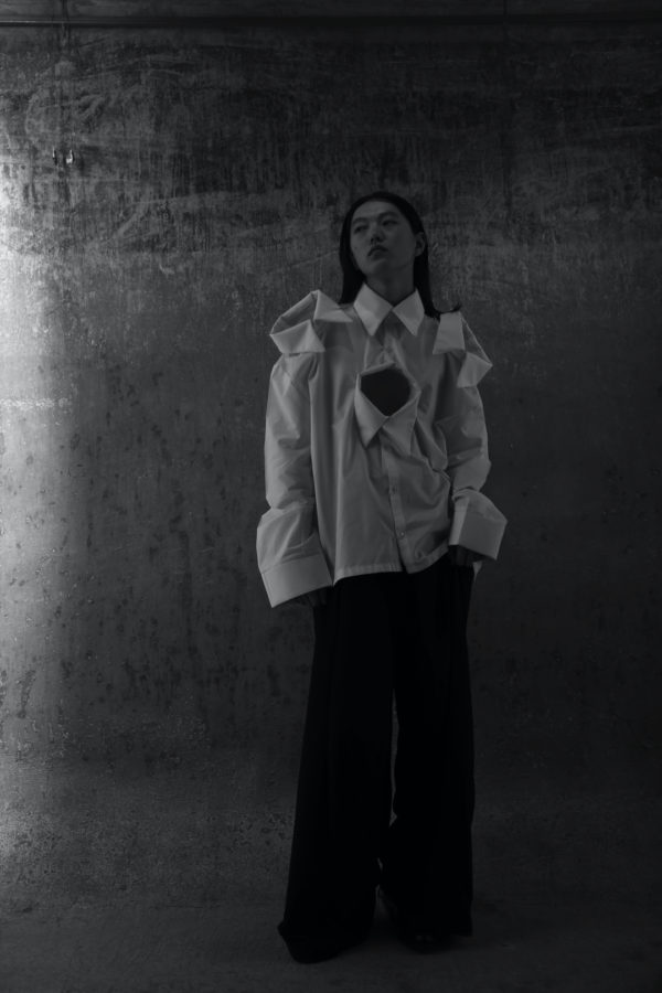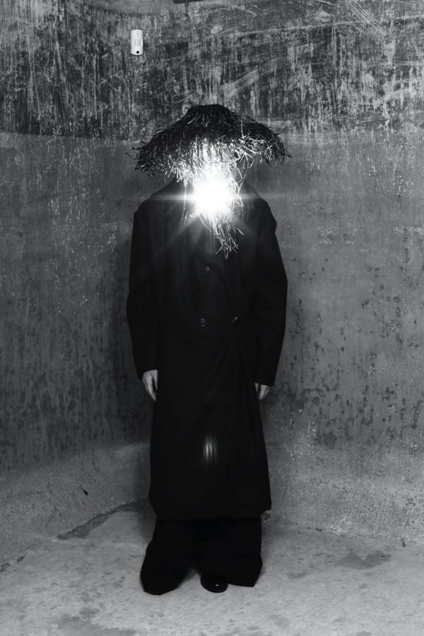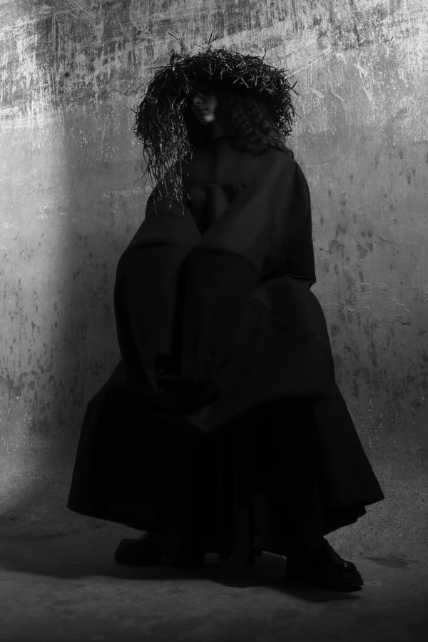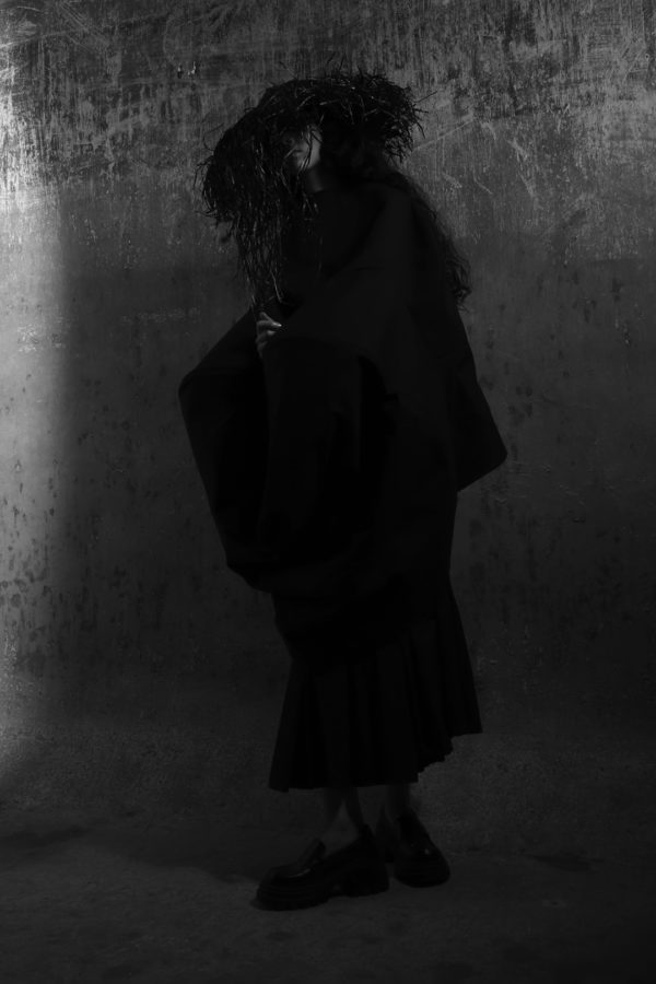 Three key looks capture the direction of the collection. A white shirt with four exaggerated collars suggests the weight and complexity of emotional experience, structured yet excessive. A sculptural black wool coat offers a sense of containment and protection, wrapping the body in a controlled and deliberate silhouette. The final look, abstract and almost fully concealing the wearer, represents withdrawal and the possibility of starting over.