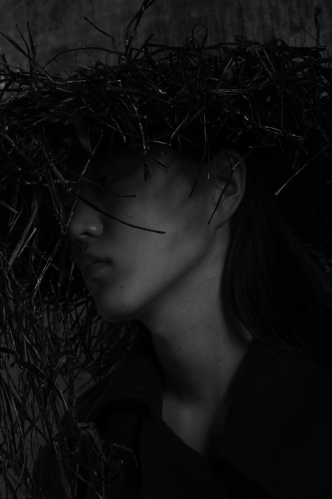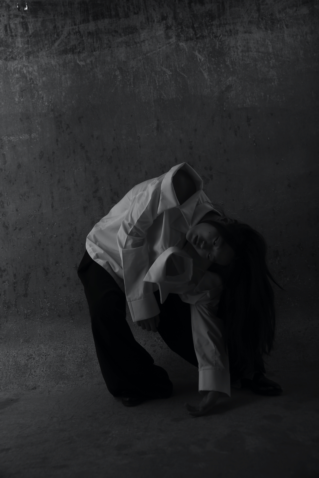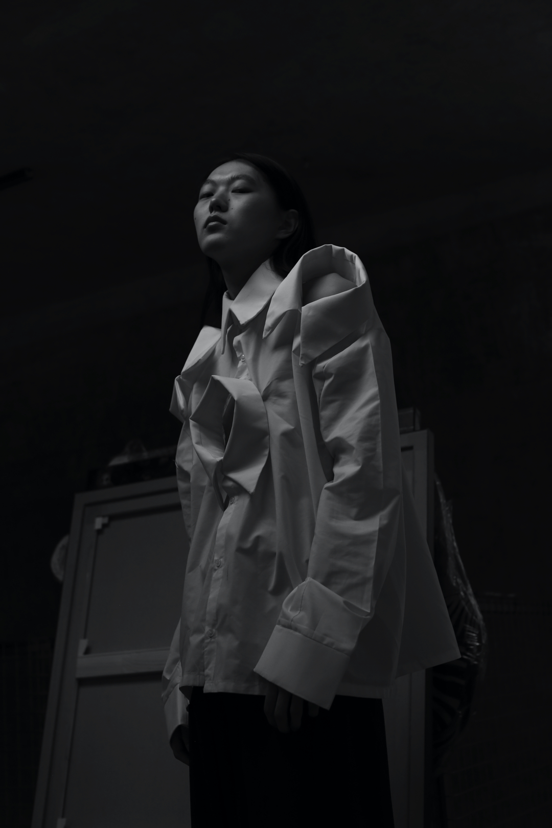 Three key looks capture the direction of the collection. A white shirt with four exaggerated collars suggests the weight and complexity of emotional experience, structured yet excessive. A sculptural black wool coat offers a sense of containment and protection, wrapping the body in a controlled and deliberate silhouette. The final look, abstract and almost fully concealing the wearer, represents withdrawal and the possibility of starting over.