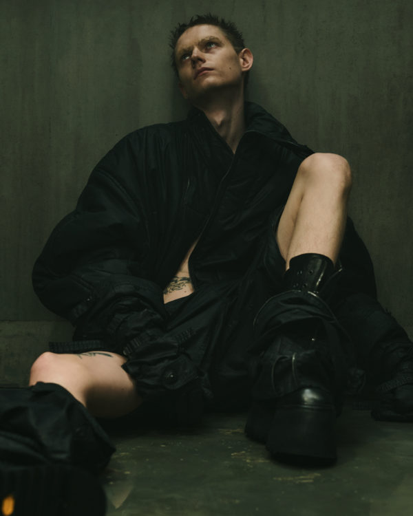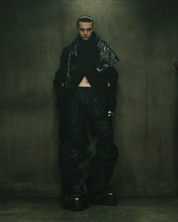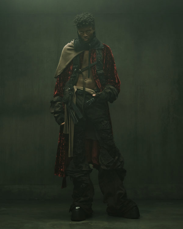 Deep blacks, muted greens, reds and rust tones dominate, with elongated coats, knitwear and distressed leather forming an apolcaliptic yet poetic wardrobe. Asymmetric and deconstructed silhouettes emphasize movement and tension within the collection.