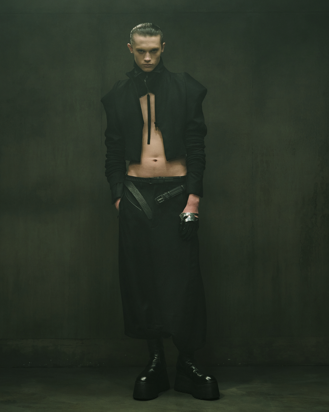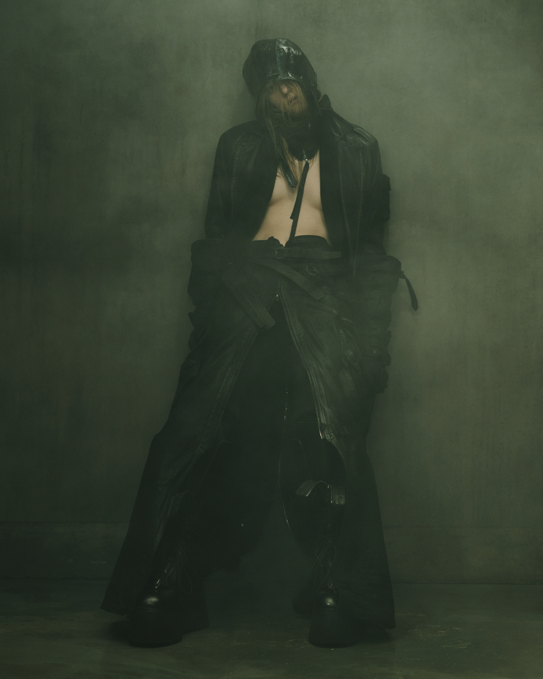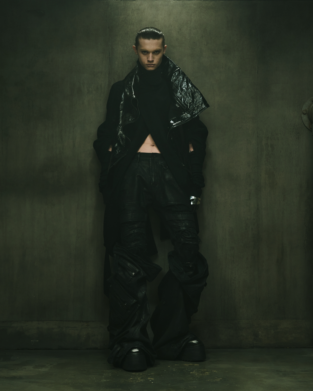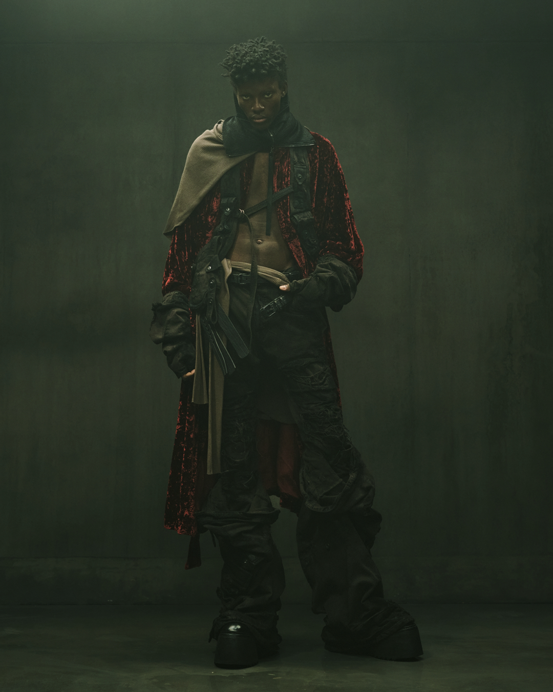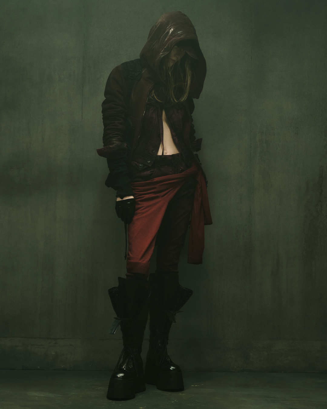 Deep blacks, muted greens, reds and rust tones dominate, with elongated coats, knitwear and distressed leather forming an apolcaliptic yet poetic wardrobe. Asymmetric and deconstructed silhouettes emphasize movement and tension within the collection.