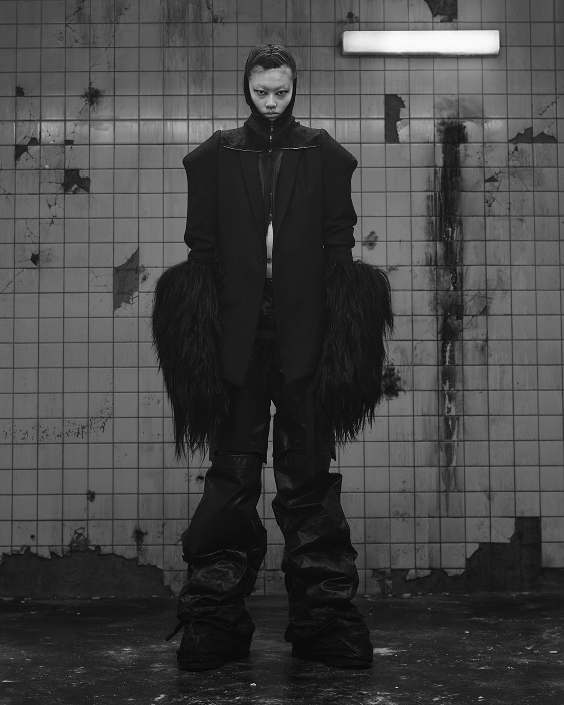 Textures shift between coated fabrics, leather, faux fur and cotton, balancing resilience and fragility. Accessories include leather boots, gloves, soles, balaclavas, and intricate jewelry by Fangophilia and Dual Flow, reinforcing the collection’s utilitarian edge.