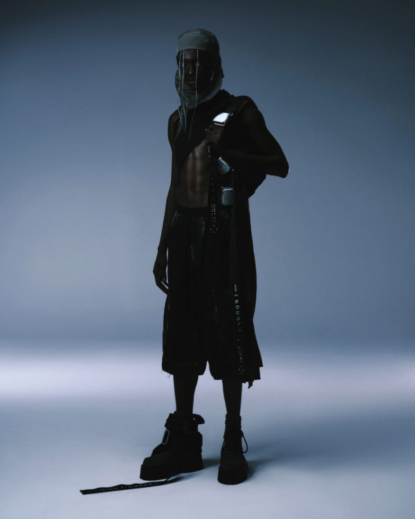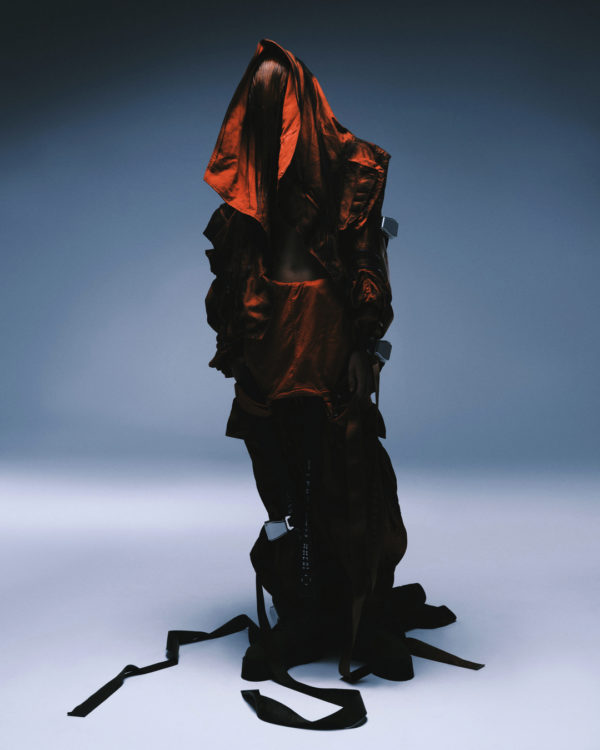 Much like Clarke’s prescient storytelling, “[ EUROPA; ]” ventures into the interplay between the organic and the industrial. The collection takes its cues from the moon’s hypothetical biological elements, a universe of strange, primordial textures and colors that hint at life hidden beneath Europa’s icy surface. Against this, the designs are infused with a mechanical, humanoid aesthetic, evoking a future where man and machine evolve symbiotically.