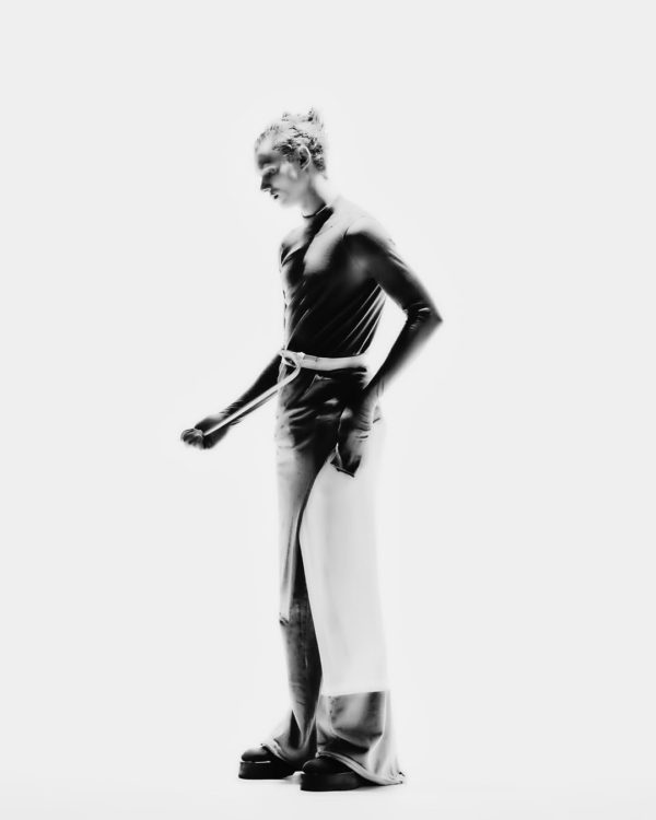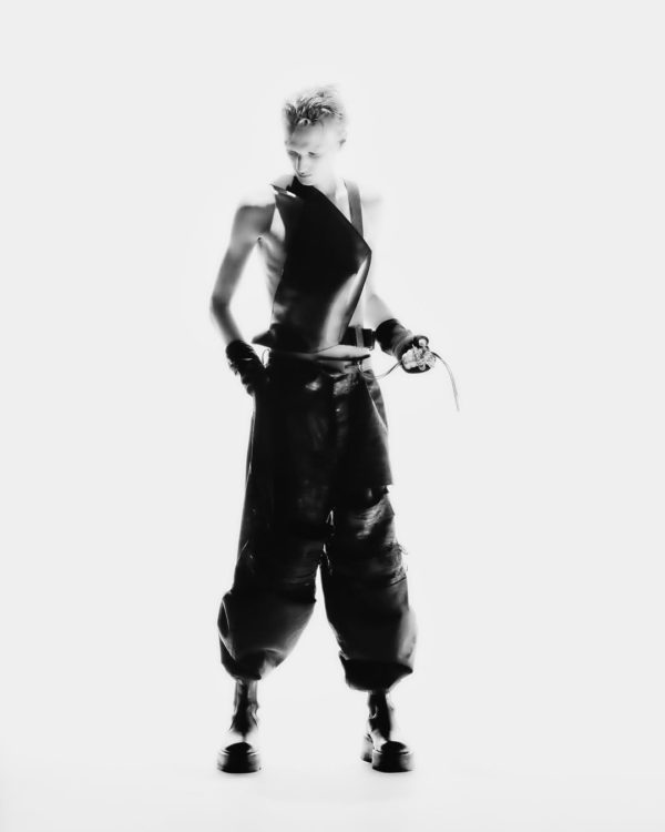 Accessories add depth without overpowering the looks. Heavy-soled leather boots, sculptural gloves, and belts with bold metal buckles, reinforce the collection’s experimental but functional spirit.