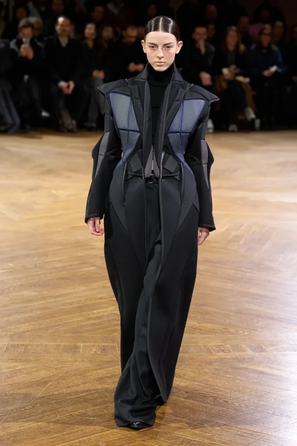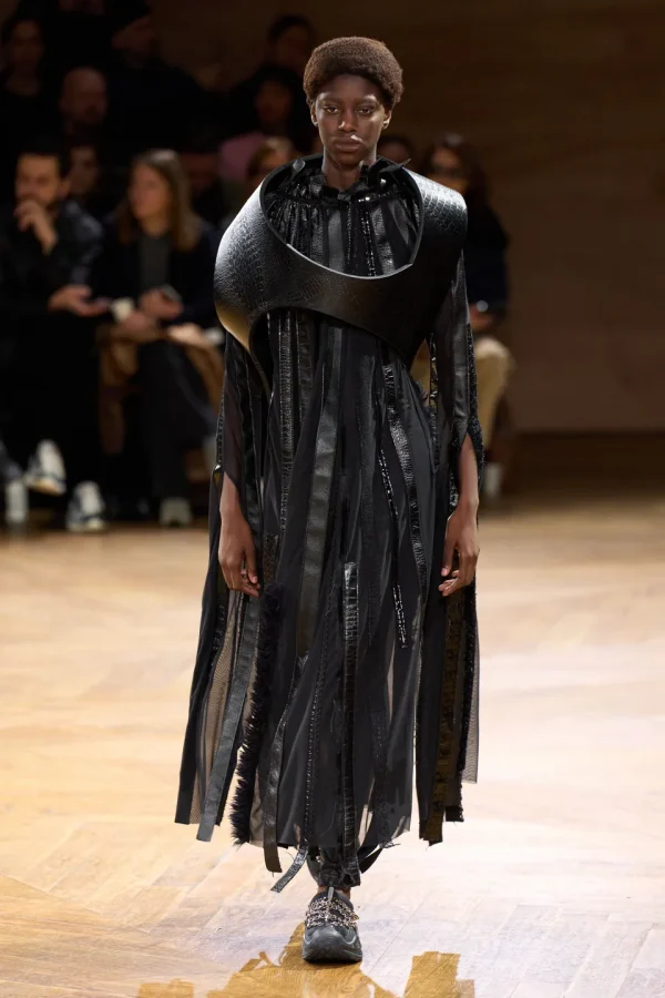 The collection features ensembles that juxtapose traditional clothing with abstract shapes and structures, blurring the lines between fashion and art. Triangular prisms, intersecting shapes, and knotted clusters of black panelling transform garments into wearable sculptures, challenging the idea of clothing as merely functional.