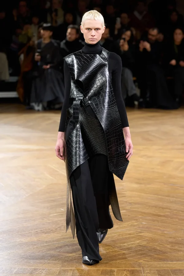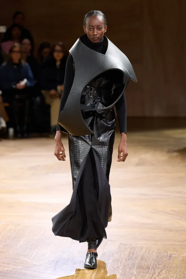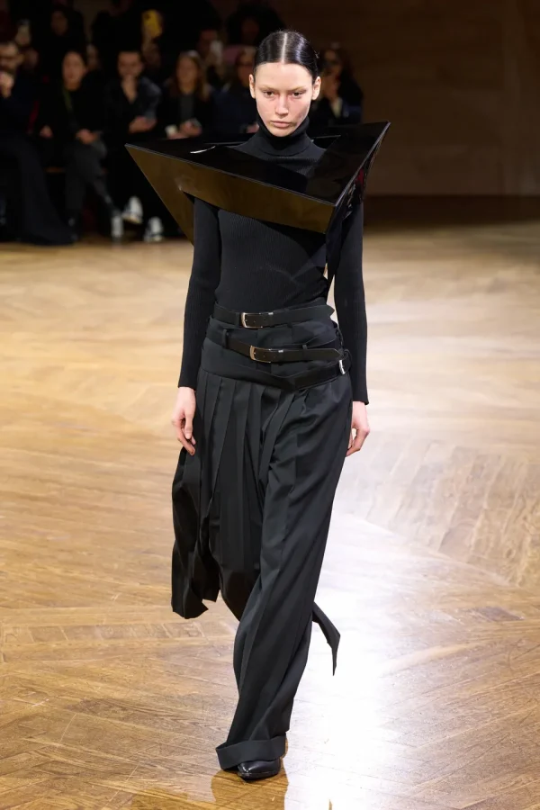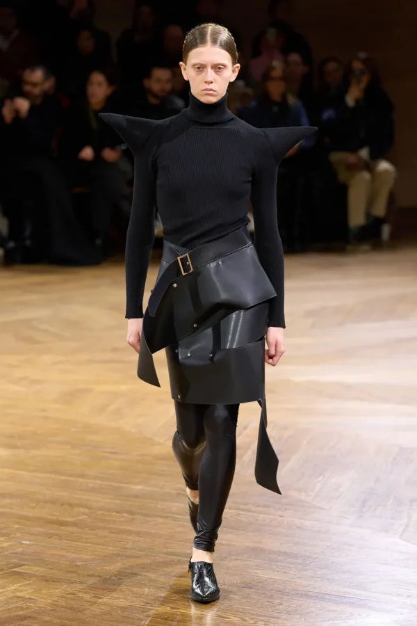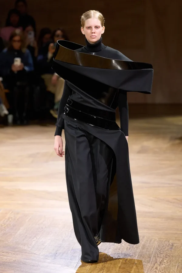 One of the most striking aspects of the collection is the use of all-black outfits, highlighting the sculptural elements of the designs. Woolen topcoats, knitwear layers, and pants catch the light, creating a dynamic interplay between form and texture. The incorporation of belts and straps adds to the sculptural quality, emphasizing the structural integrity of the garments.