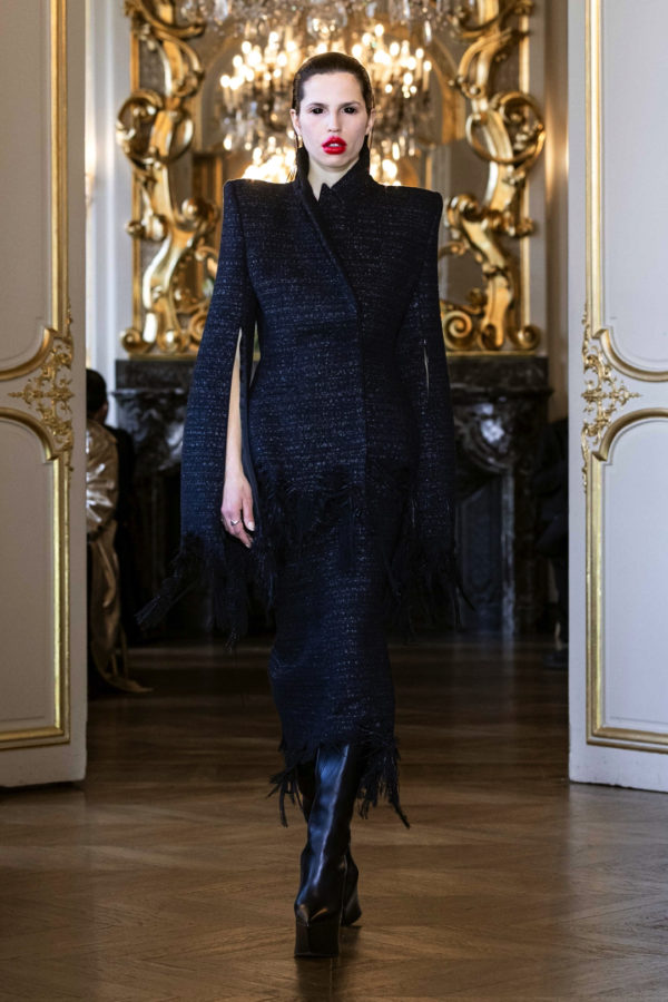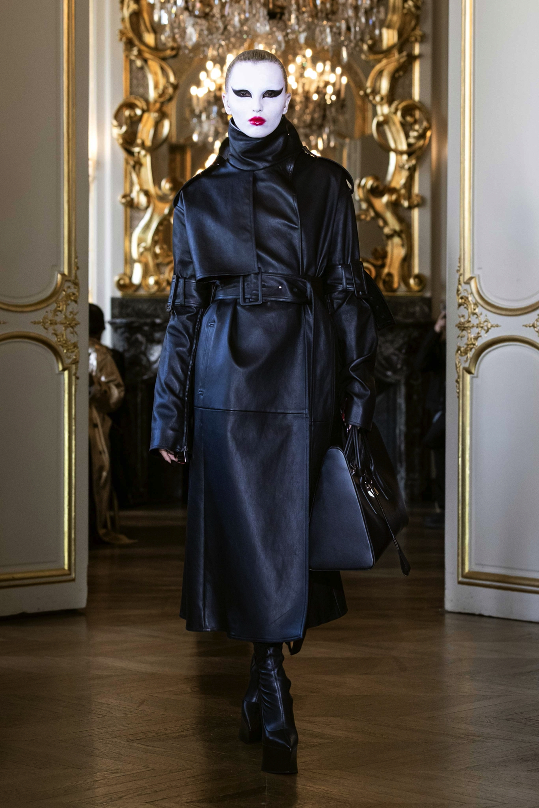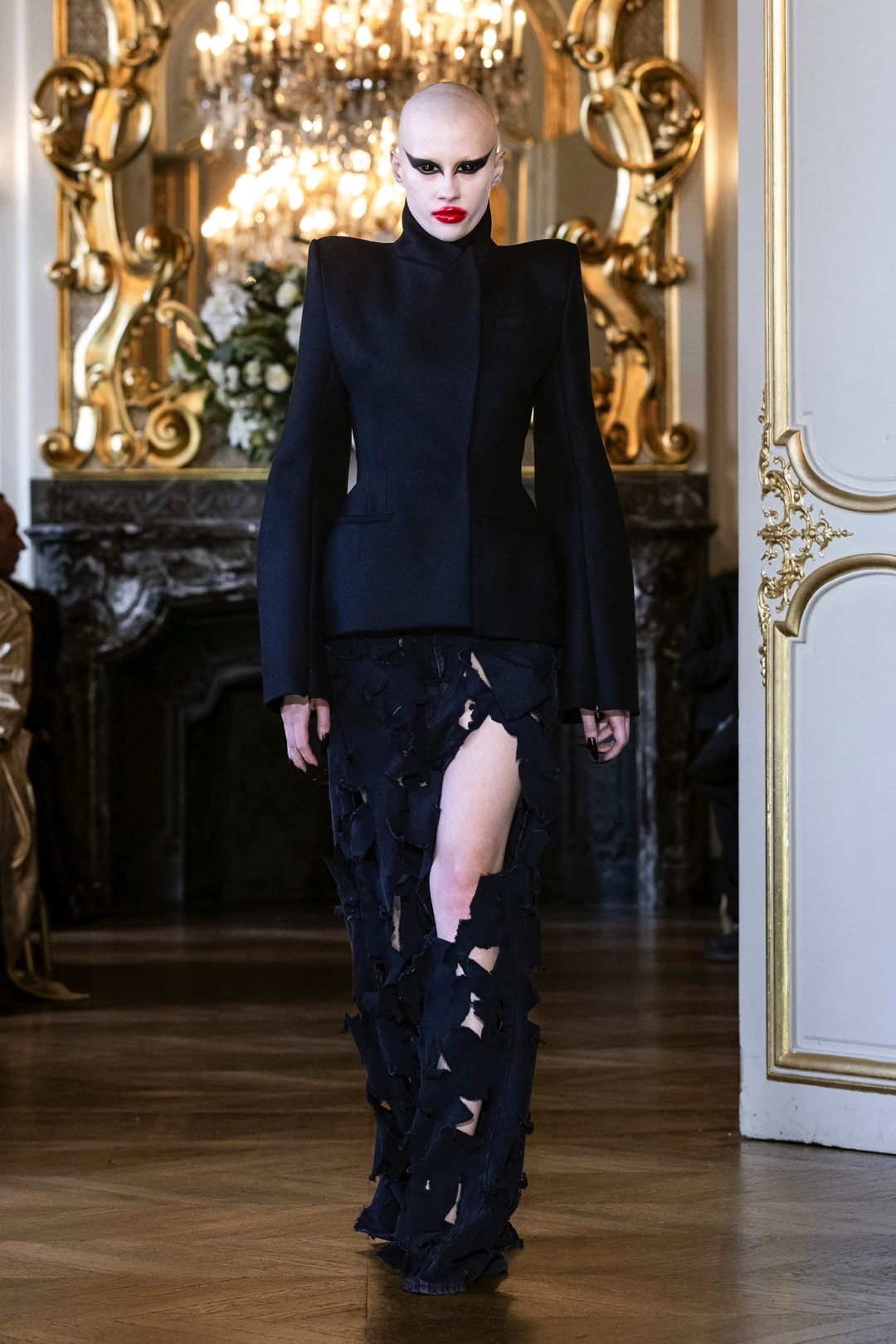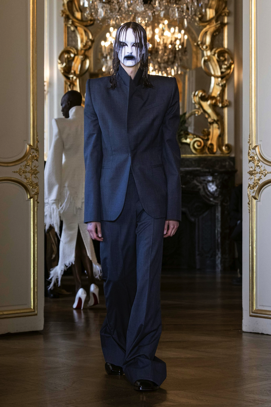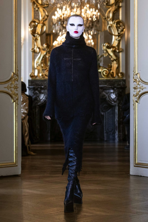The show opened with sculptural black tailoring, strong shoulders, architectural silhouettes, sleeves elongated and zippered for added articulation. These were garments with a language of their own, communicating through structure and restraint. The collection’s knitwear, raw-edged and spectral, carried the texture of something unearthed, an artifact of the body rather than a covering for it. Wool bouclé suits, frayed but meticulously controlled, spoke to an aesthetic of decay, as though they had survived some unknown catastrophe.