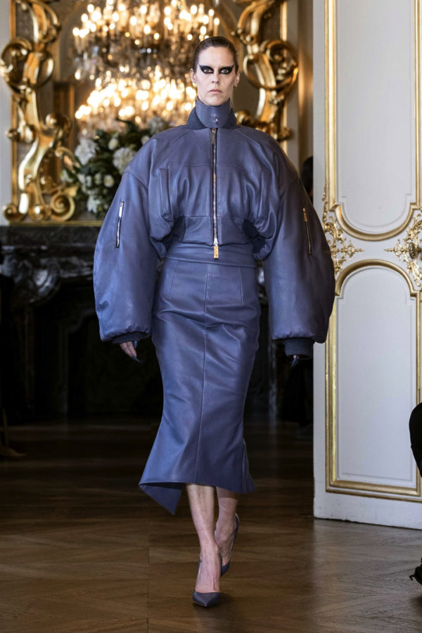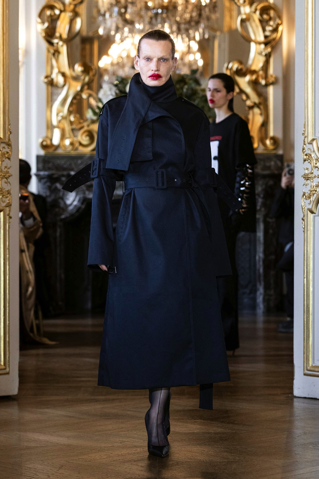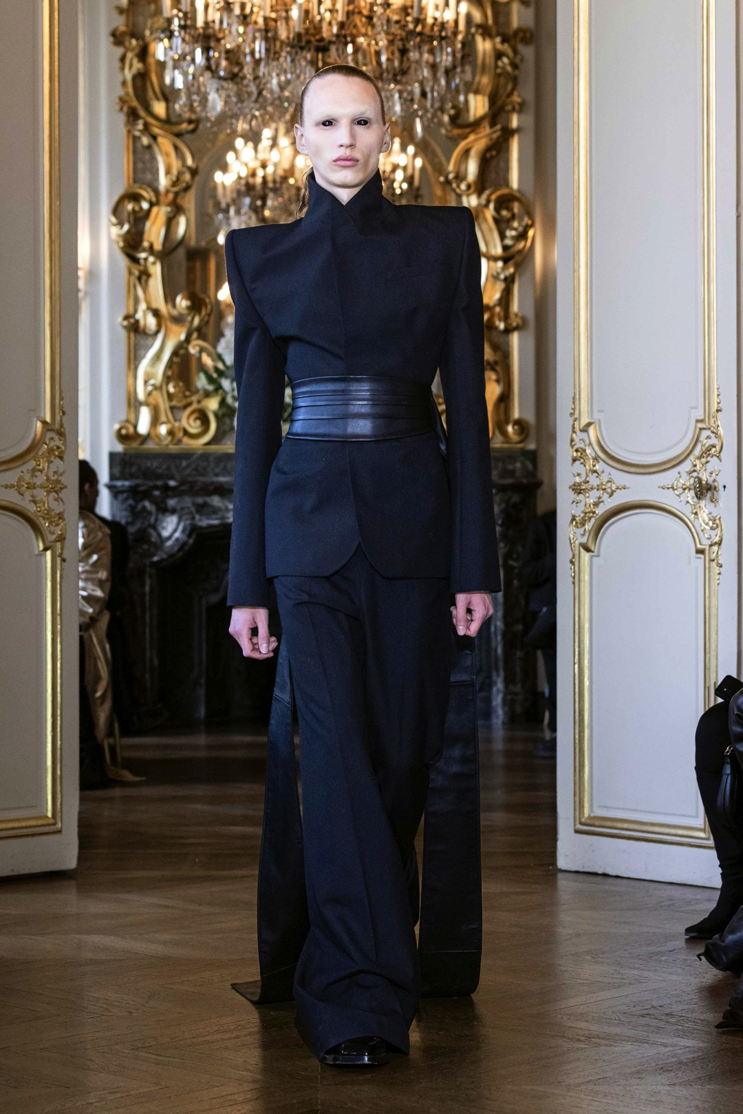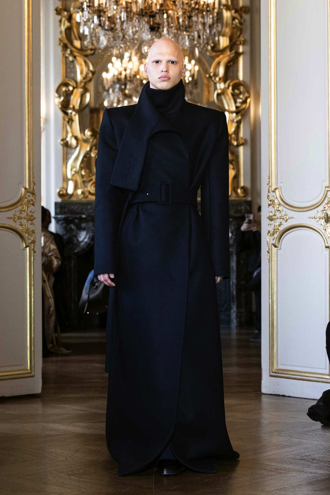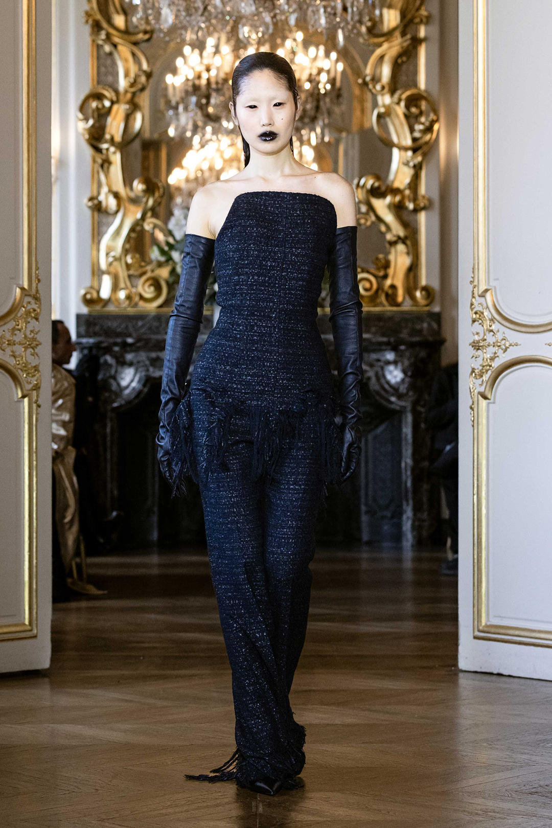 The show opened with sculptural black tailoring, strong shoulders, architectural silhouettes, sleeves elongated and zippered for added articulation. These were garments with a language of their own, communicating through structure and restraint. The collection’s knitwear, raw-edged and spectral, carried the texture of something unearthed, an artifact of the body rather than a covering for it. Wool bouclé suits, frayed but meticulously controlled, spoke to an aesthetic of decay, as though they had survived some unknown catastrophe.