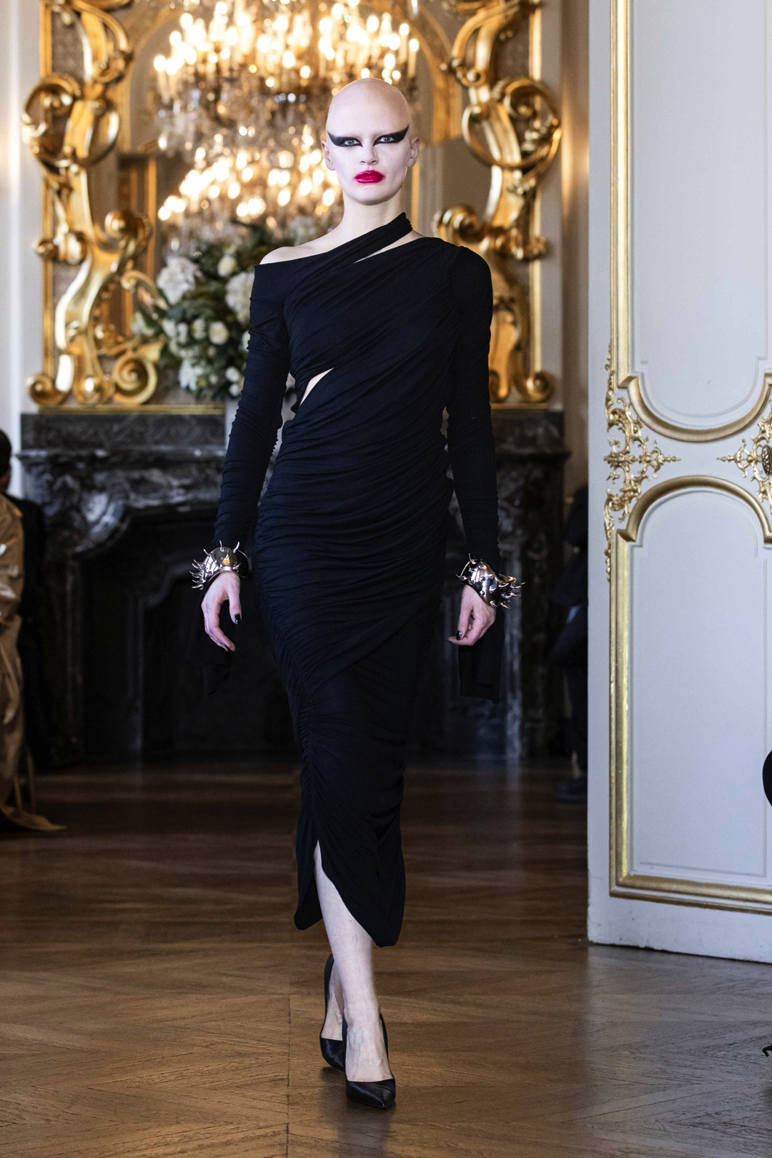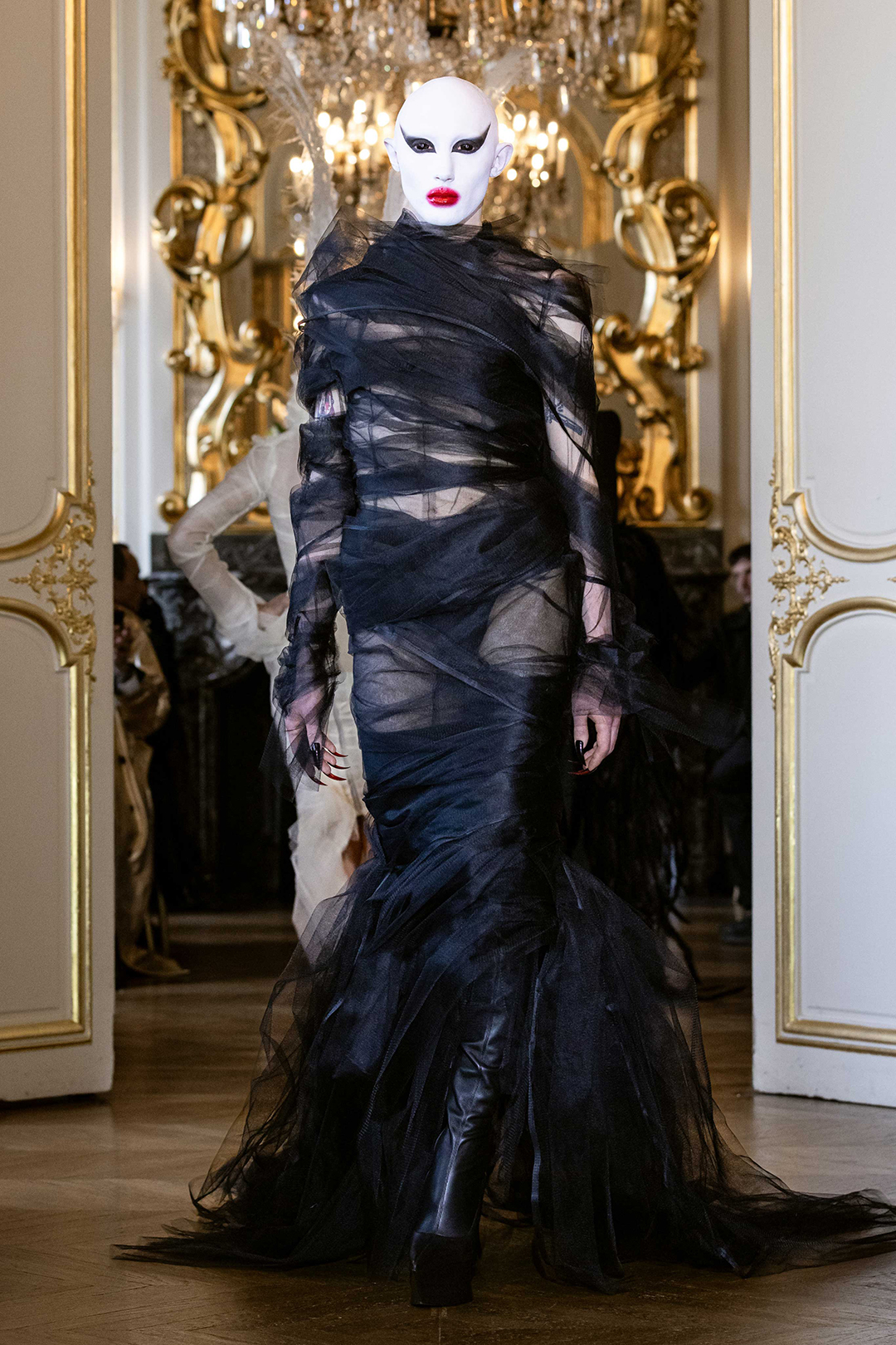 Eveningwear took a more surreal turn. Dresses with welt-like slashes across the chest suggested wounds, openings into something deeper. One gown, wrapped like a mummy in unraveling strips of fabric, evoked a body in the midst of transformation, half-restrained, half-emerging. Dalton herself closed the show in a winged spirit wedding dress, an apparition that felt less like a finale and more like a departure into another realm.