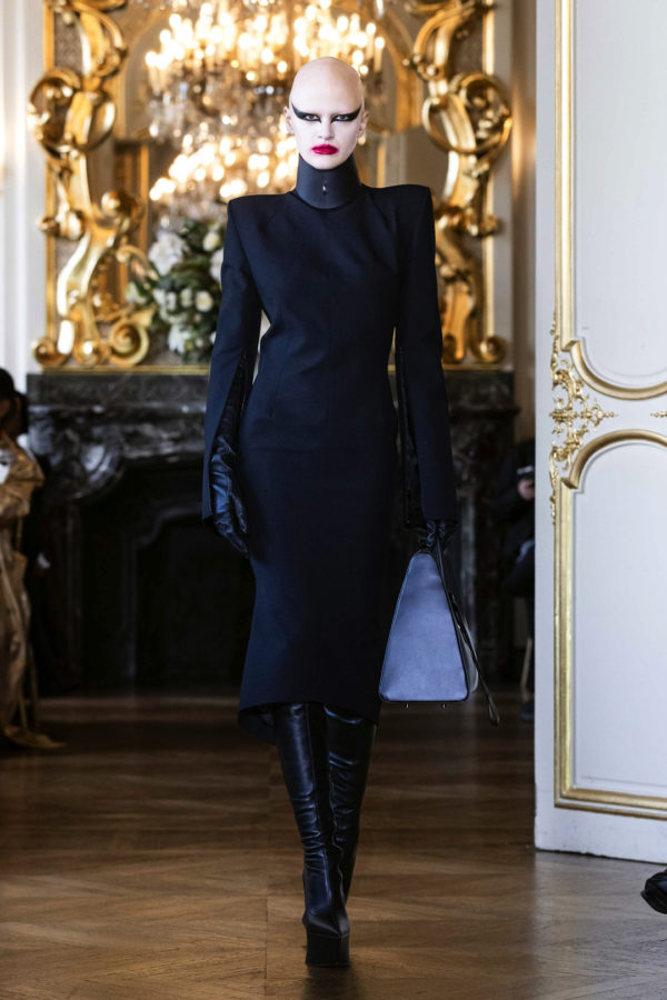 Accessories served as extensions of the body rather than mere adornments. A handbag with a sharply curved topline echoed the angularity of the tailoring, while platform shoes created in collaboration with Christian Louboutin transformed feet into sculptural relics. These were not shoes designed for walking but for existing, heightened, otherworldly, almost ceremonial.