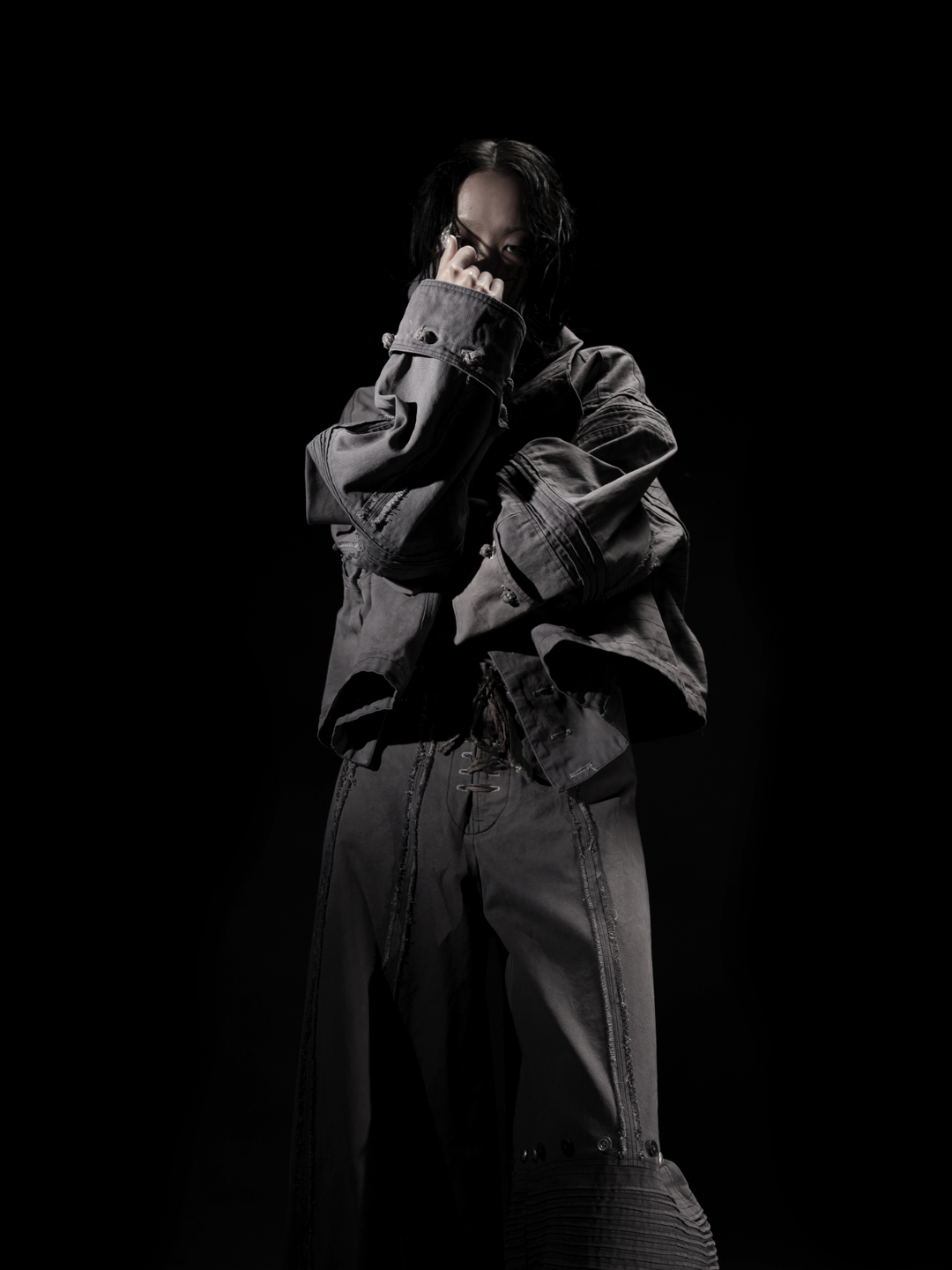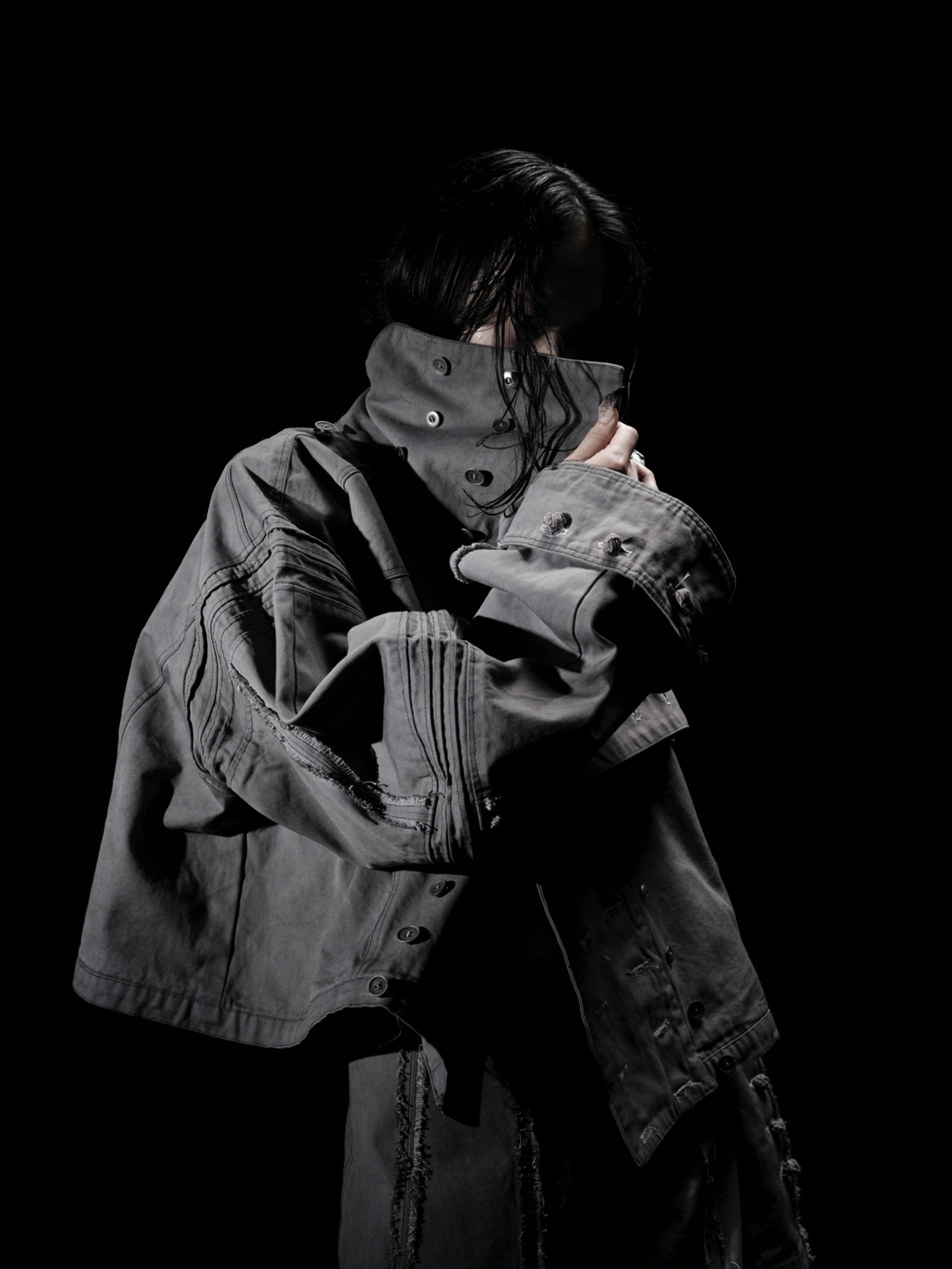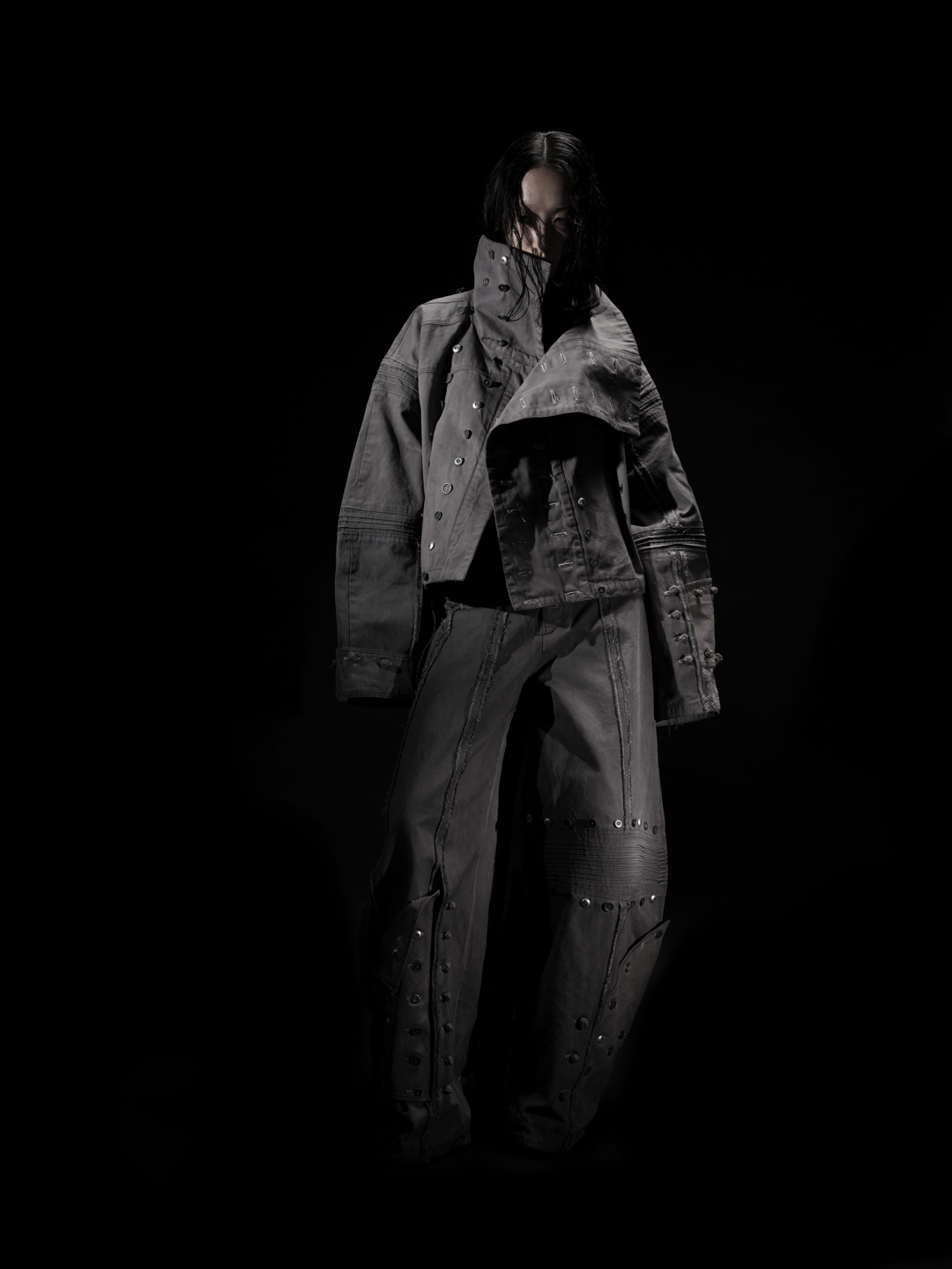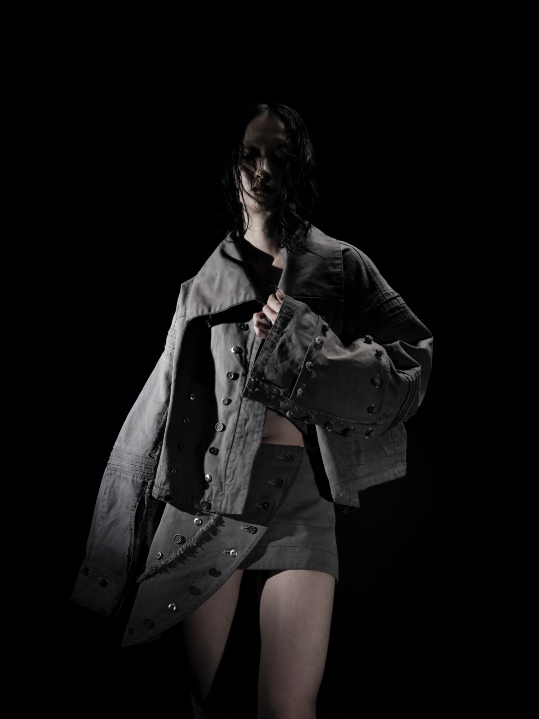 Made from cotton deadstock and naturally dyed with oak galls and iron, the woven pieces are finished with handmade buttons made from fabric waste, along with vintage metal buttons that recall the look of metal hardware on cyborgs. Lace-up closures replace zippers as a more sustainable option. Removable shields, exposed seams, adjustable ways of wearing, and pintucks explore ideas of self-augmentation and self-protection, constructing silhouettes that feel cold, fragmented, and overly engineered.