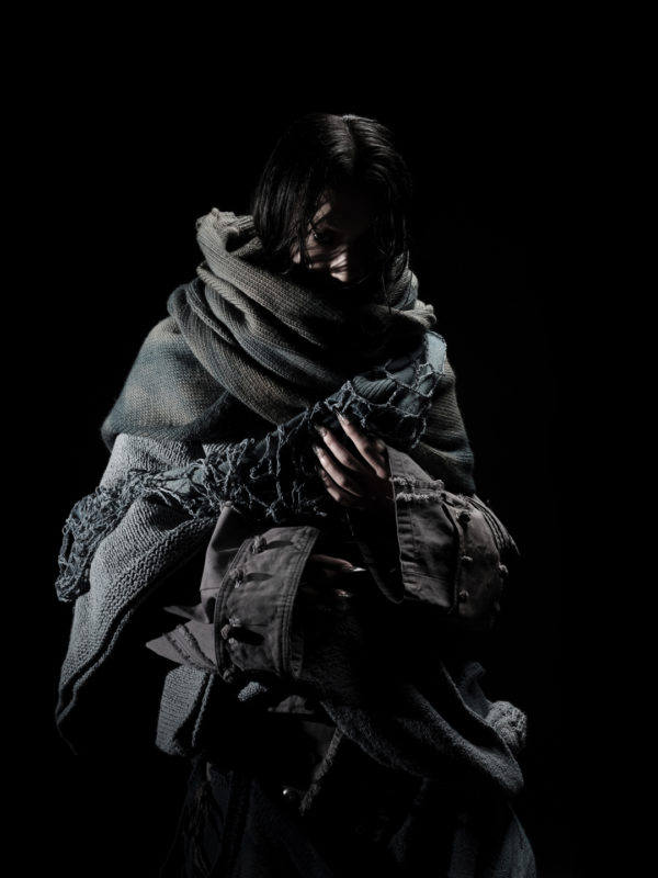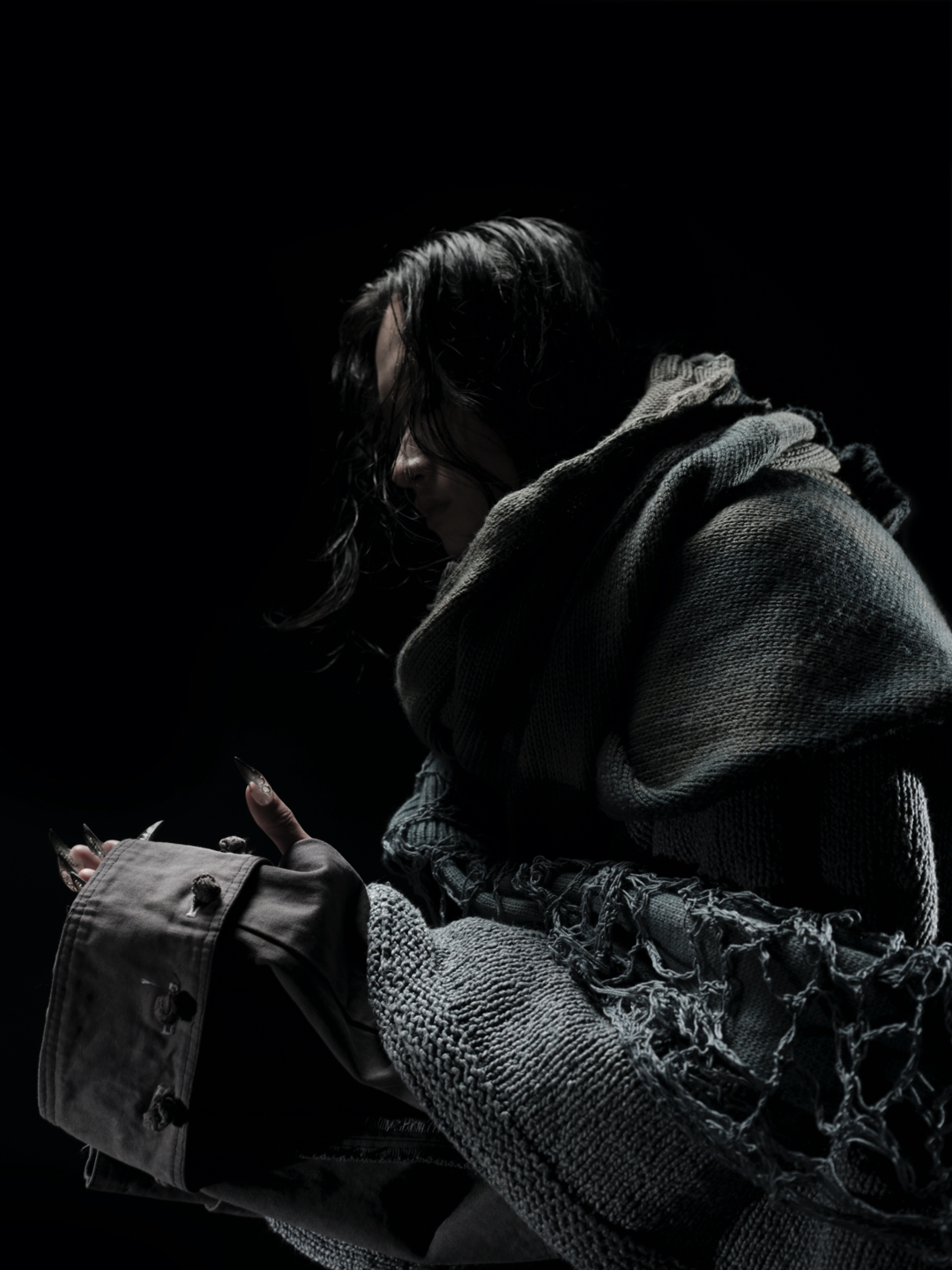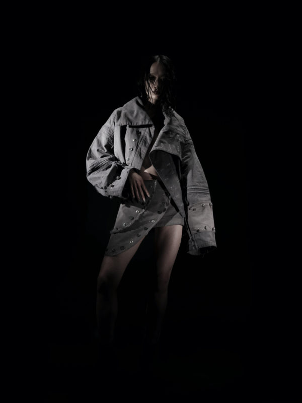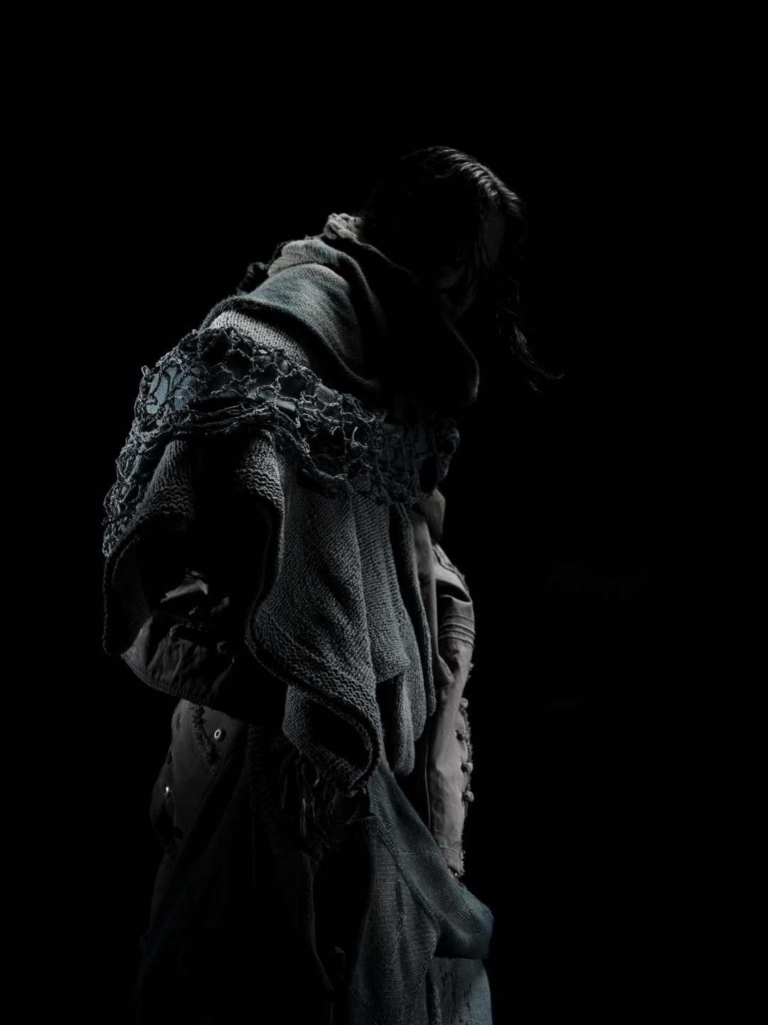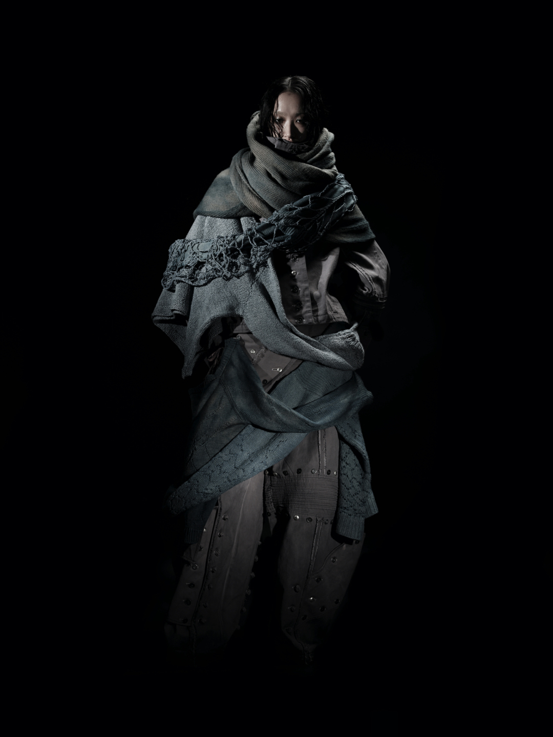 Made from cotton deadstock and naturally dyed with oak galls and iron, the woven pieces are finished with handmade buttons made from fabric waste, along with vintage metal buttons that recall the look of metal hardware on cyborgs. Lace-up closures replace zippers as a more sustainable option. Removable shields, exposed seams, adjustable ways of wearing, and pintucks explore ideas of self-augmentation and self-protection, constructing silhouettes that feel cold, fragmented, and overly engineered.
