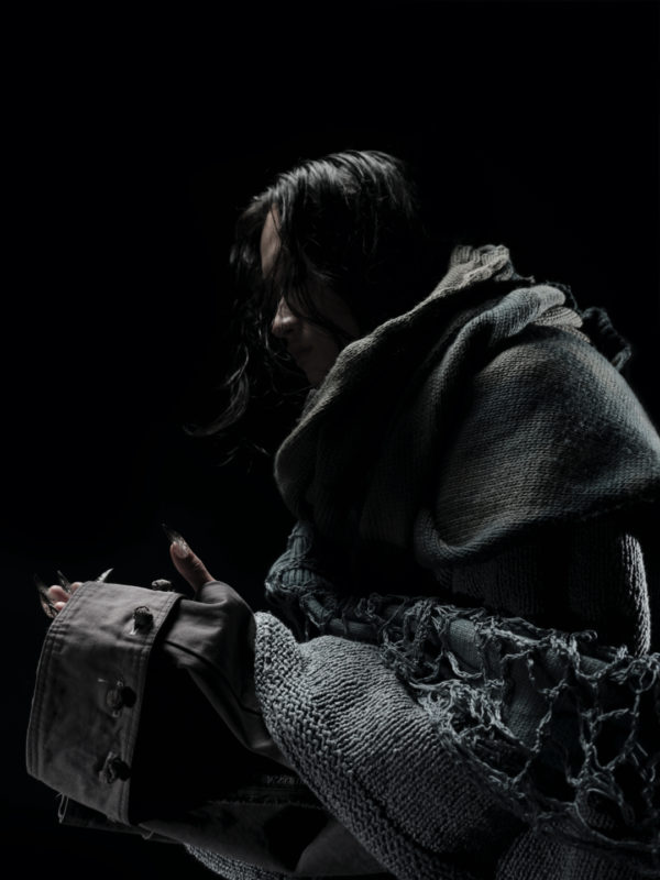 The woven garments, a jacket, skirt, and pants, draw from Lee Bul’s cyborg series, AI-generated humanoid images, and biblical stories such as King Nebuchadnezzar and the Tower of Babel. Combined with the knits, they tell a story of transformation that occurs when humanity is neglected in pursuit of advancement.