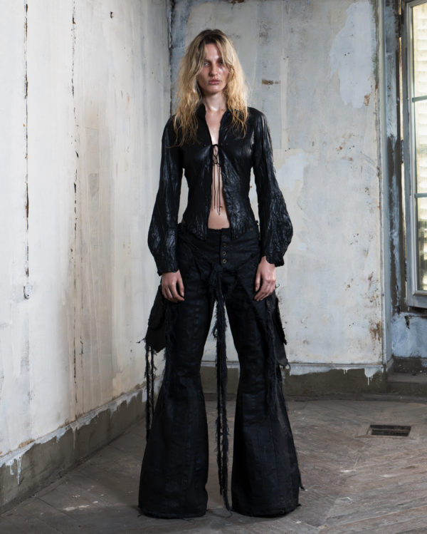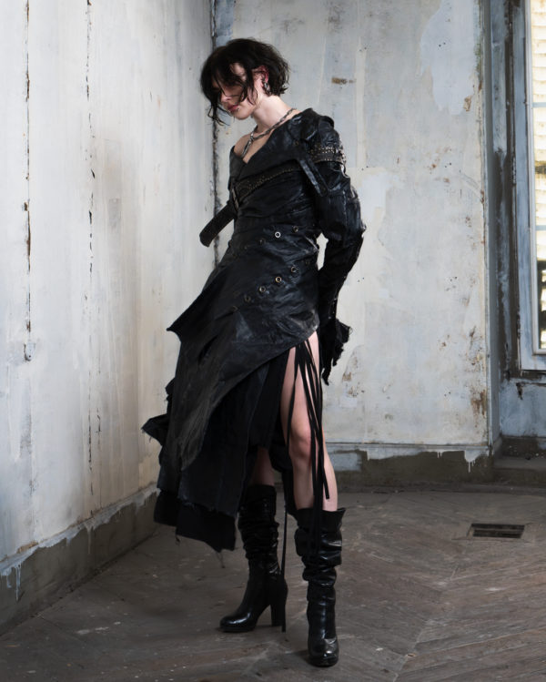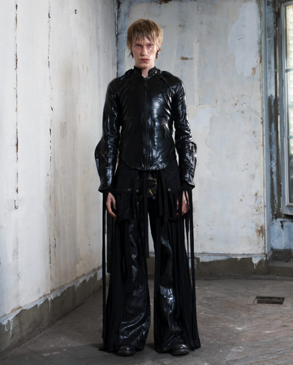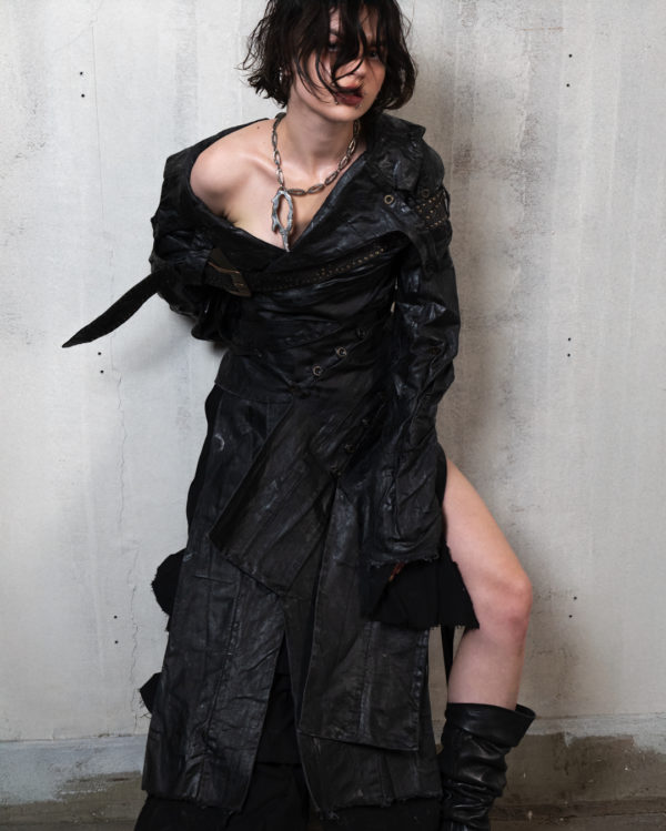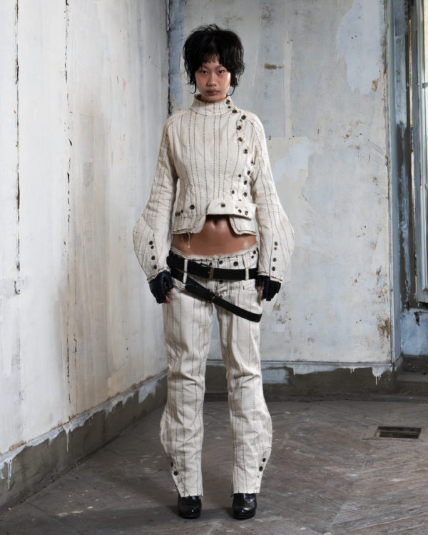 Materiality anchors “Mitosis”. Latex, leather, denim, silk, and wool interact in a dialogue between wet luster and matte restraint, reinforcing the tension between organic growth and constructed form. Brass buttons and wide belts studded with oxidized rivets accumulate across the silhouettes, multiplying until they saturate the garments. Their density functions as a mechanical suture, forming a network of fixation points that keeps the pieces in a sustained state of tension, suspended between ornamentation and structural necessity.
