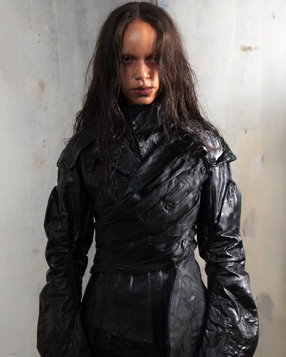 The collection is built around two silhouettes, Mother and Daughter. They function as a sartorial analogue to a mother cell generating its daughter cell. The Mother silhouette operates as an originating matrix, while the Daughter emerges as an altered and influenced replica. Across both, mutation becomes a design principle. Some garments appear caught mid-movement, with fabrics wrapped around the body as though suspended within a sudden atmospheric rupture. Others are marked by brown sutures that cross the surface like regenerative seams, evoking the slow repair of living tissue.