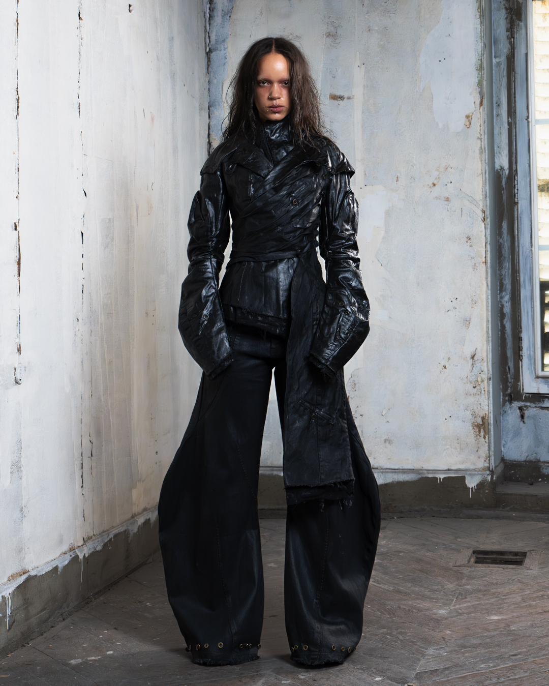 Materiality anchors “Mitosis”. Latex, leather, denim, silk, and wool interact in a dialogue between wet luster and matte restraint, reinforcing the tension between organic growth and constructed form. Brass buttons and wide belts studded with oxidized rivets accumulate across the silhouettes, multiplying until they saturate the garments. Their density functions as a mechanical suture, forming a network of fixation points that keeps the pieces in a sustained state of tension, suspended between ornamentation and structural necessity.